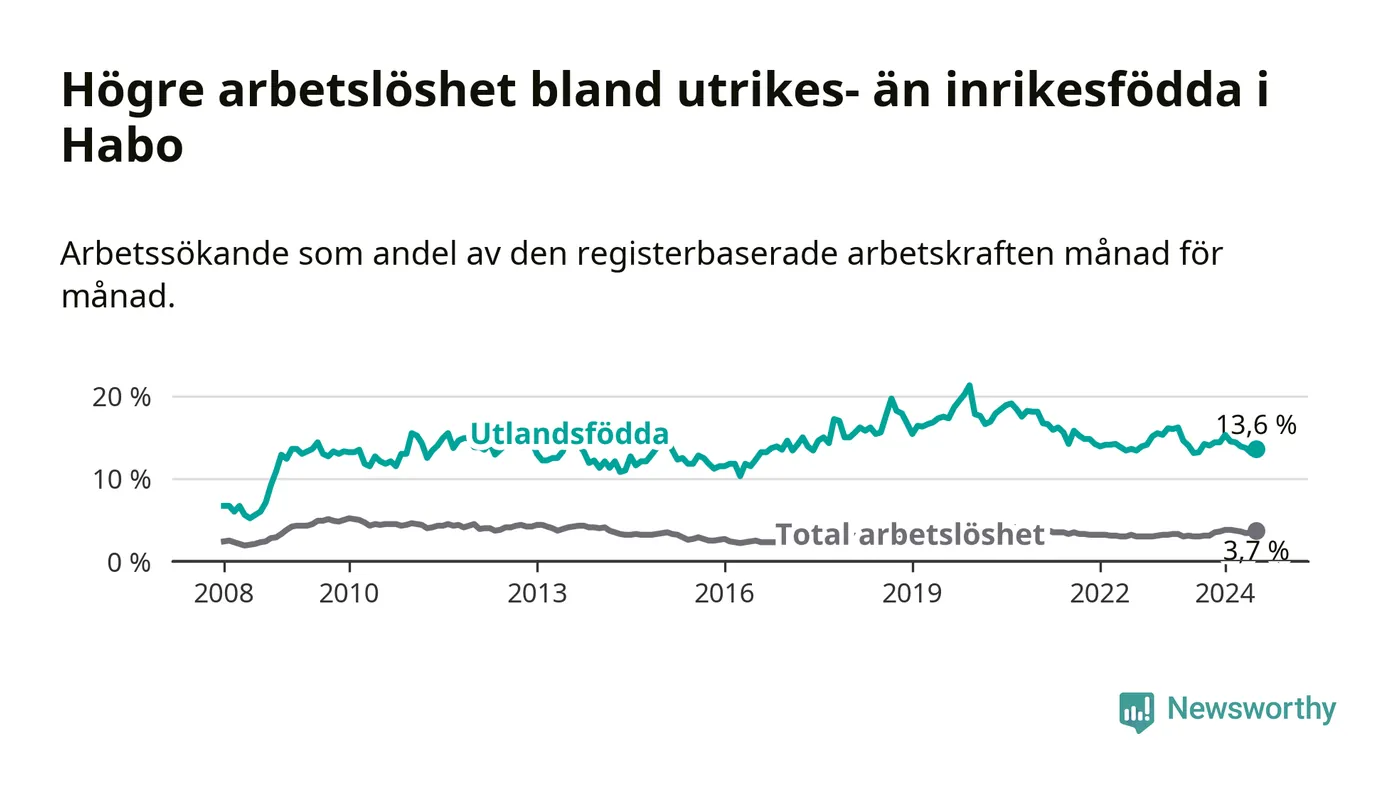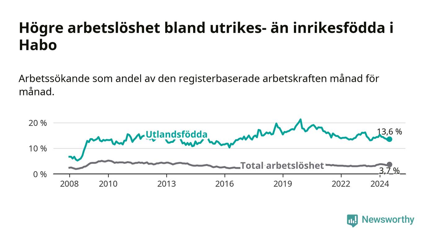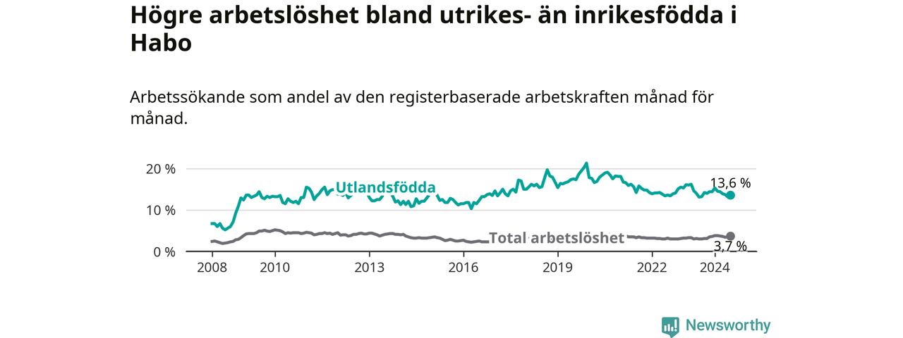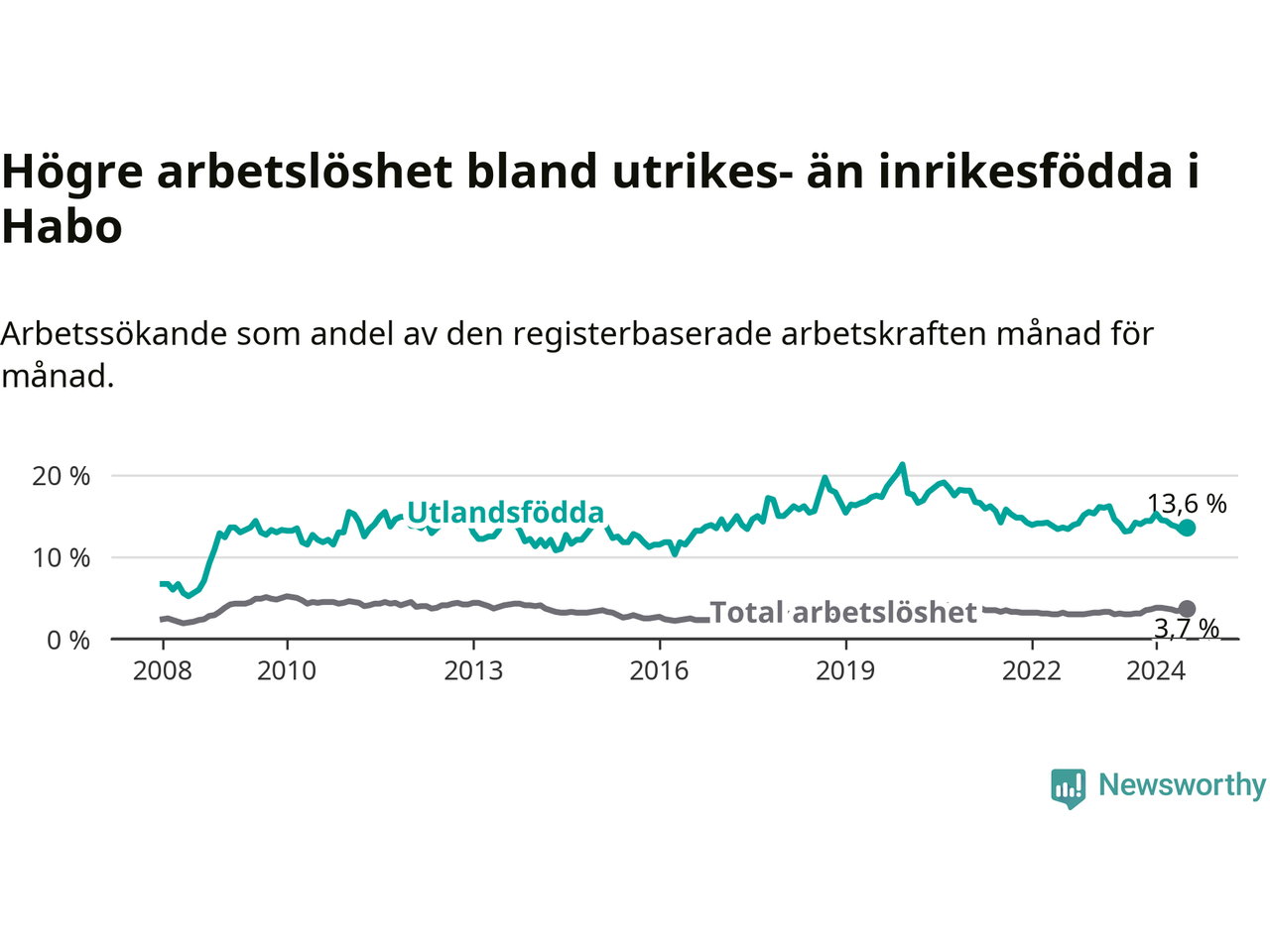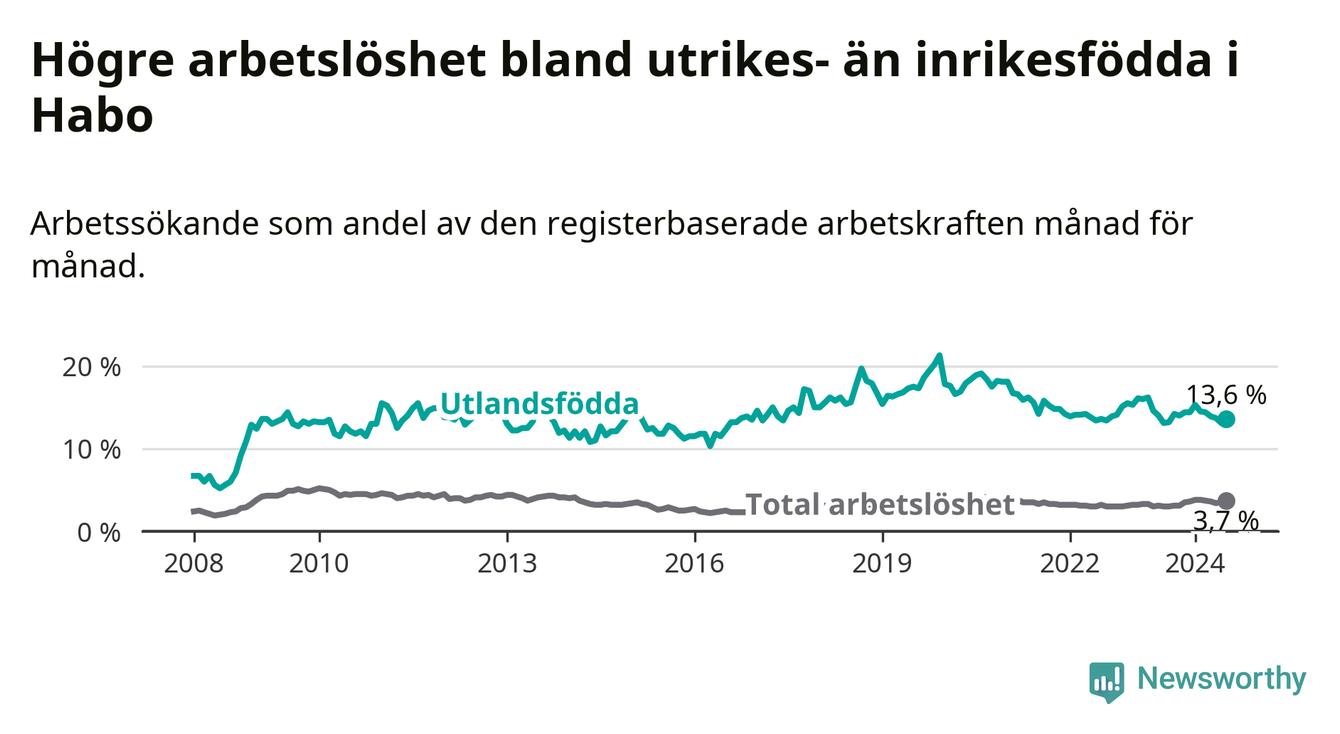Arbetslösheten bland utlandsfödda var 13,6 procent i Habo under juli månad, motsvarande 93 av 684 personer. Det är 0,5 procentenheter fler än vid samma tidpunkt i fjol (−95 om man räknar personer). Den senaste månadens uppgång innebär ett trendbrott. Under de fem föregående månaderna hade arbetslösheten bland utlandsfödda varit lägre än motsvarande tidpunkt året innan.