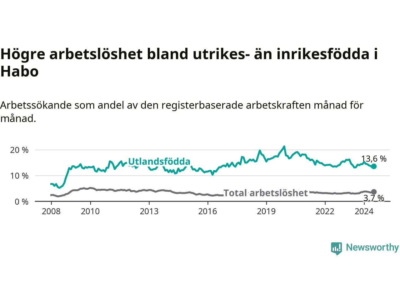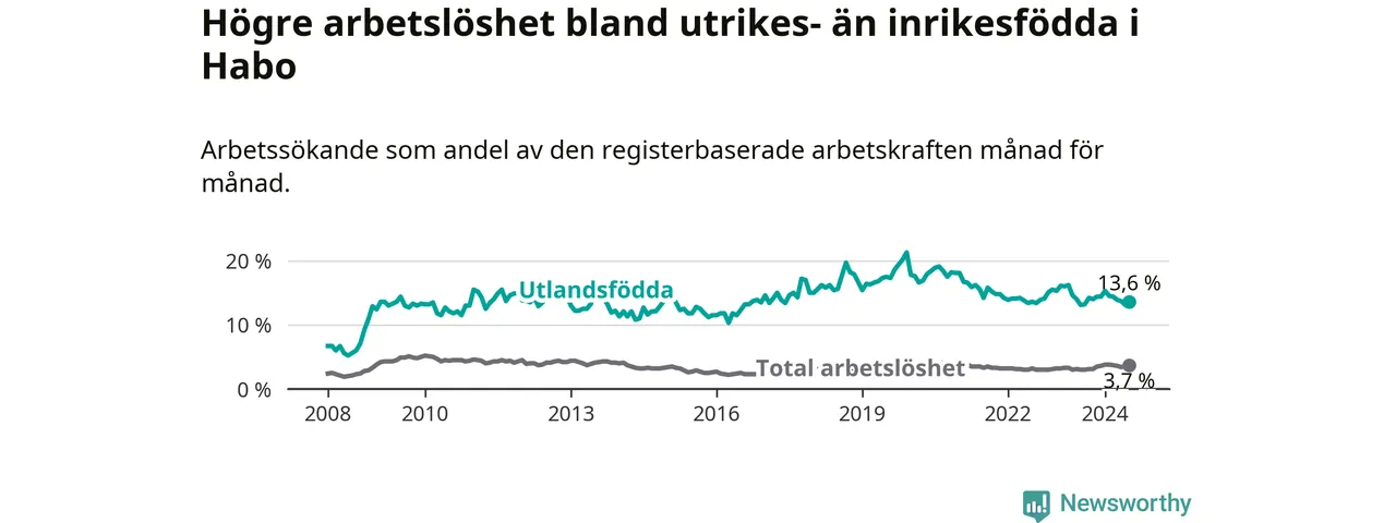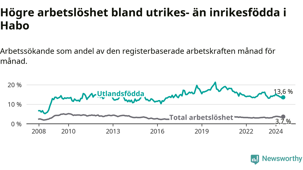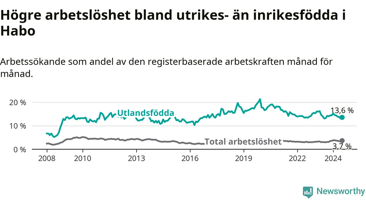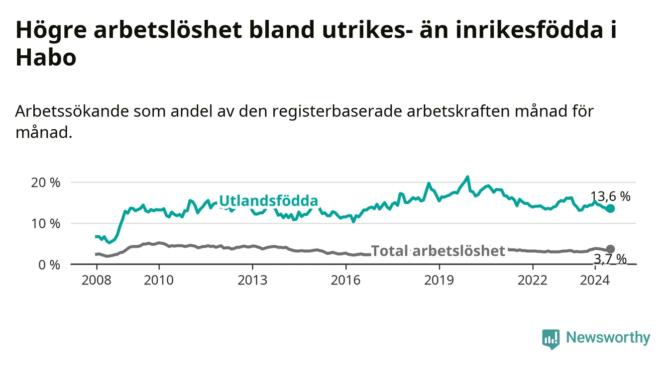 Arbetslösheten bland utlandsfödda var 13,6 procent i Habo under juli månad, motsvarande 93 av 684 personer. Det är 0,5 procentenheter fler än vid samma tidpunkt i fjol (−95 om man räknar personer). Den senaste månadens uppgång innebär ett trendbrott. Under de fem föregående månaderna hade arbetslösheten bland utlandsfödda varit lägre än motsvarande tidpunkt året innan.