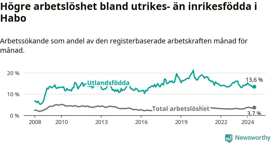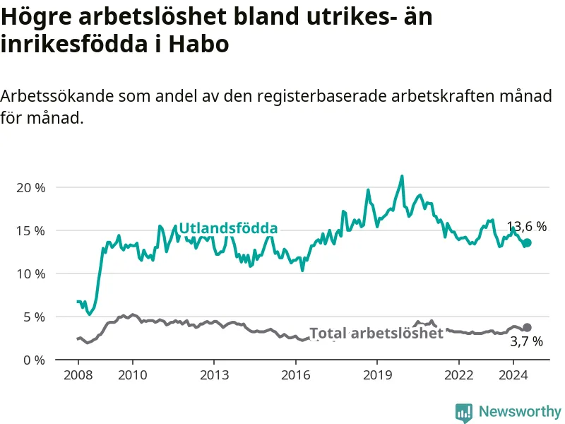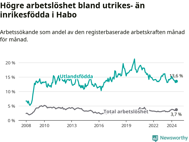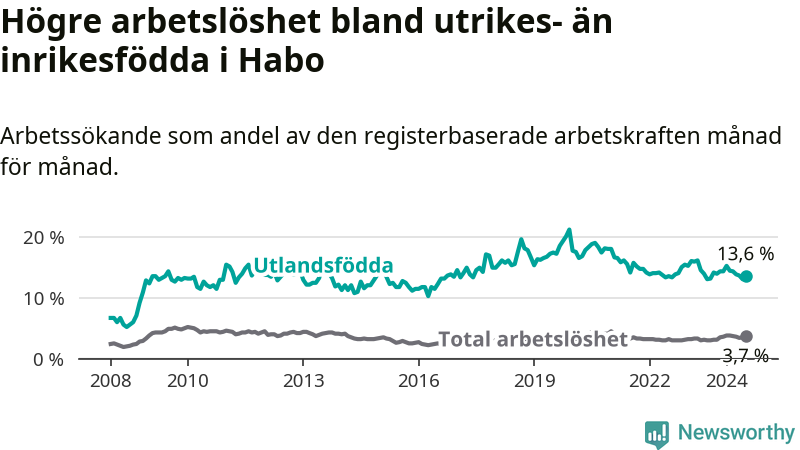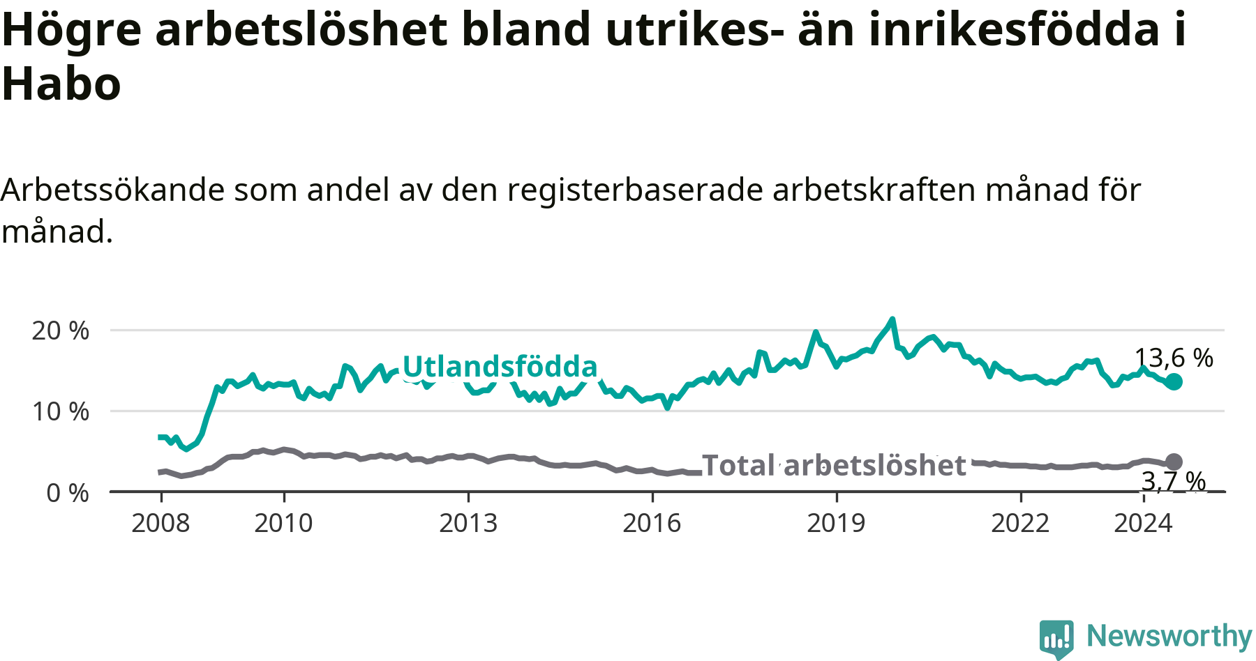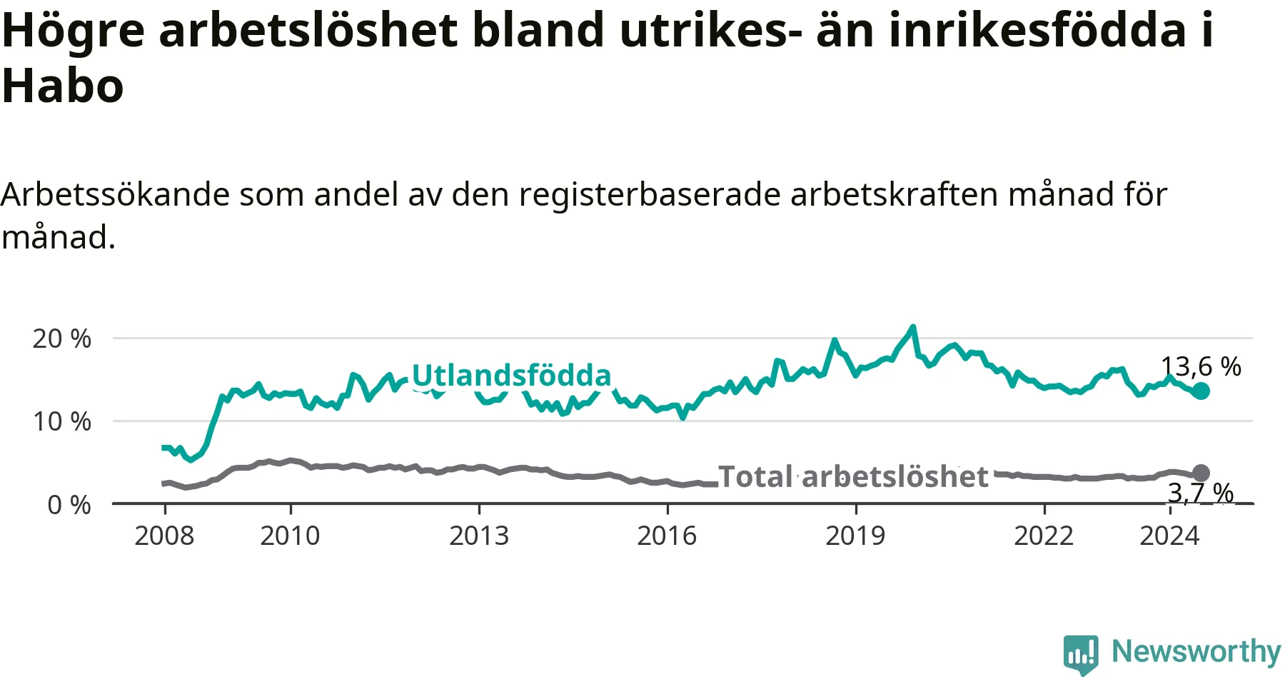 Arbetslösheten bland utlandsfödda var 13,6 procent i Habo under juli månad, motsvarande 93 av 684 personer. Det är 0,5 procentenheter fler än vid samma tidpunkt i fjol (−95 om man räknar personer). Den senaste månadens uppgång innebär ett trendbrott. Under de fem föregående månaderna hade arbetslösheten bland utlandsfödda varit lägre än motsvarande tidpunkt året innan.