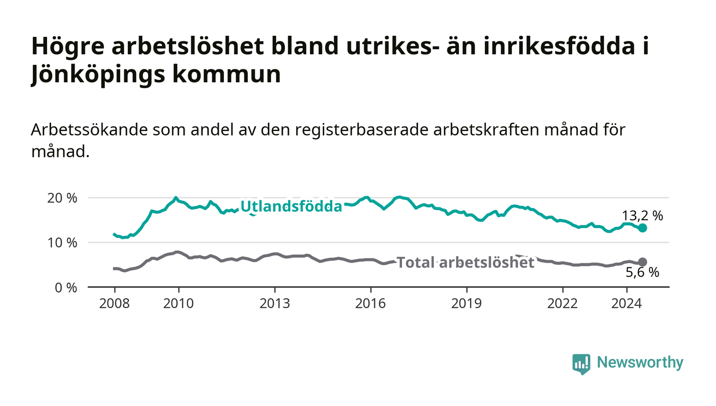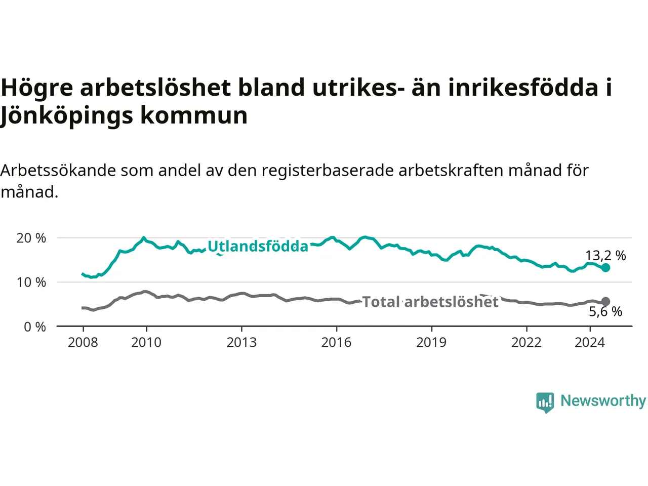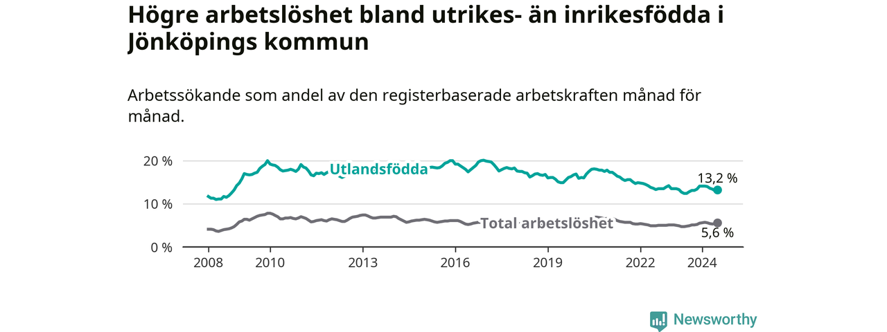 Arbetslösheten bland utlandsfödda var 13,2 procent i Jönköping under juli månad, motsvarande 2 373 av 17 977 personer. Det är 0,8 procentenheter fler än vid samma tidpunkt i fjol (−1 178 om man räknar personer). Därmed är de utlandsföddas arbetslöshet högre än vid samma tidpunkt i fjol för sjunde månaden i följd.