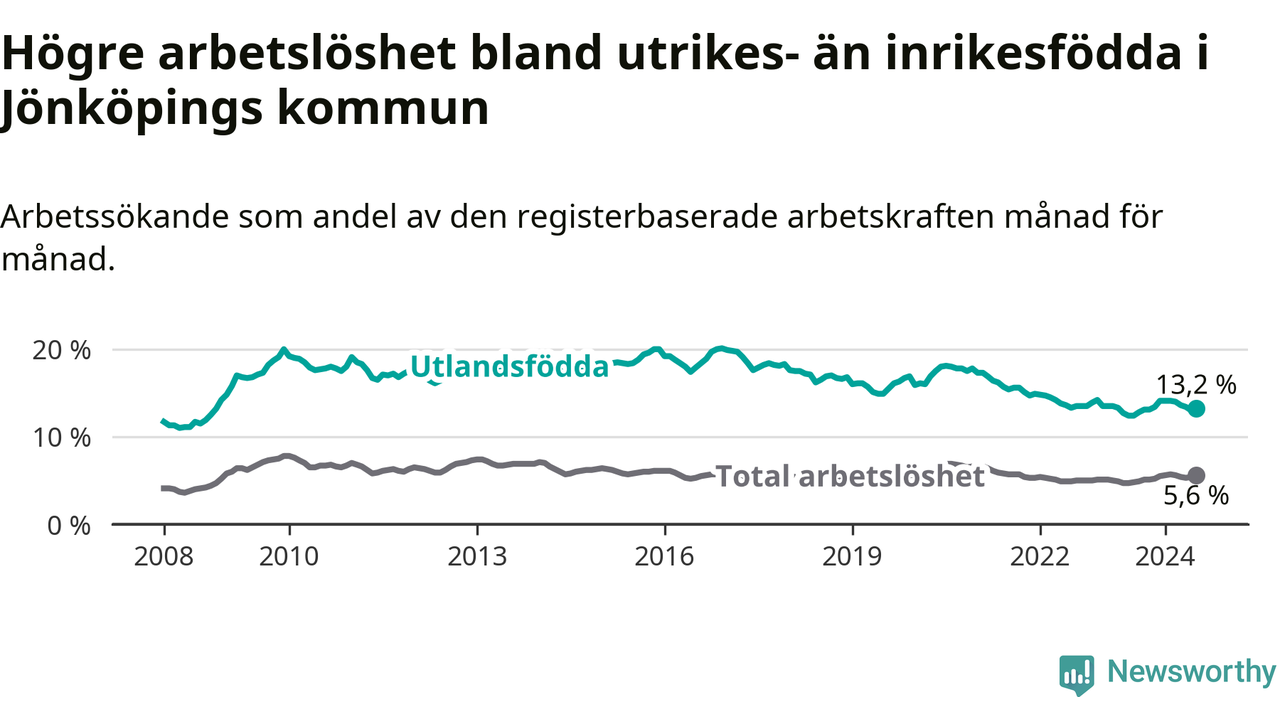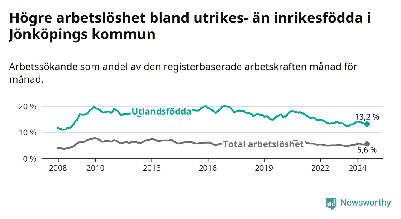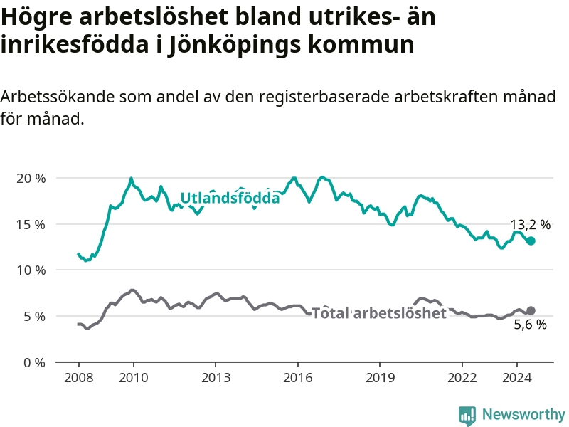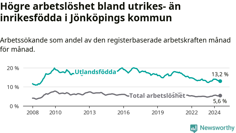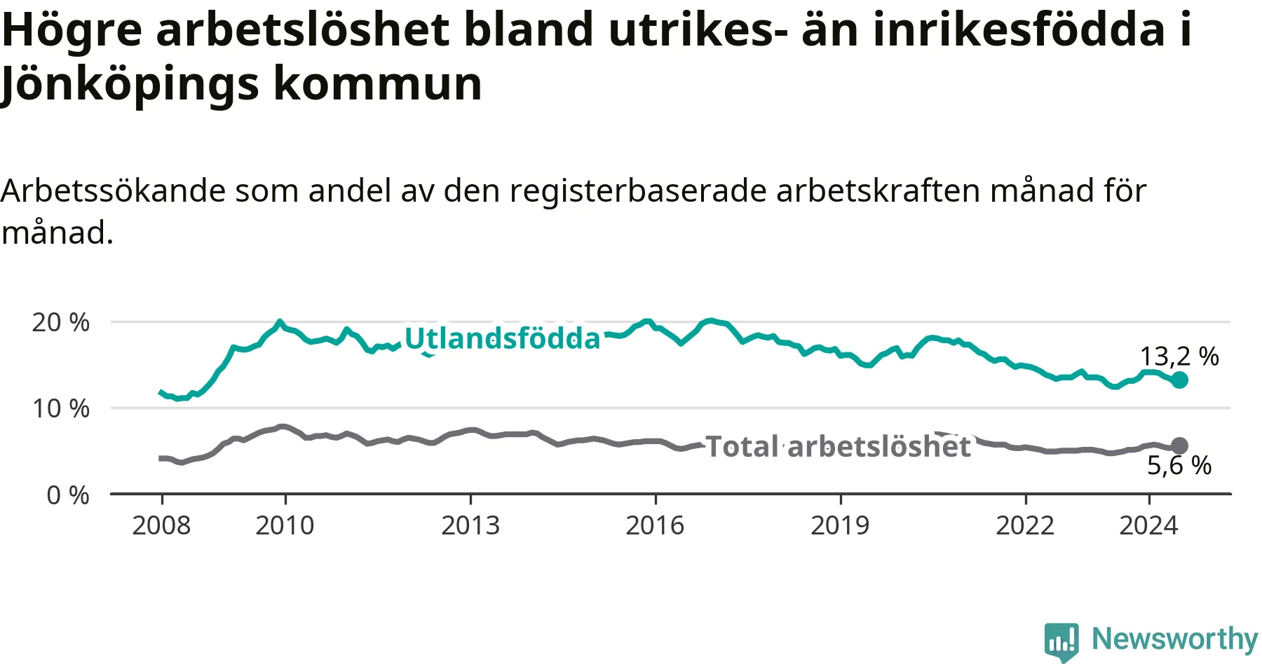 Arbetslösheten bland utlandsfödda var 13,2 procent i Jönköping under juli månad, motsvarande 2 373 av 17 977 personer. Det är 0,8 procentenheter fler än vid samma tidpunkt i fjol (−1 178 om man räknar personer). Därmed är de utlandsföddas arbetslöshet högre än vid samma tidpunkt i fjol för sjunde månaden i följd.