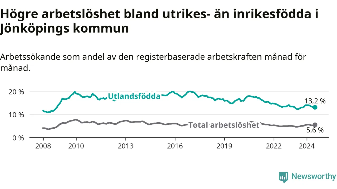 Skillnaden i arbetslöshet mellan utrikesfödda och hela befolkningen är 7,6 procentenheter i Jönköping. Det är ungefär samma skillnad som för ett år sedan.