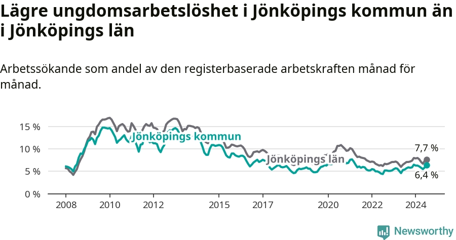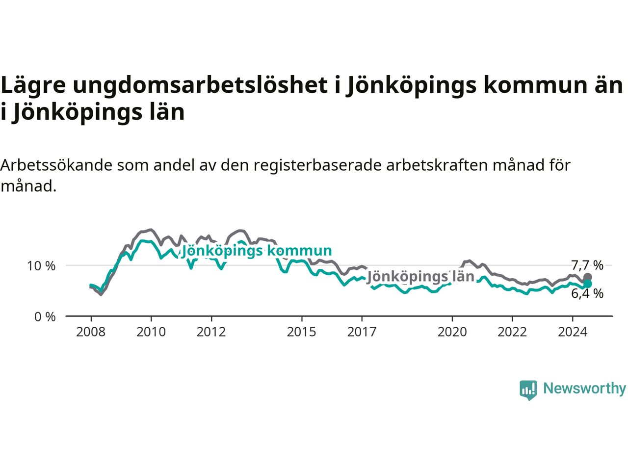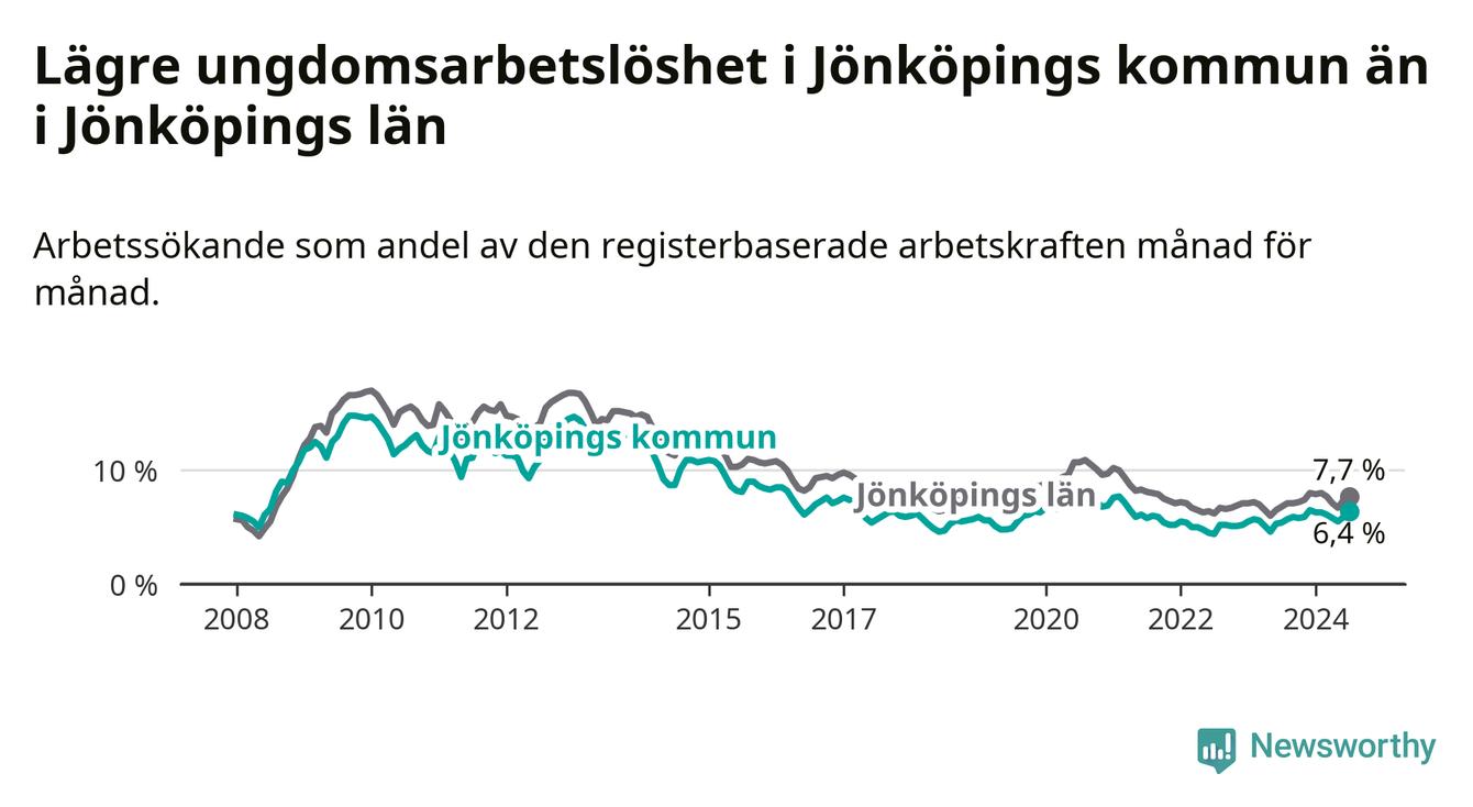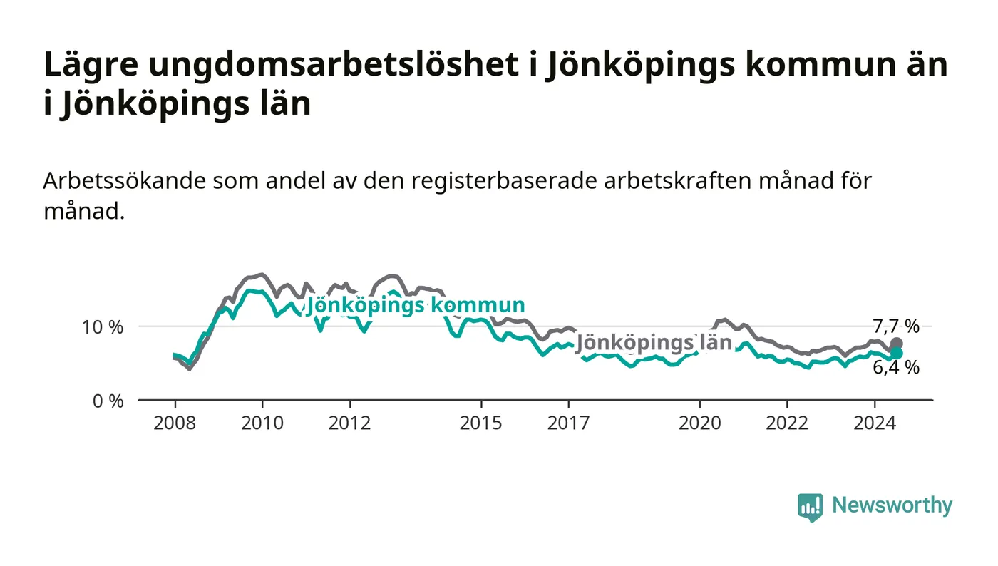 Precis som den totala arbetslösheten ligger ungdomsarbetslösheten i Jönköping lägre än i Jönköpings län som helhet. Skillnaden mellan kommunen och länet är 1,3 procentenheter.