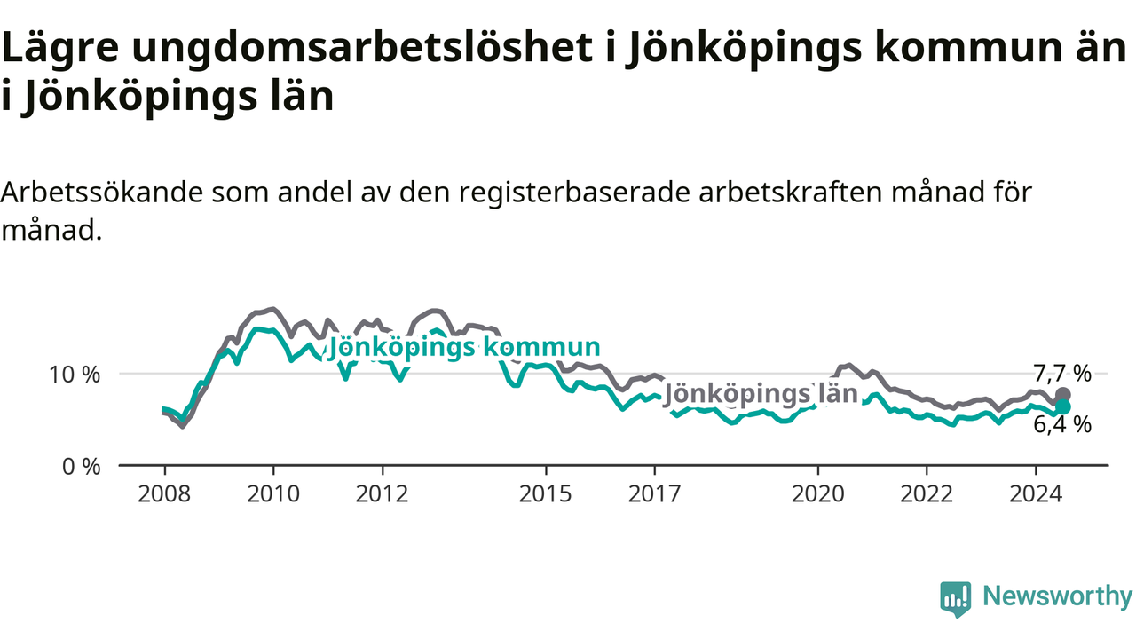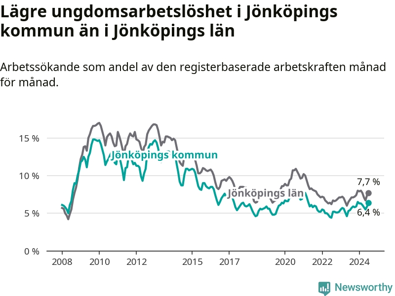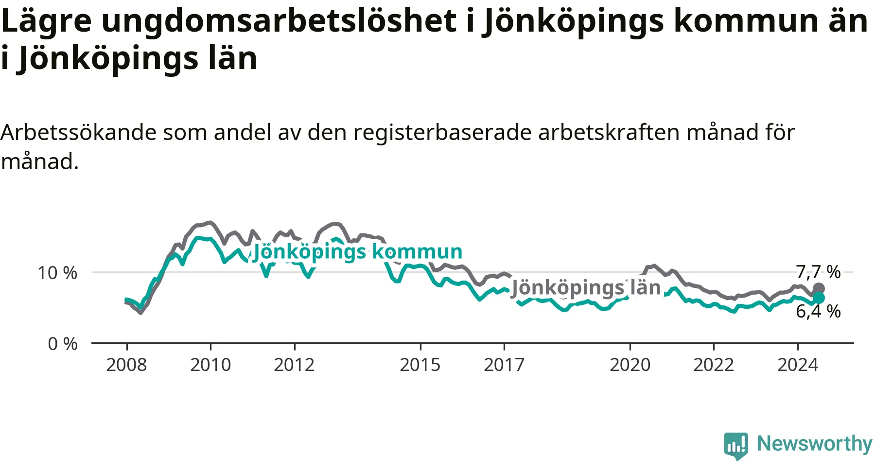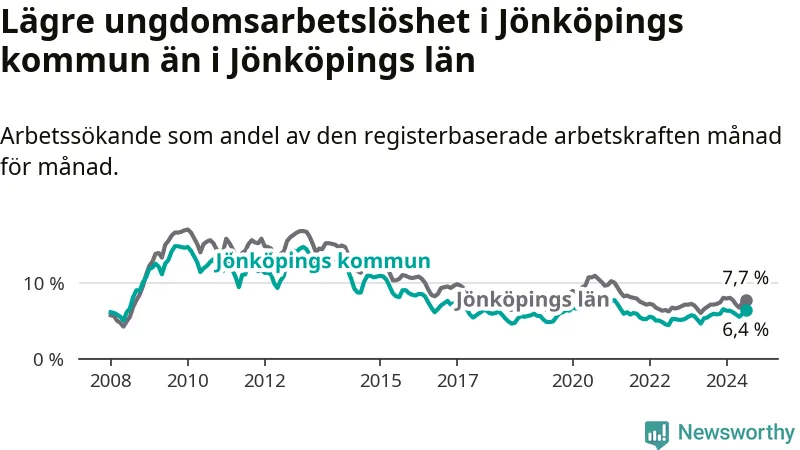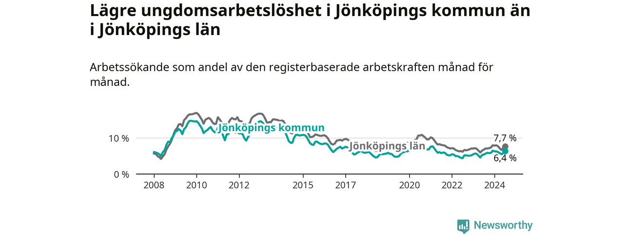 Precis som den totala arbetslösheten ligger ungdomsarbetslösheten i Jönköping lägre än i Jönköpings län som helhet. Skillnaden mellan kommunen och länet är 1,3 procentenheter.