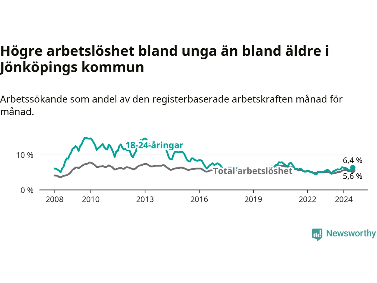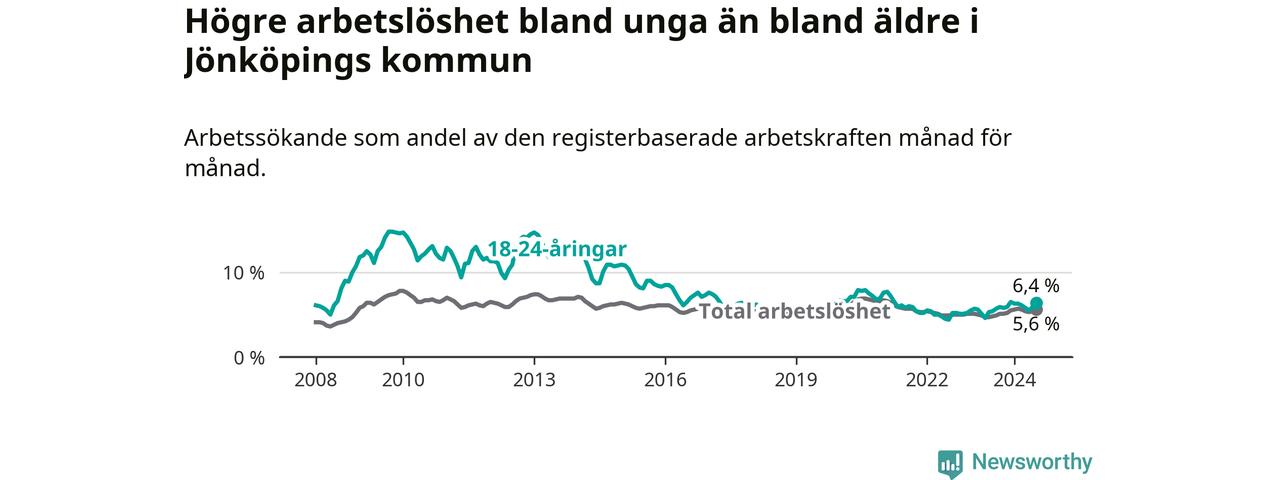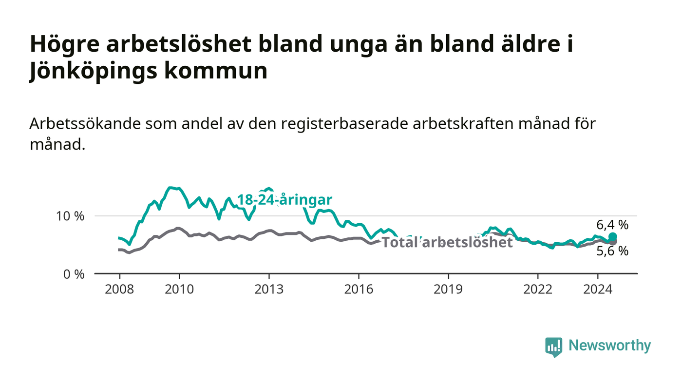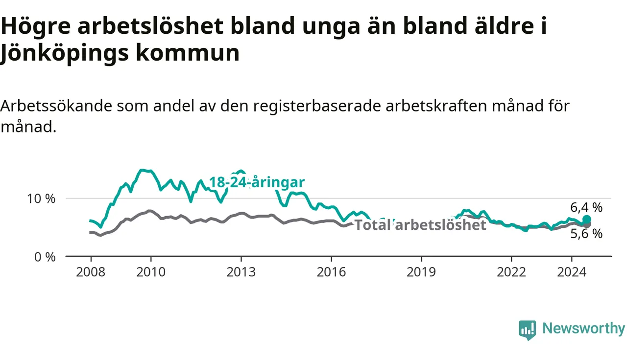 I och med den senaste månadens uppgång har de ungas arbetslöshet i Jönköping stigit 14 månader i följd (upp från 4,6 procent i maj 2023 till 6,4 procent nu).