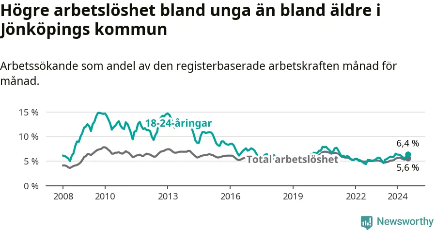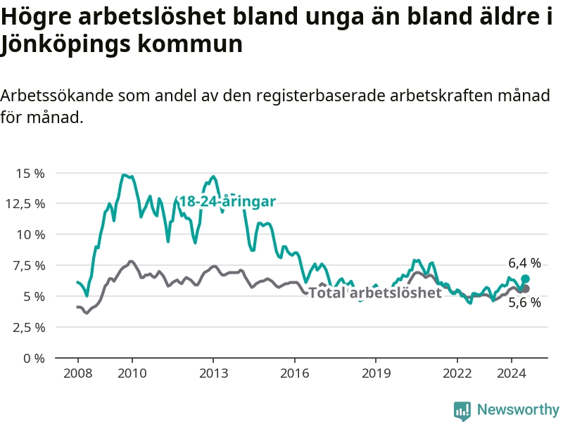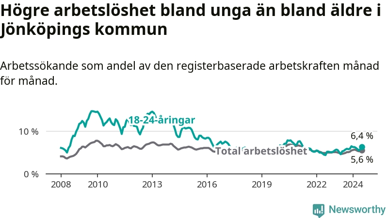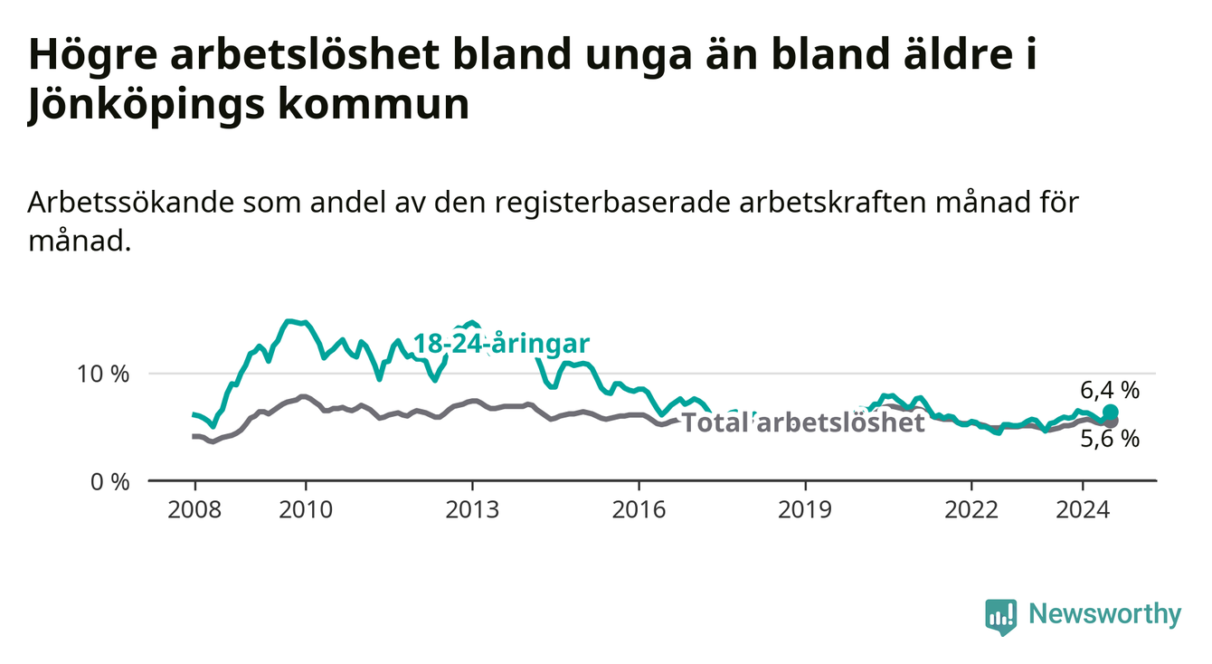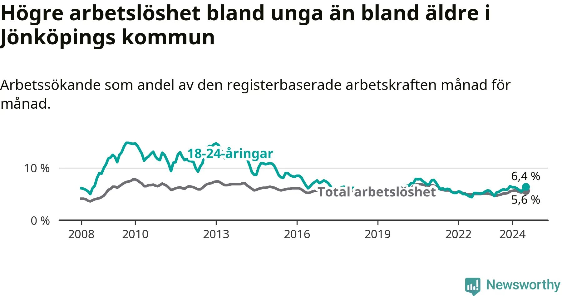 I och med den senaste månadens uppgång har de ungas arbetslöshet i Jönköping stigit 14 månader i följd (upp från 4,6 procent i maj 2023 till 6,4 procent nu).