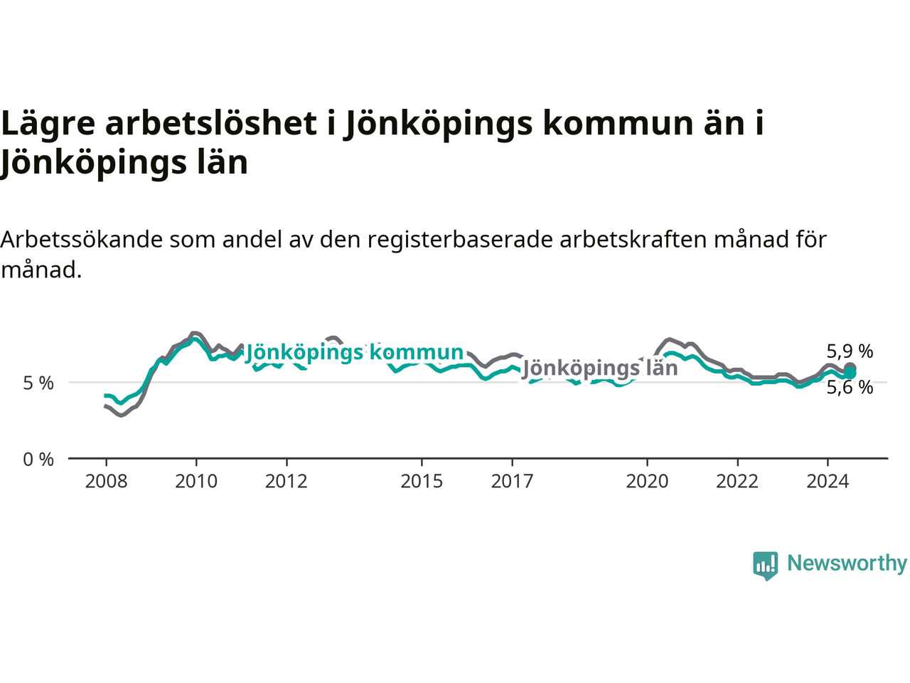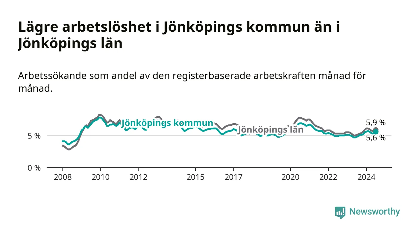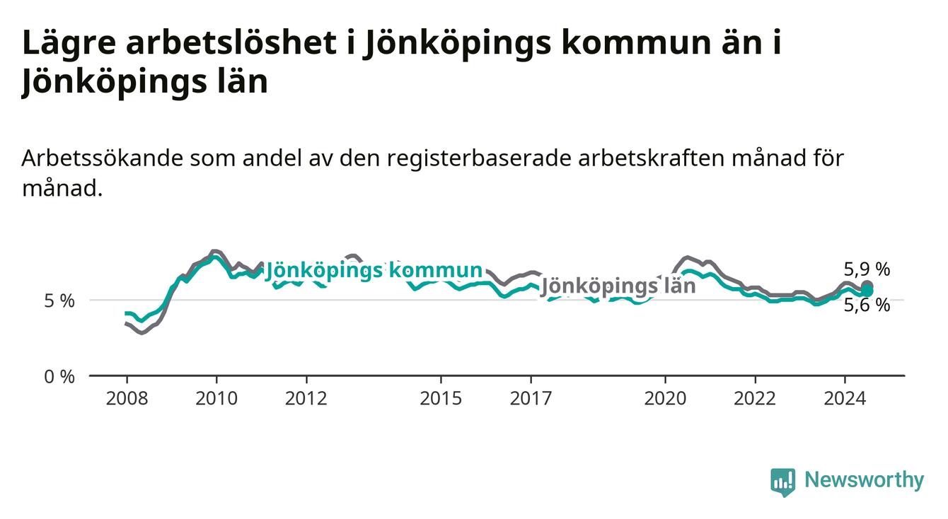 Även om arbetslösheten i Jönköping alltså ökar, så ligger den fortfarande under snittet i hela Jönköpings län (5,6 procent i kommunen, jämfört med 5,9 procent i hela länet). Habo har den lägsta arbetslösheten i länet (3,7 procent), medan Sävsjö har den högsta (8,5 procent). För att Jönköping skulle komma ner i samma arbetslöshetsnivå som Habo skulle 1 430 personer behöva sysselsättas.