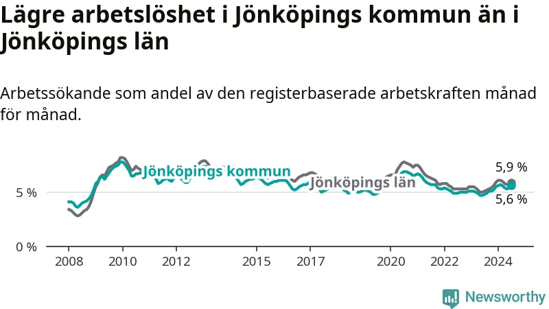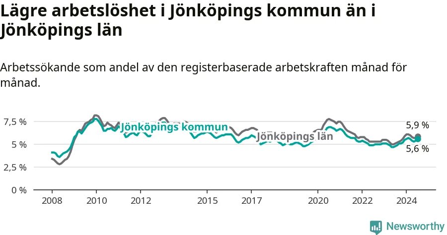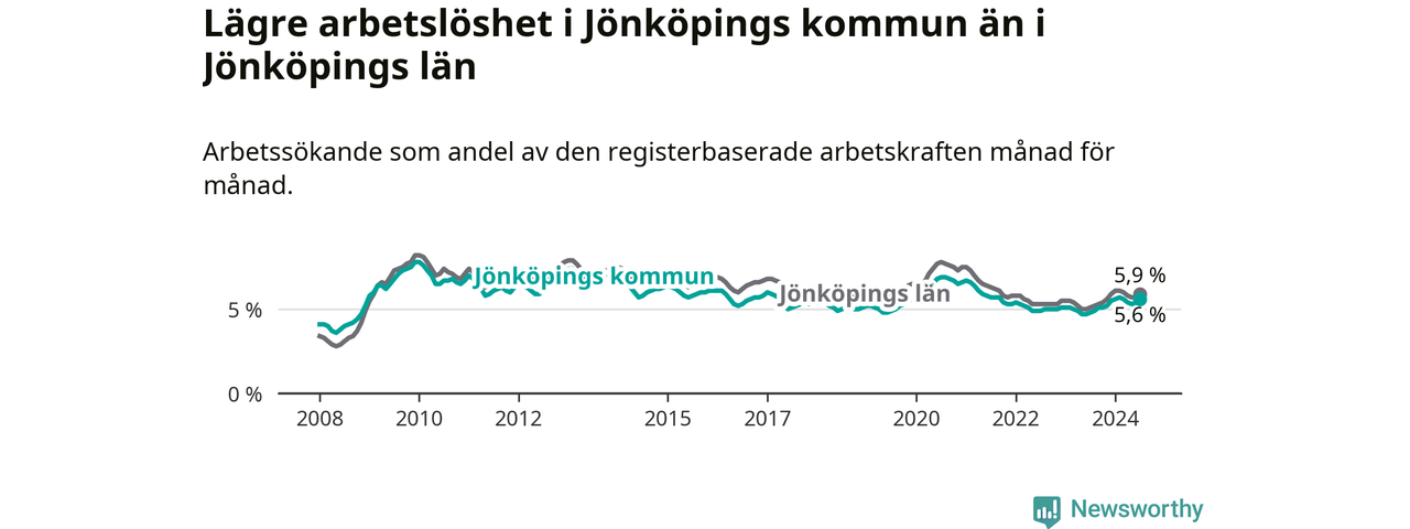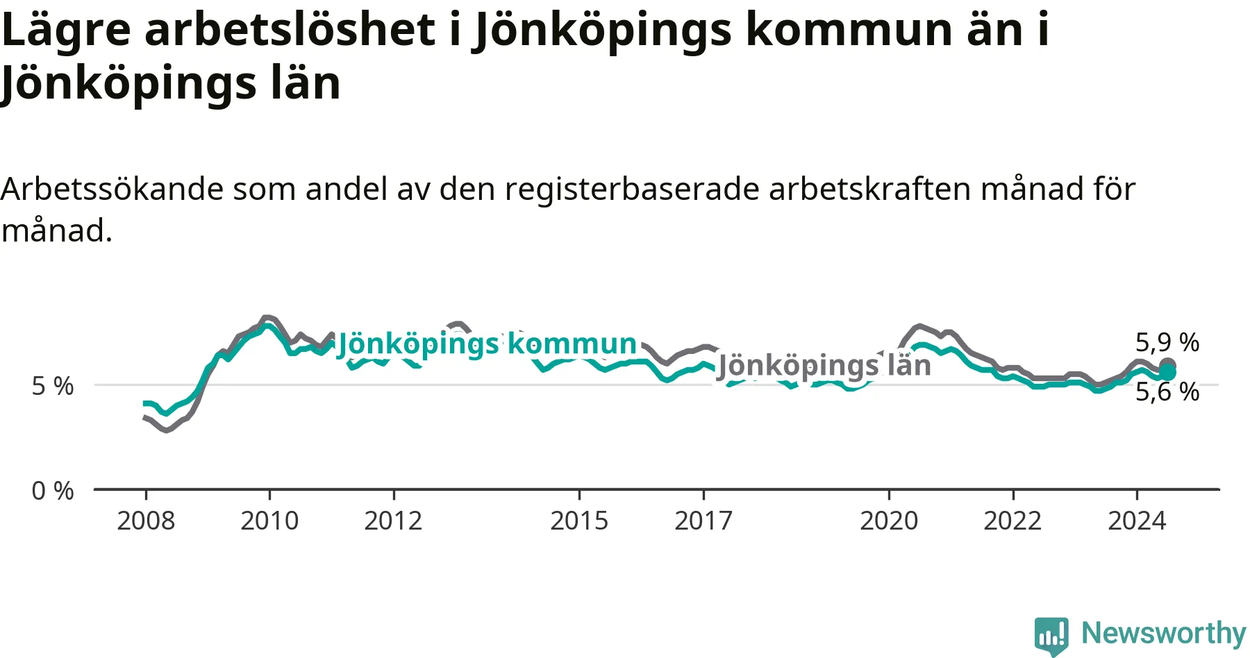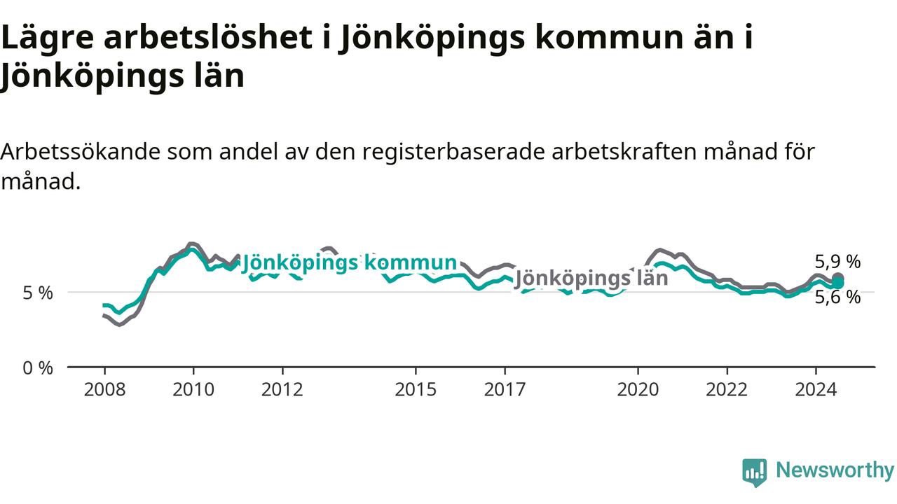Även om arbetslösheten i Jönköping alltså ökar, så ligger den fortfarande under snittet i hela Jönköpings län (5,6 procent i kommunen, jämfört med 5,9 procent i hela länet). Habo har den lägsta arbetslösheten i länet (3,7 procent), medan Sävsjö har den högsta (8,5 procent). För att Jönköping skulle komma ner i samma arbetslöshetsnivå som Habo skulle 1 430 personer behöva sysselsättas.