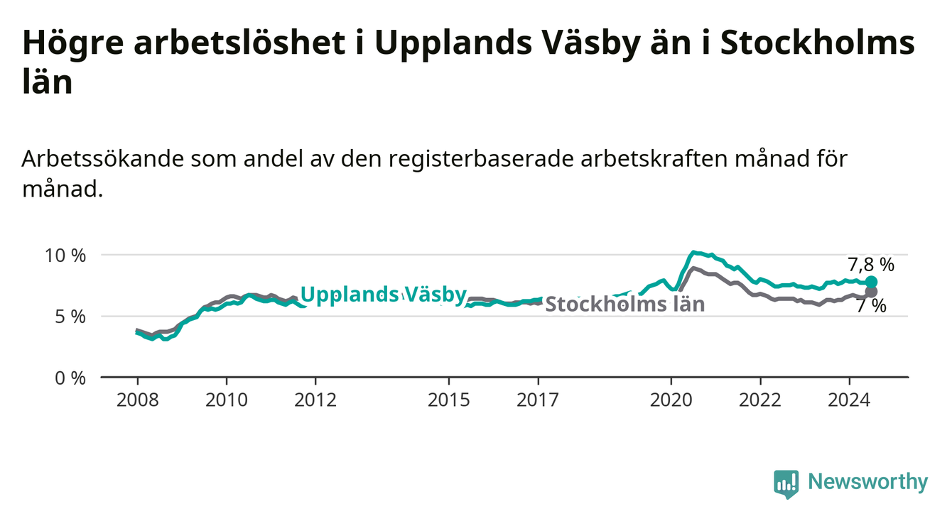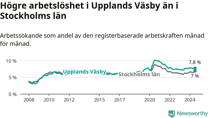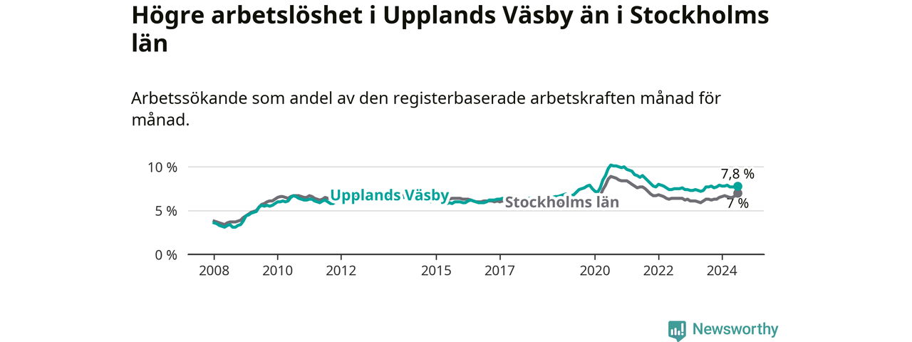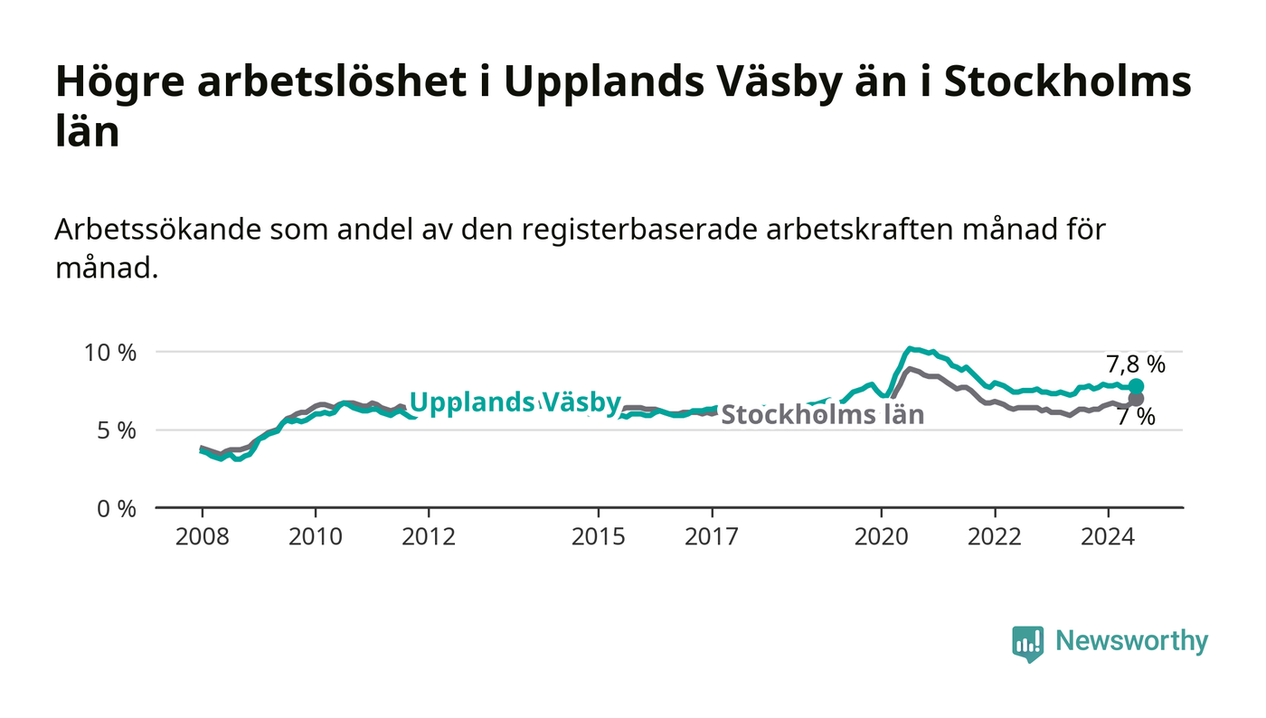 Upplands Väsby hade redan tidigare högre arbetslöshet än snittet i hela Stockholms län och nu växer klyftan (7,8 procent i kommunen, jämfört med 7,0 procent i hela länet). Ekerö har den lägsta arbetslösheten i länet (3,5 procent), medan Södertälje har den högsta (11,0 procent). För att Upplands Väsby skulle komma ner i samma arbetslöshetsnivå som Ekerö skulle 1 117 personer behöva sysselsättas.