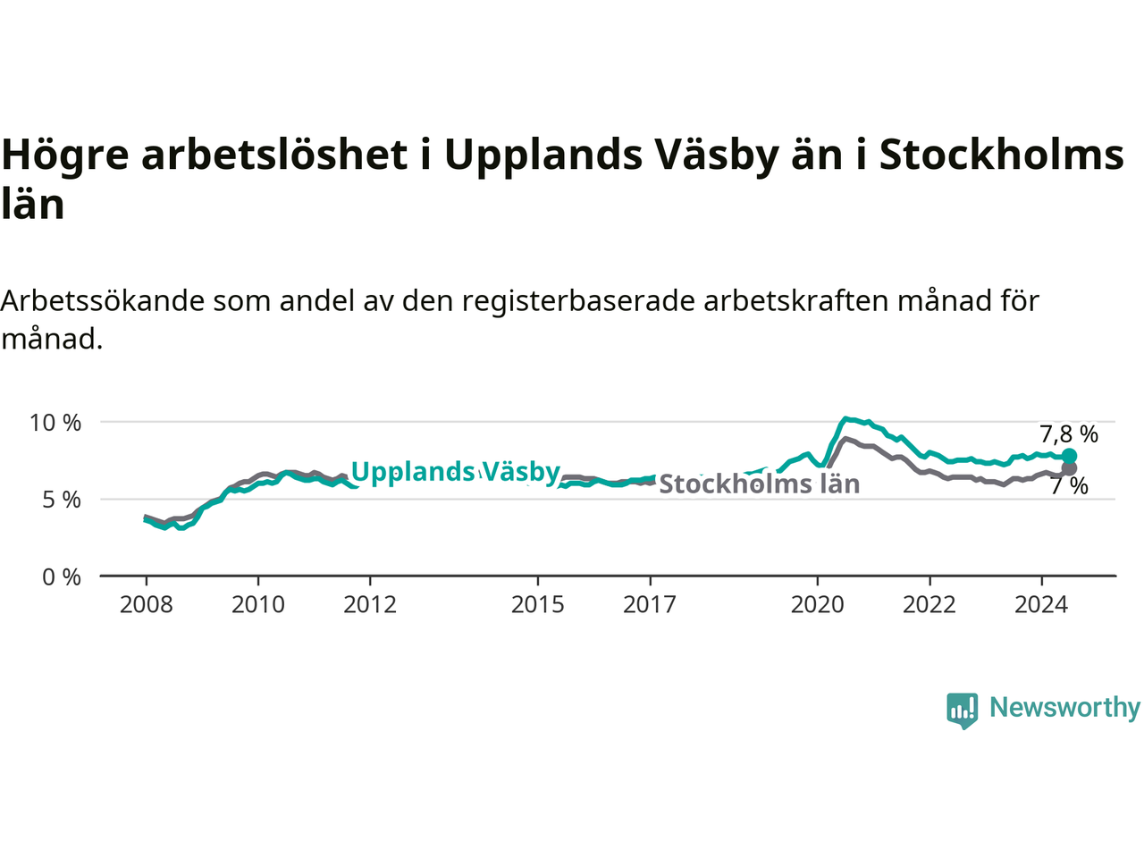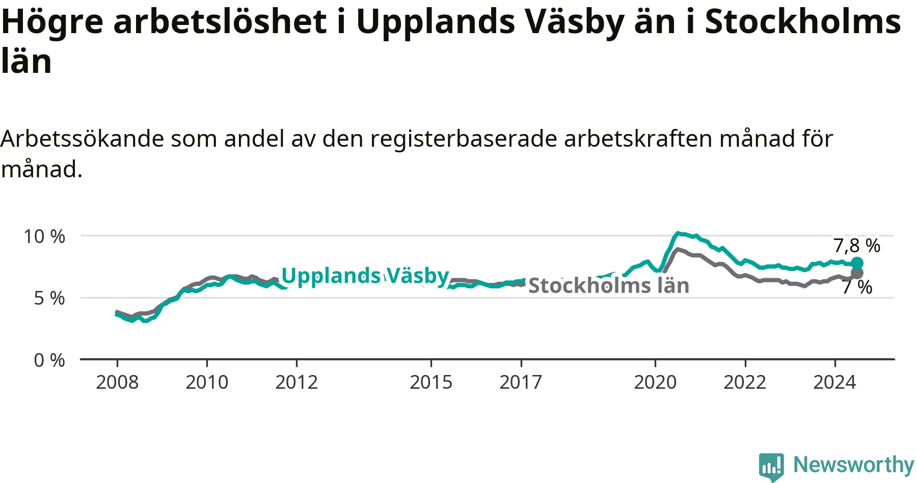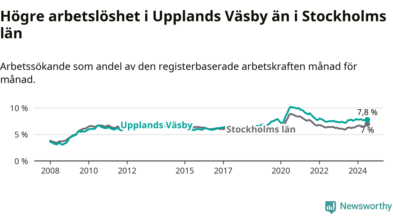 Upplands Väsby hade redan tidigare högre arbetslöshet än snittet i hela Stockholms län och nu växer klyftan (7,8 procent i kommunen, jämfört med 7,0 procent i hela länet). Ekerö har den lägsta arbetslösheten i länet (3,5 procent), medan Södertälje har den högsta (11,0 procent). För att Upplands Väsby skulle komma ner i samma arbetslöshetsnivå som Ekerö skulle 1 117 personer behöva sysselsättas.