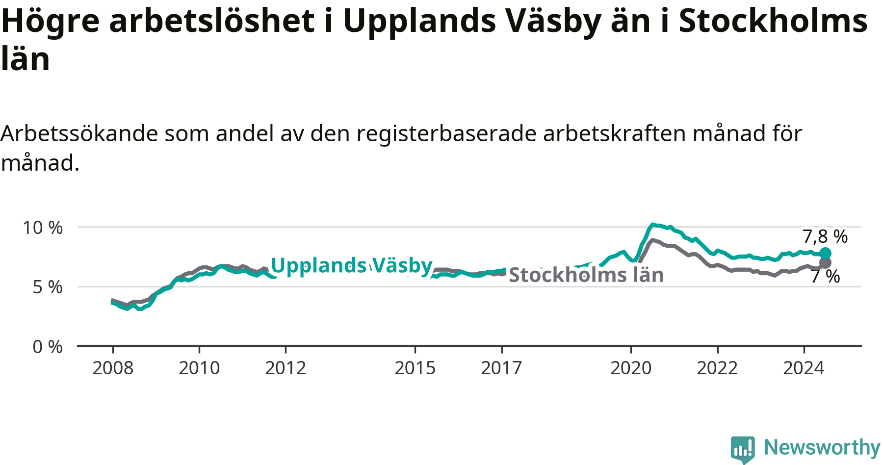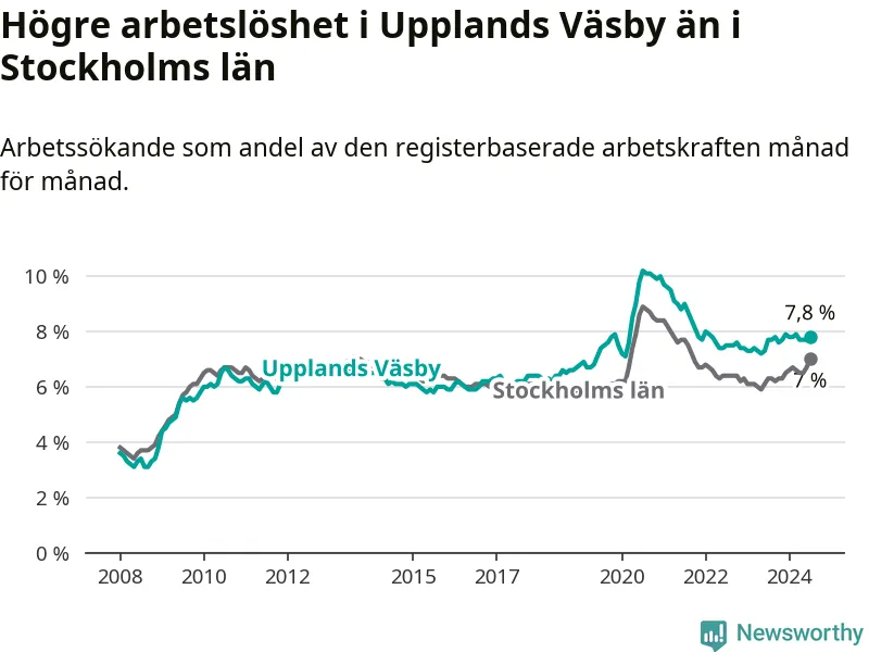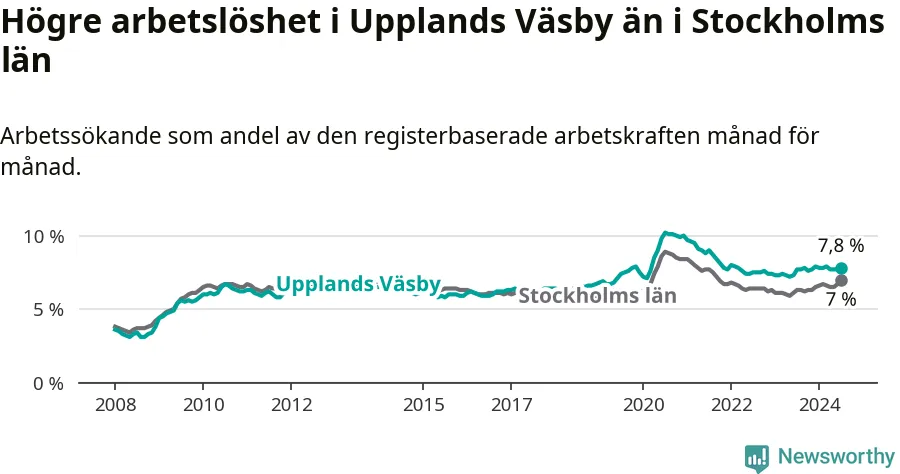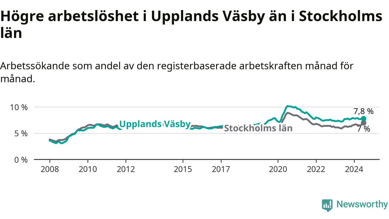 Under juli månad rapporterade Upplands Väsby kommun en total arbetslöshet på 7,8 procent. Det är en ökning jämfört med samma tidpunkt i fjol (+0,1 procentenheter). Även i Stockholms län stiger arbetslösheten .