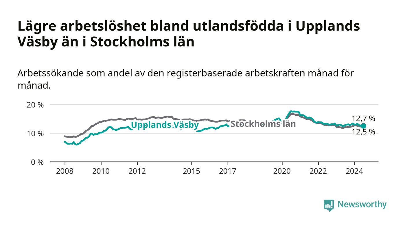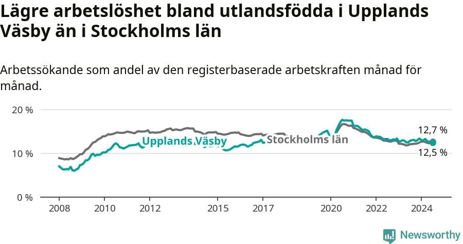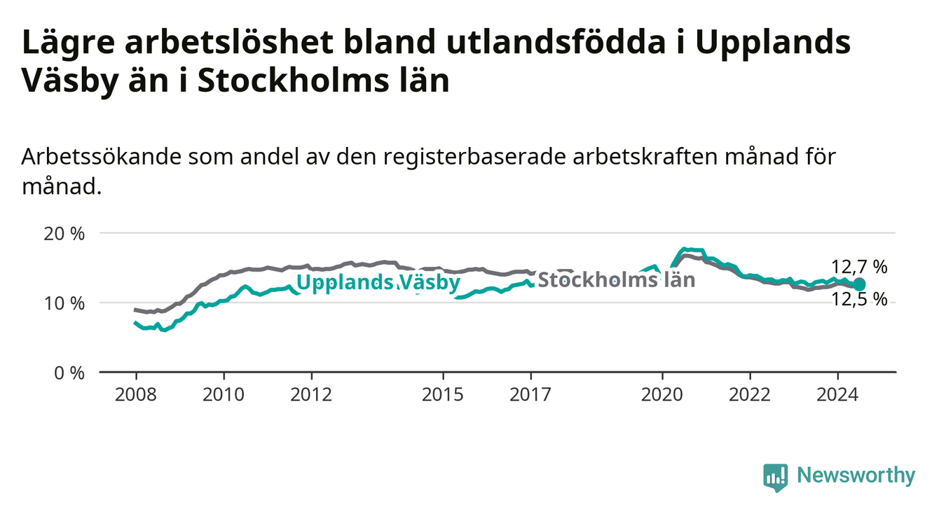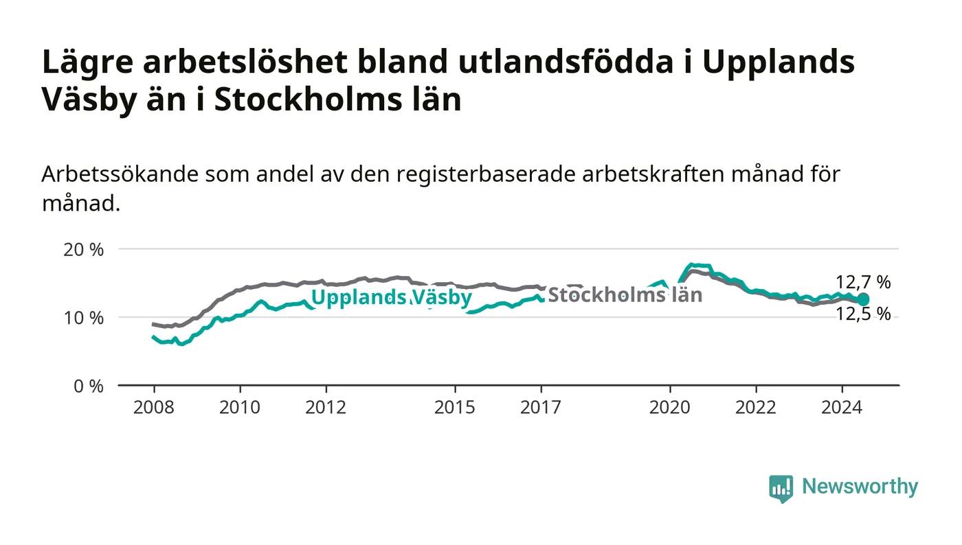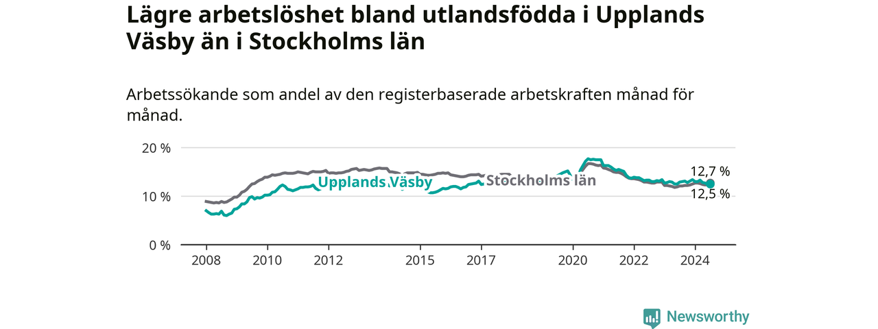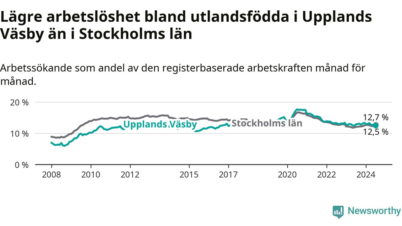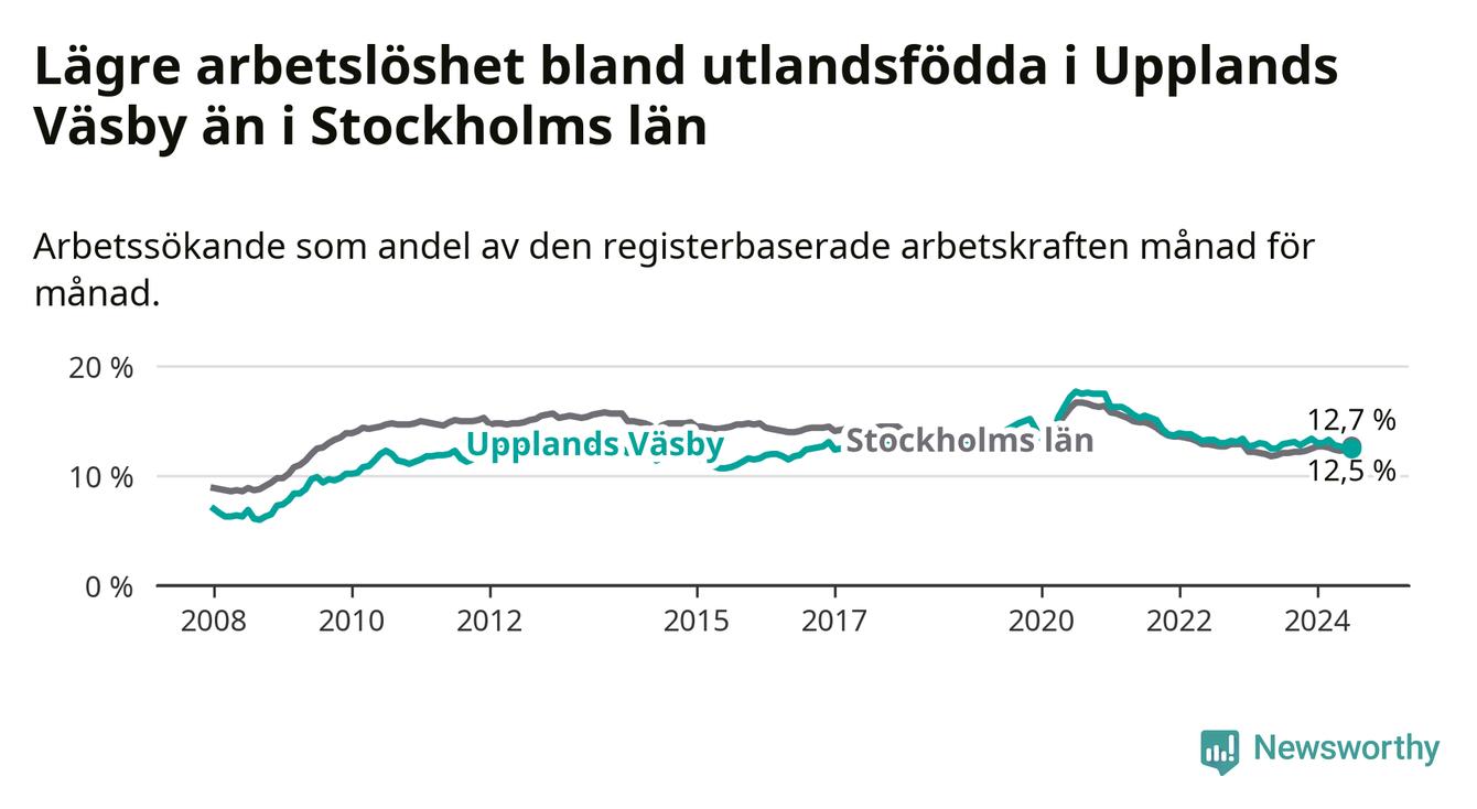 Medan arbetslösheten bland utlandsfödda alltså minskar i Upplands Väsby så ökar den i Stockholms län. Jämfört med juli förra året har andelen arbetslösa utlandsfödda i länet ökat med 0,6 procentenheter (till 12,7 procent).