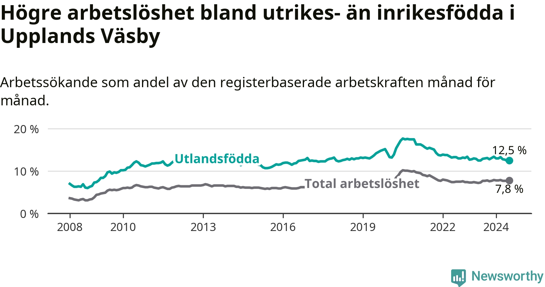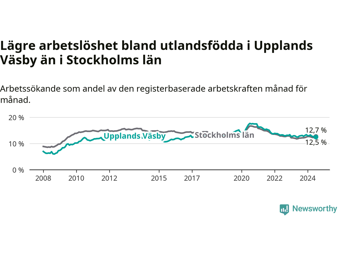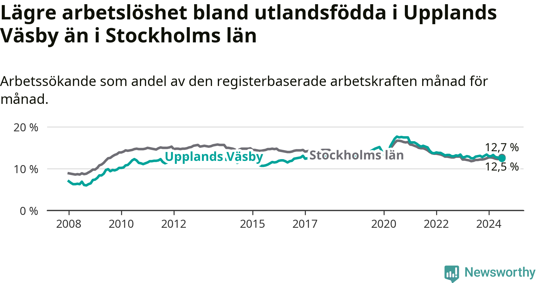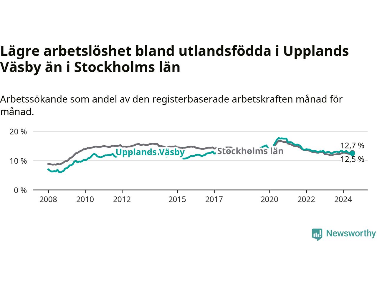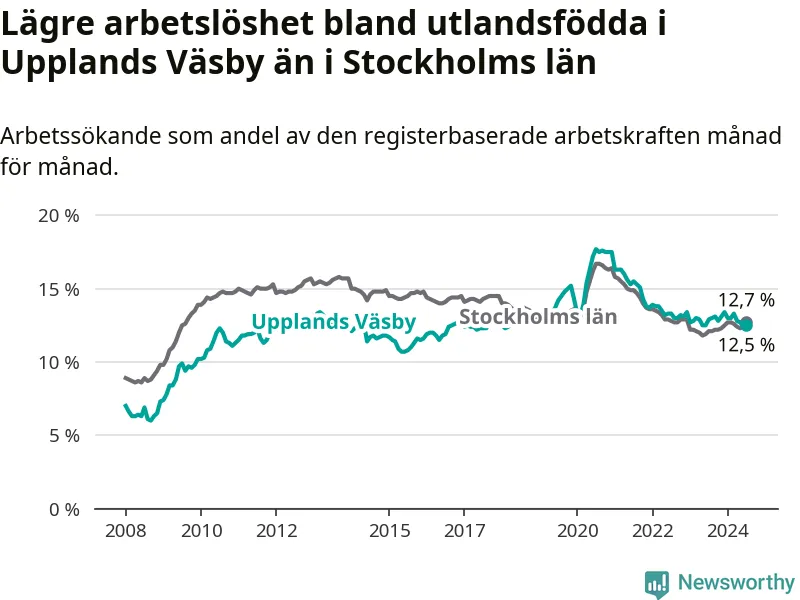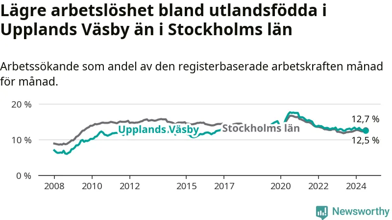 Medan arbetslösheten bland utlandsfödda alltså minskar i Upplands Väsby så ökar den i Stockholms län. Jämfört med juli förra året har andelen arbetslösa utlandsfödda i länet ökat med 0,6 procentenheter (till 12,7 procent).