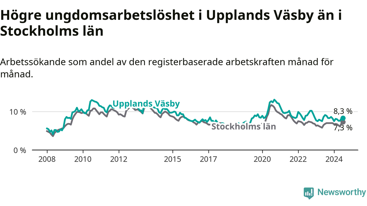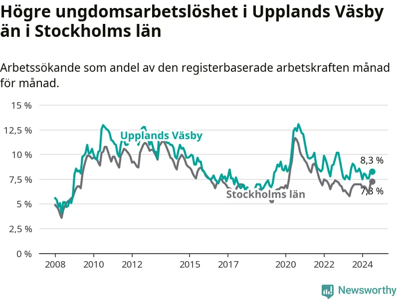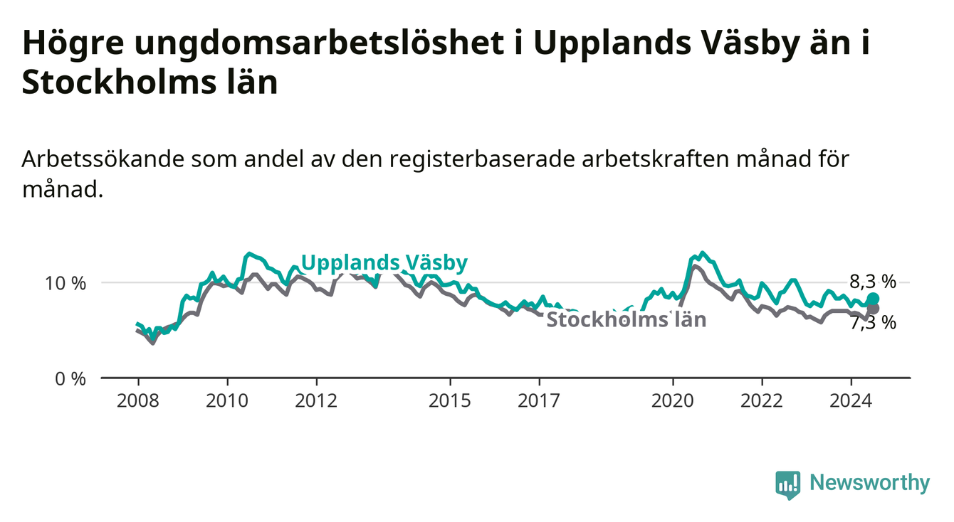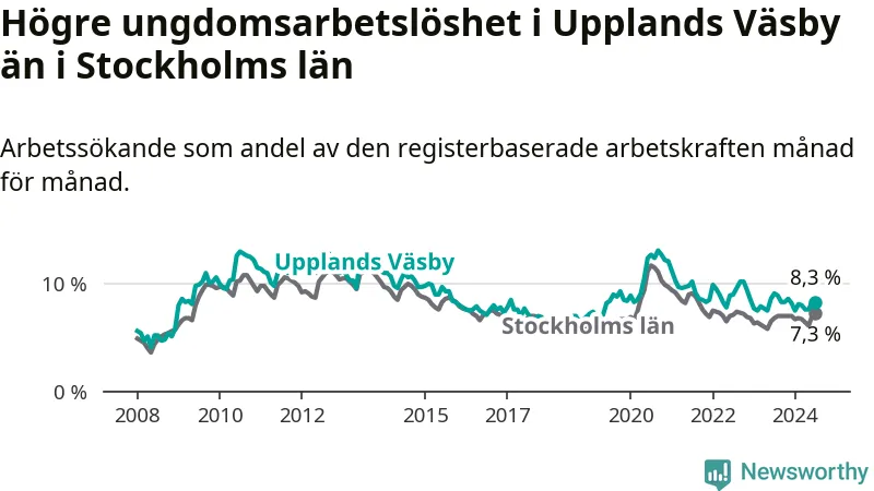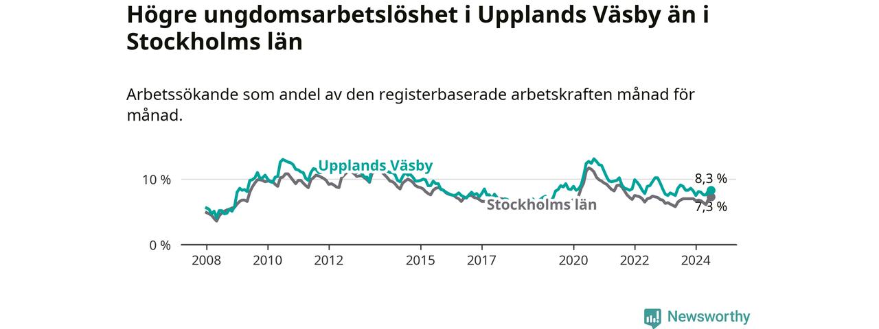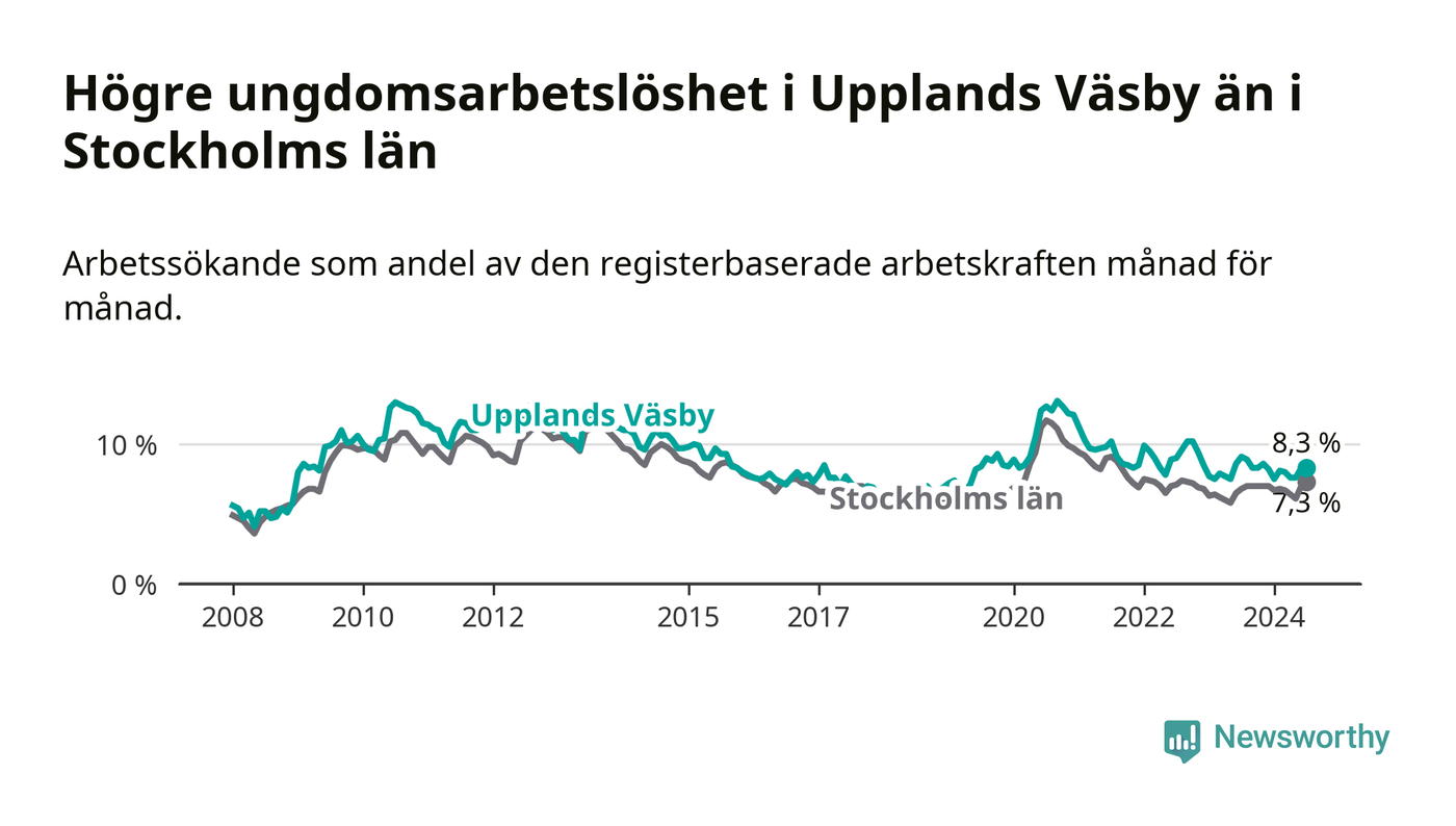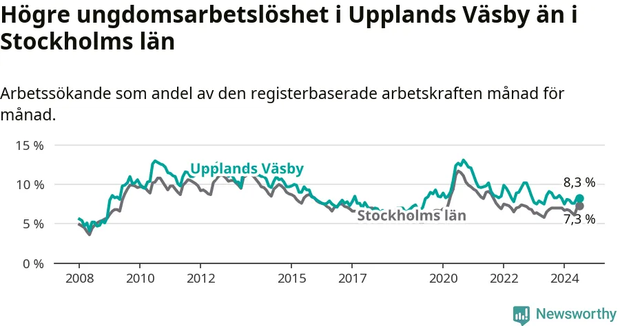 Precis som den totala arbetslösheten ligger ungdomsarbetslösheten i Upplands Väsby högre än i Stockholms län som helhet. Skillnaden mellan kommunen och länet är 1,0 procentenheter.