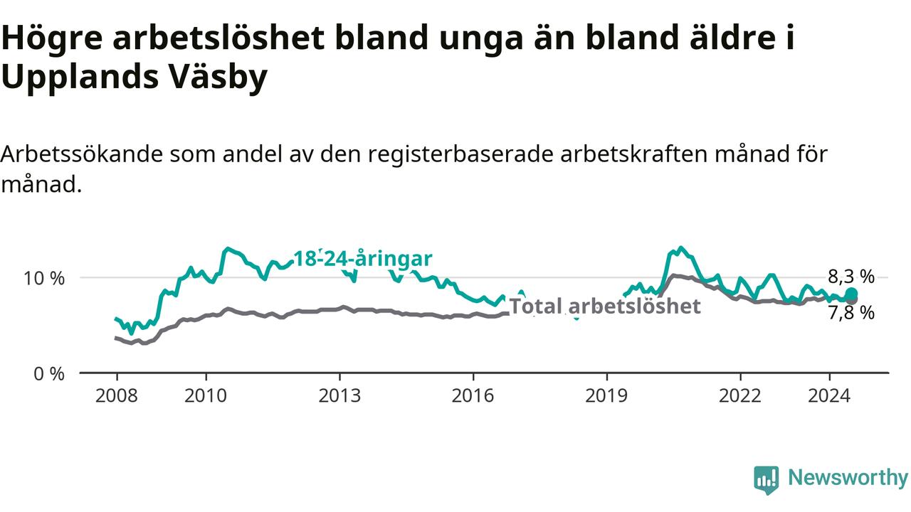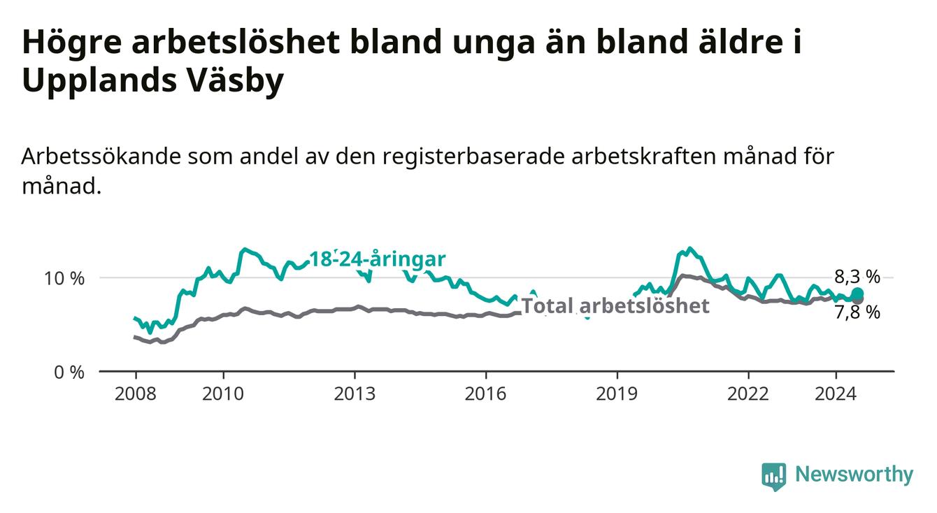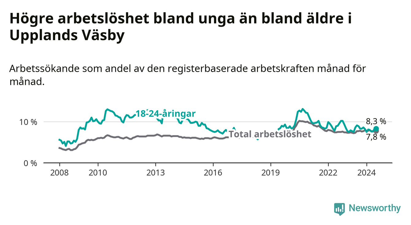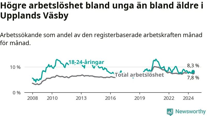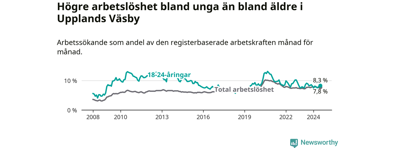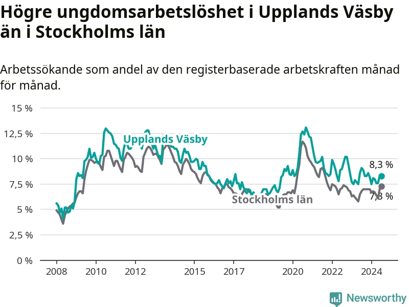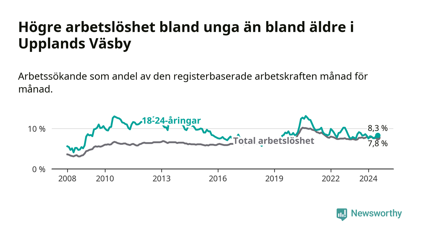 Precis som den totala arbetslösheten ligger ungdomsarbetslösheten i Upplands Väsby högre än i Stockholms län som helhet. Skillnaden mellan kommunen och länet är 1,0 procentenheter.