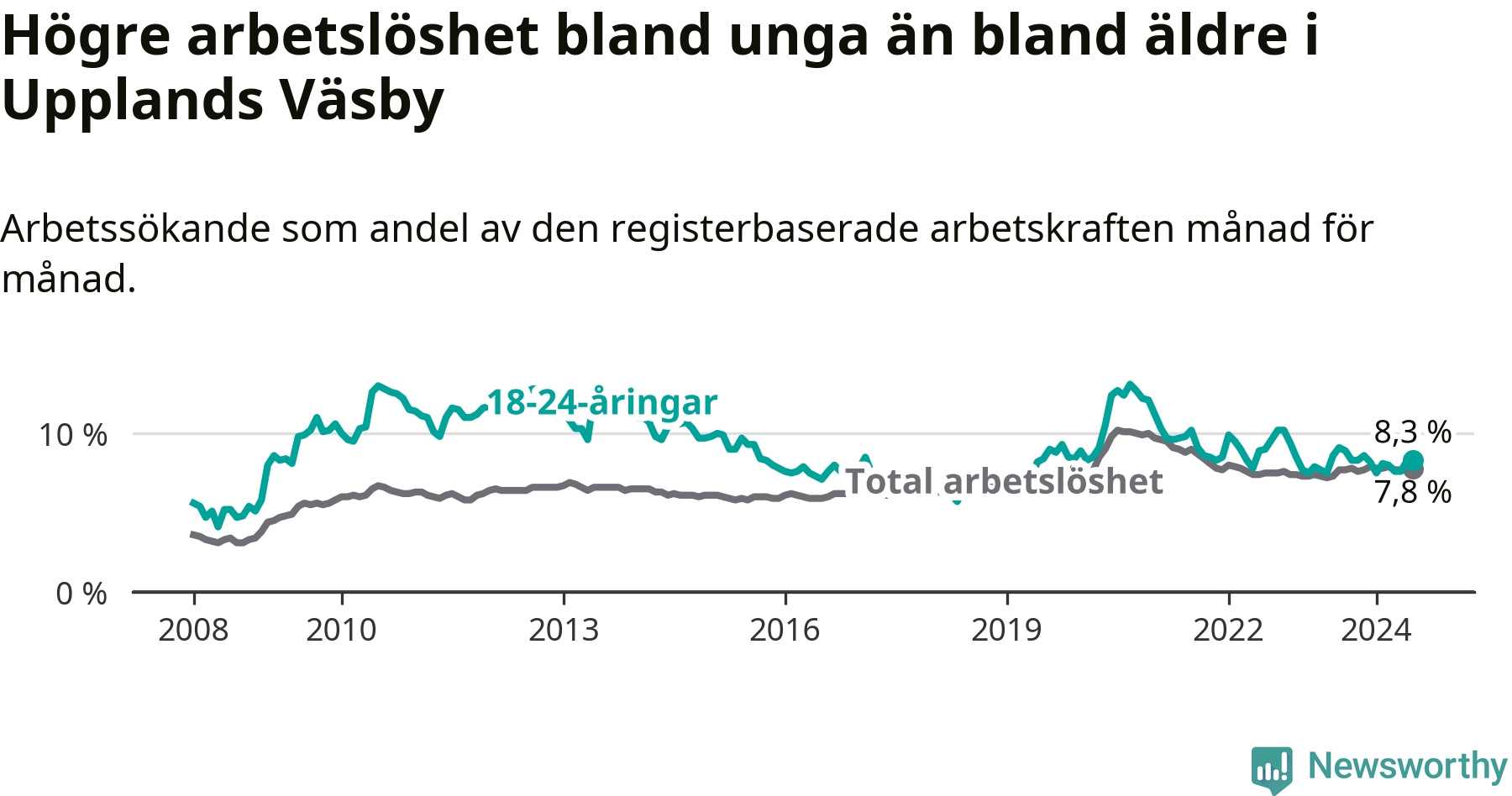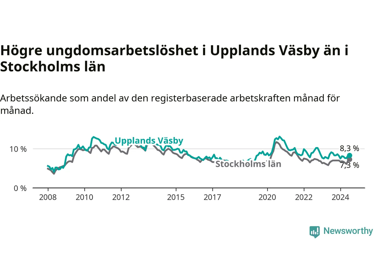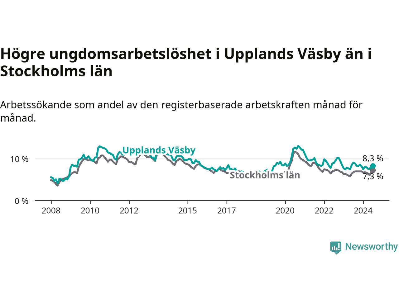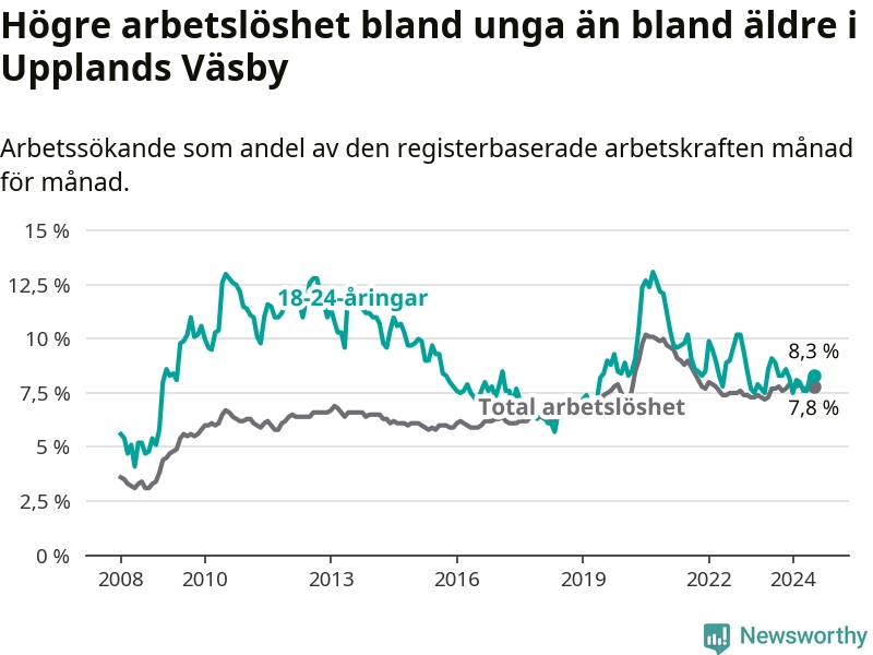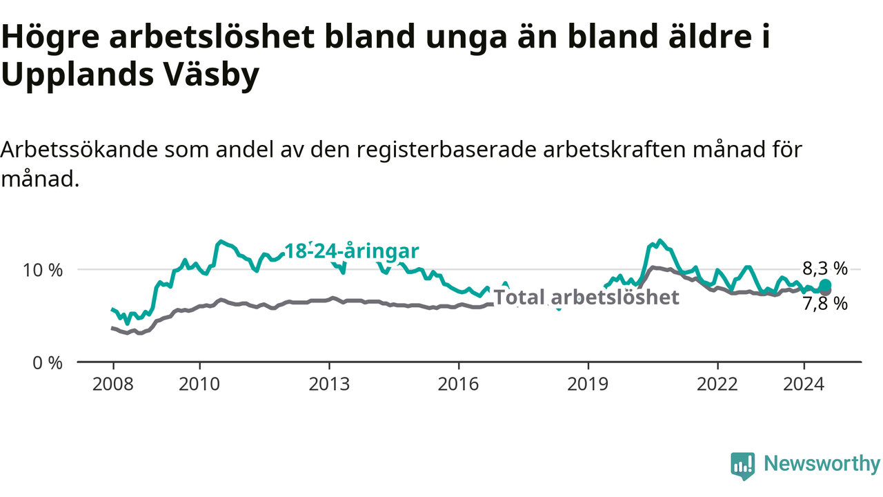 Precis som den totala arbetslösheten ligger ungdomsarbetslösheten i Upplands Väsby högre än i Stockholms län som helhet. Skillnaden mellan kommunen och länet är 1,0 procentenheter.