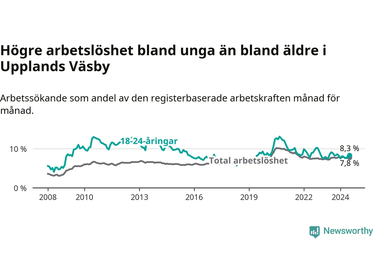 Till skillnad från den totala arbetslösheten sjunker arbetslösheten bland unga (−0,8 procentenheter). I juli var 8,3 procent av 18–24-åringarna inskrivna som arbetssökande (motsvarande 211 personer). Mäter vi antalet inskrivna ser vi en ökning med ett personer på ett års sikt.