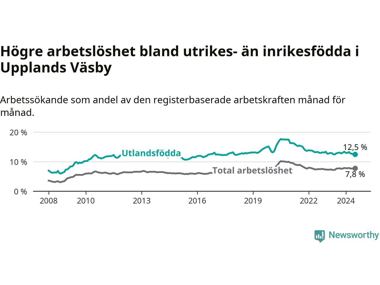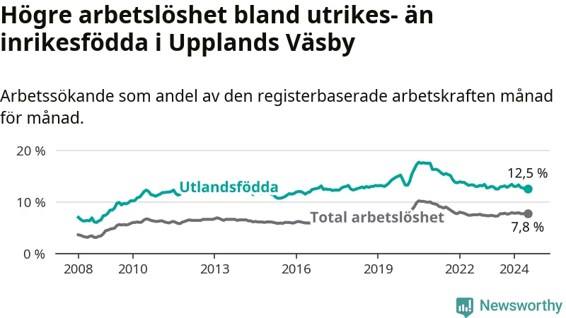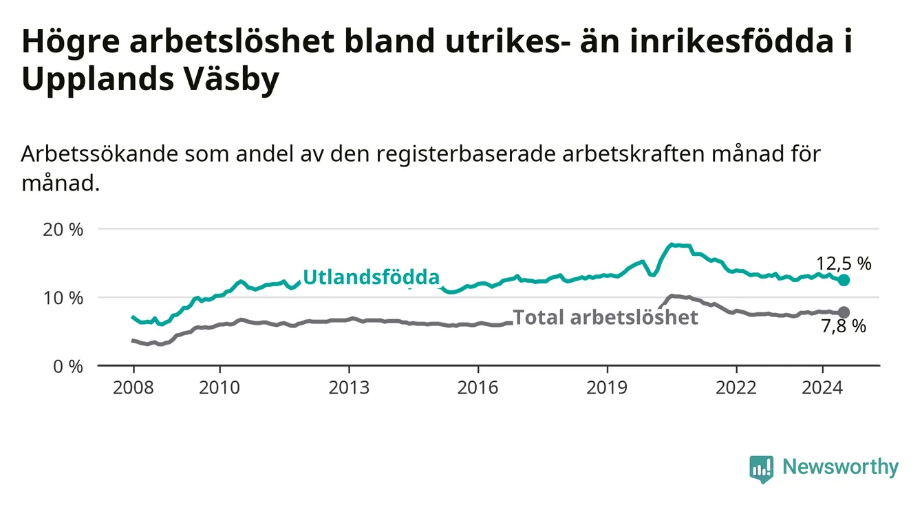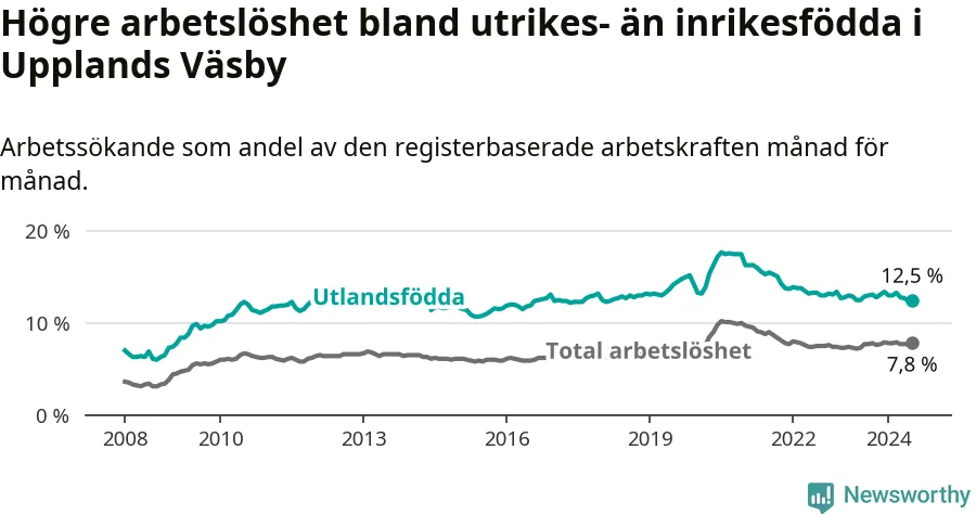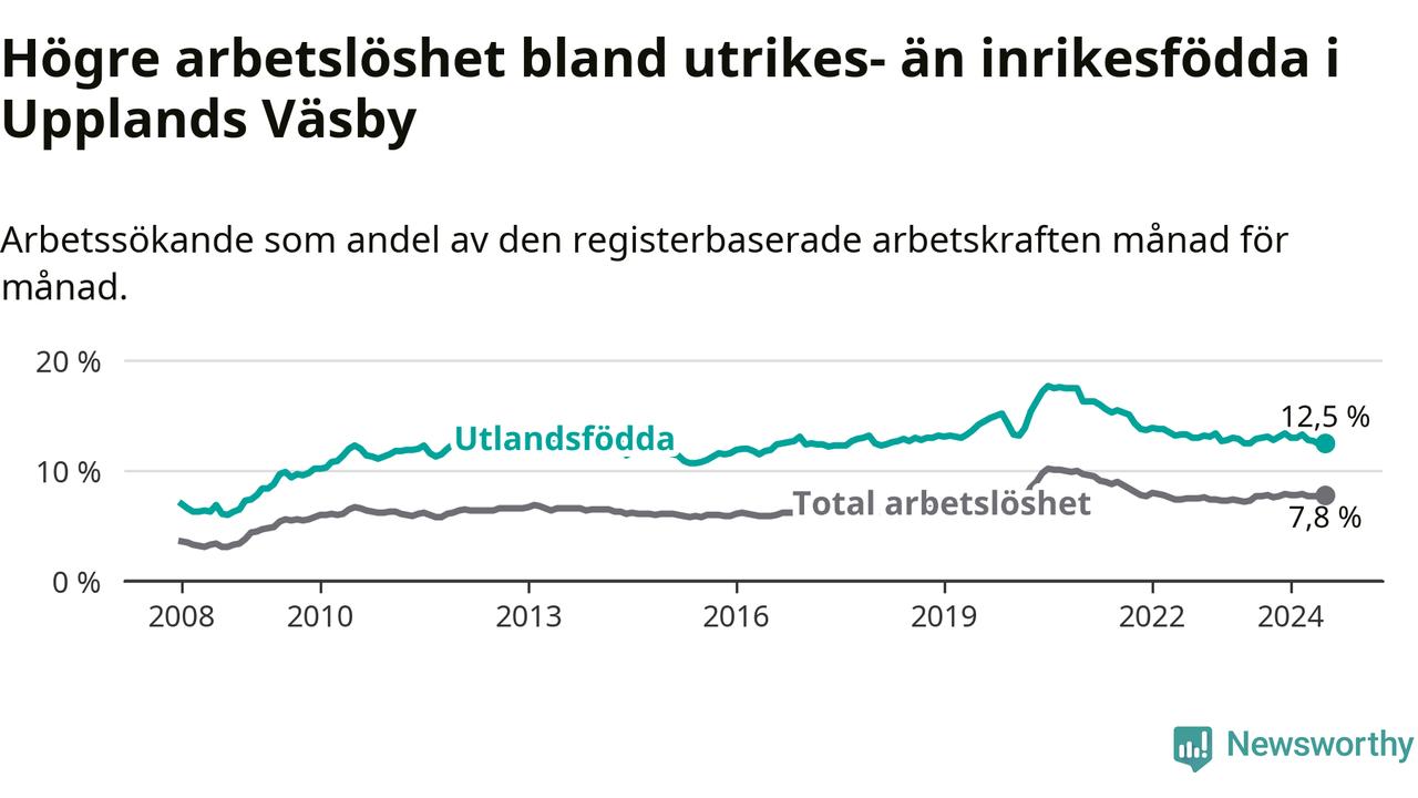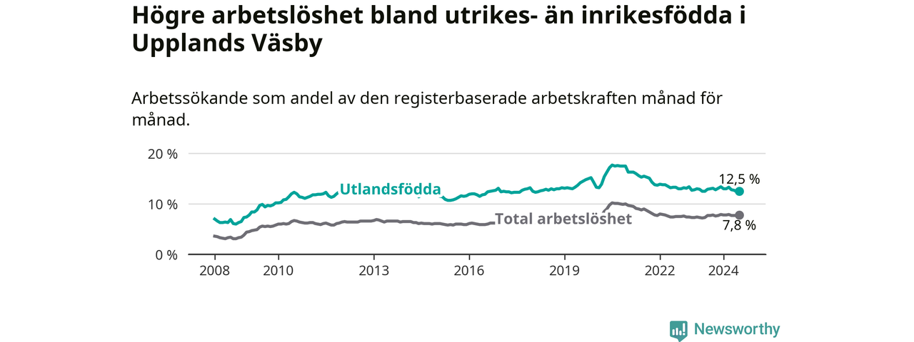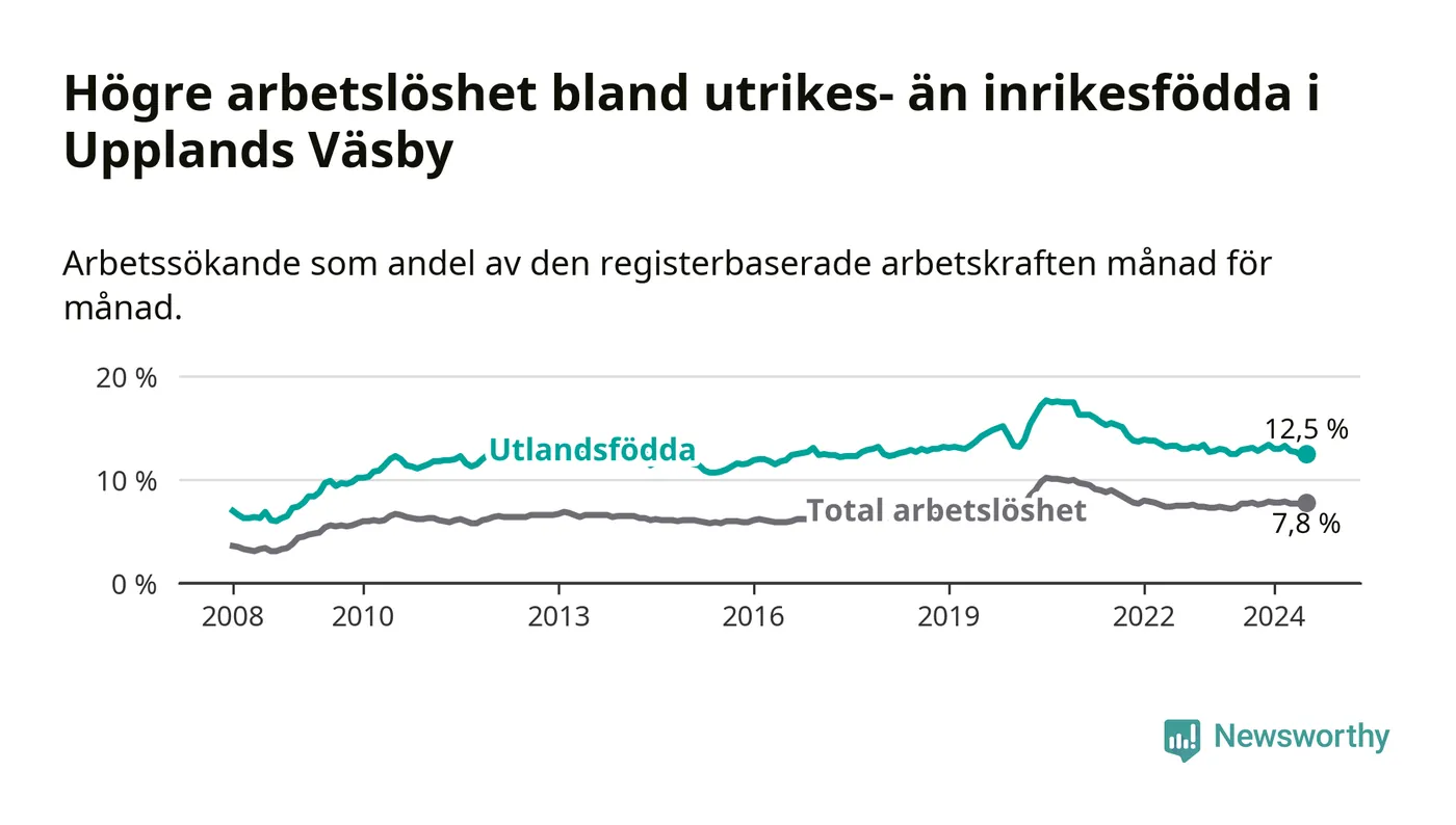 Arbetslösheten bland utlandsfödda var 12,5 procent i Upplands Väsby under juli månad, motsvarande 1 383 av 11 064 personer. Det är 0,4 procentenheter färre än vid samma tidpunkt i fjol (−540 om man räknar personer).