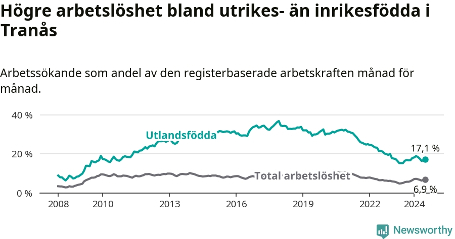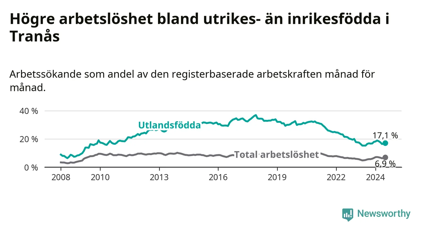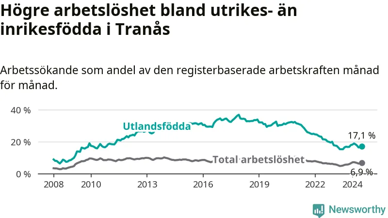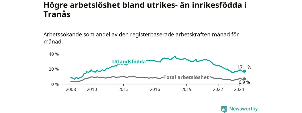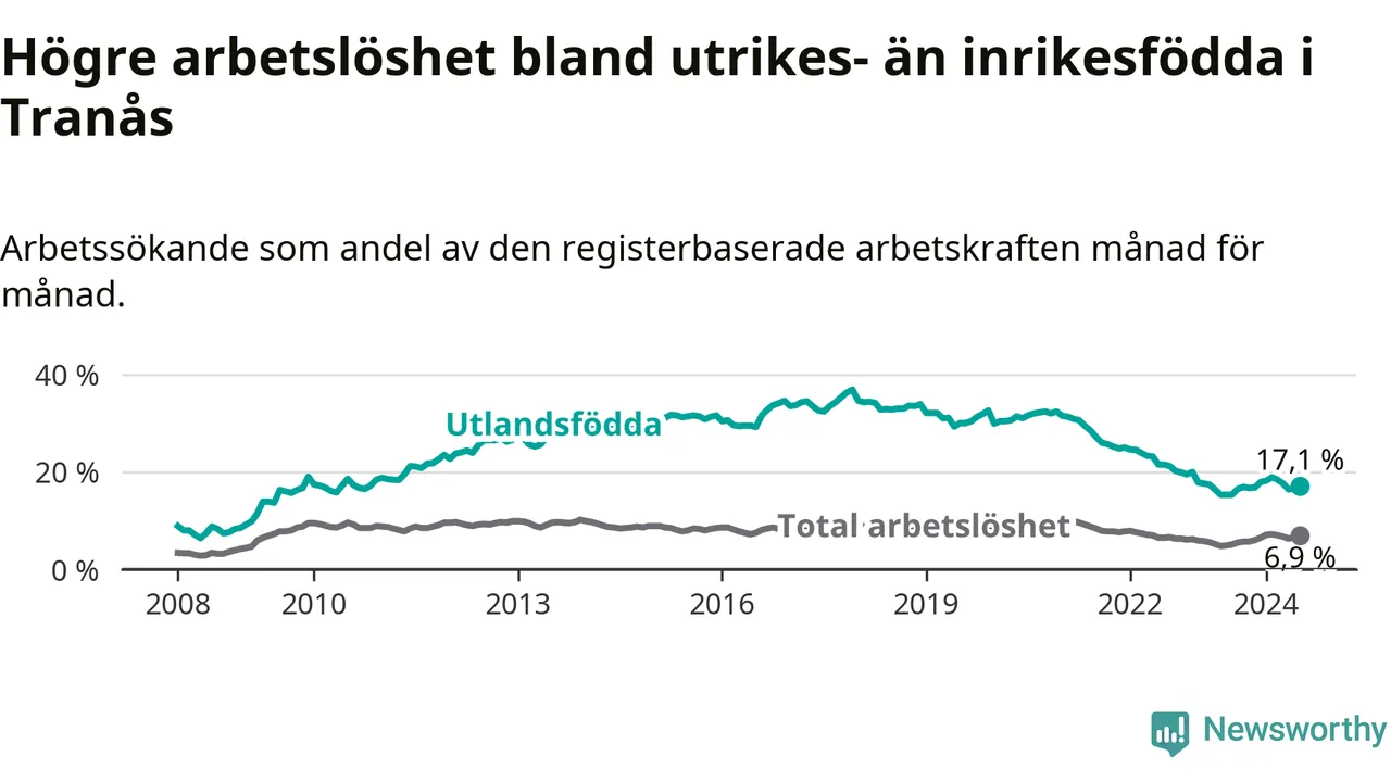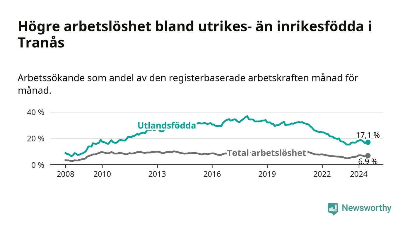 Skillnaden i arbetslöshet mellan utrikesfödda och hela befolkningen är 10,2 procentenheter i Tranås. Det är ungefär samma skillnad som för ett år sedan.