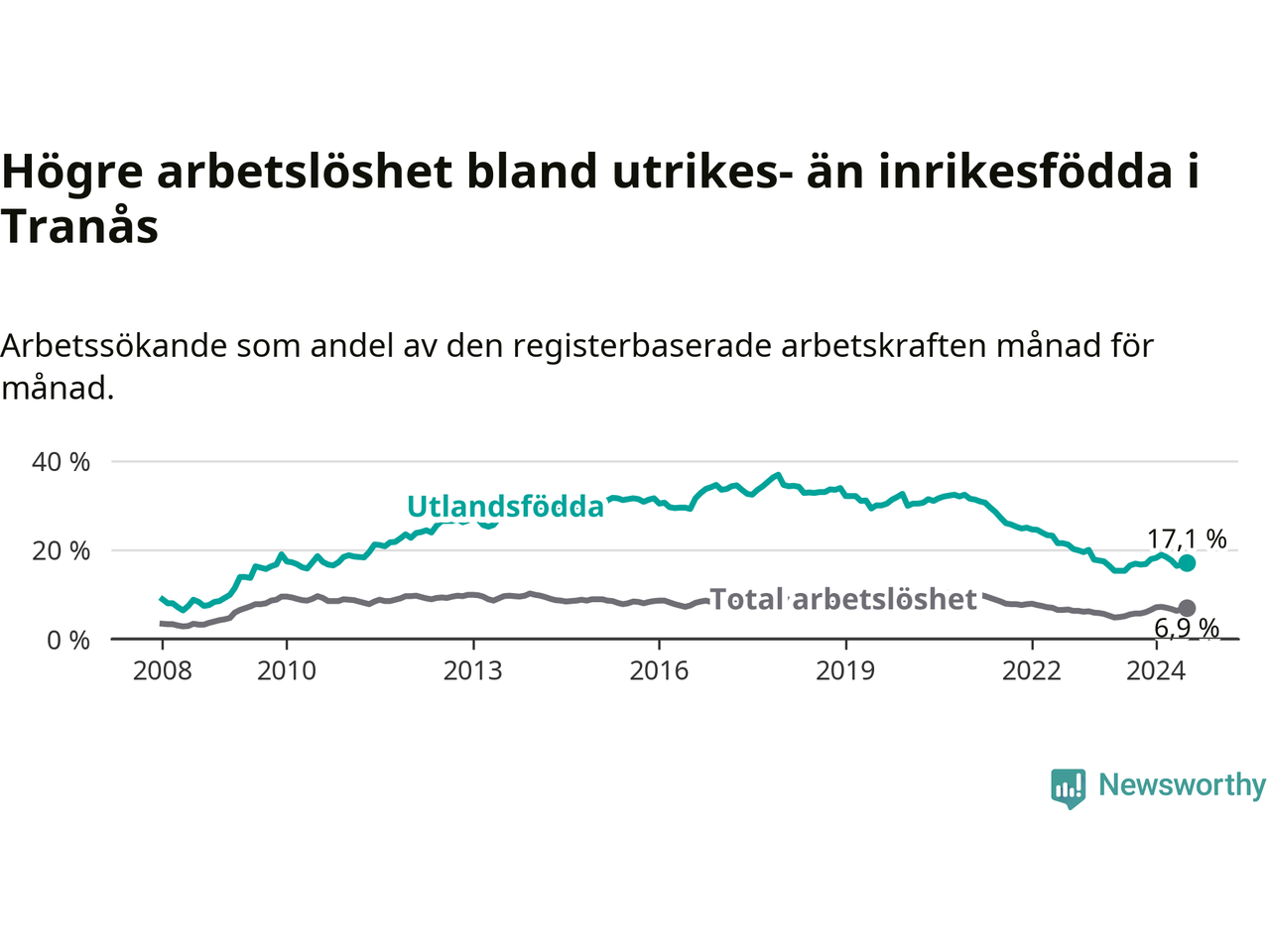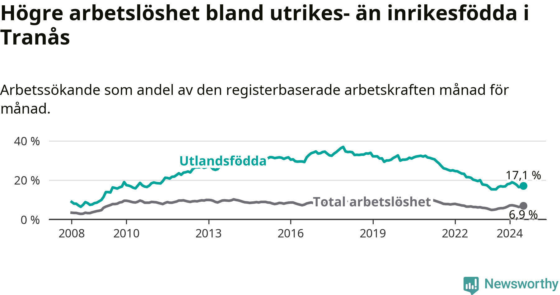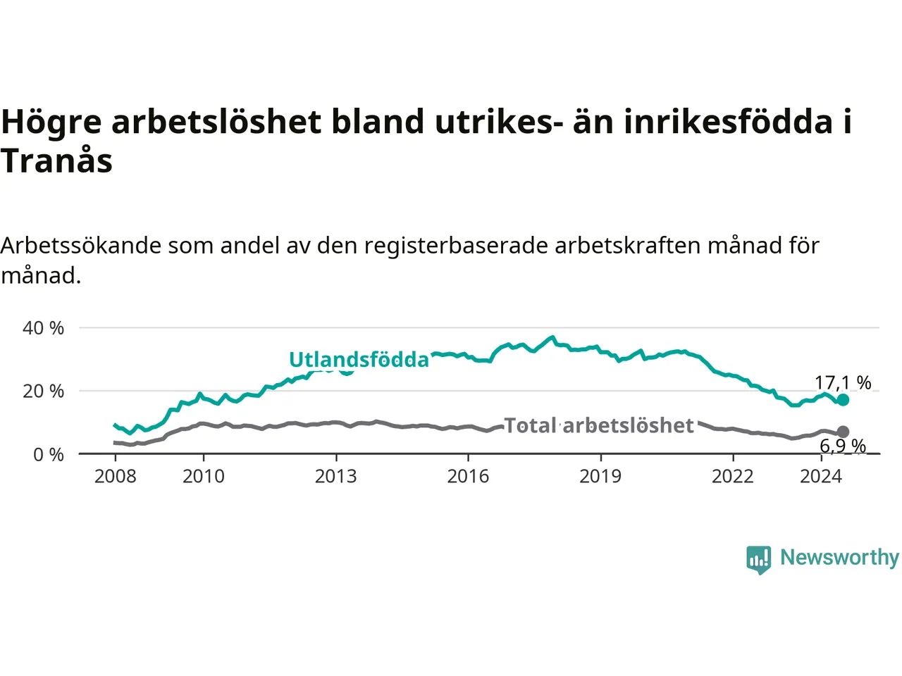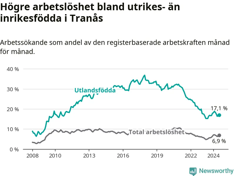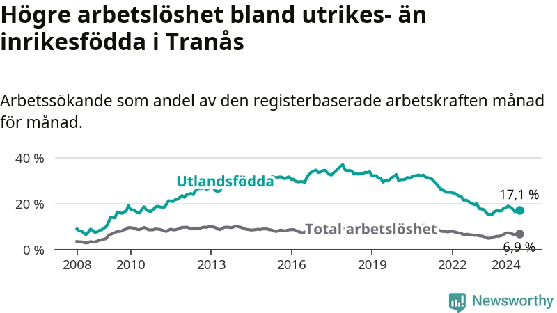 Skillnaden i arbetslöshet mellan utrikesfödda och hela befolkningen är 10,2 procentenheter i Tranås. Det är ungefär samma skillnad som för ett år sedan.