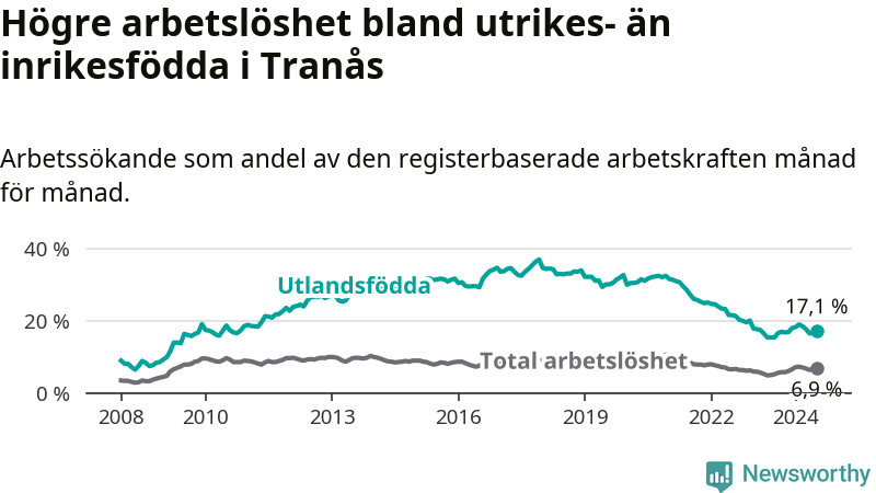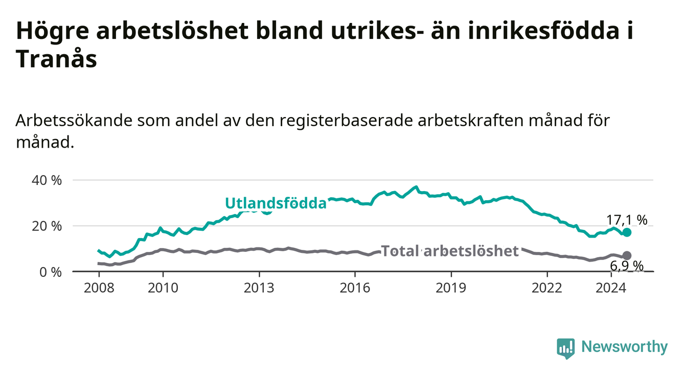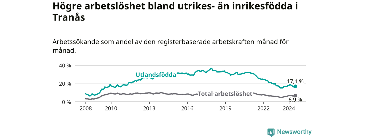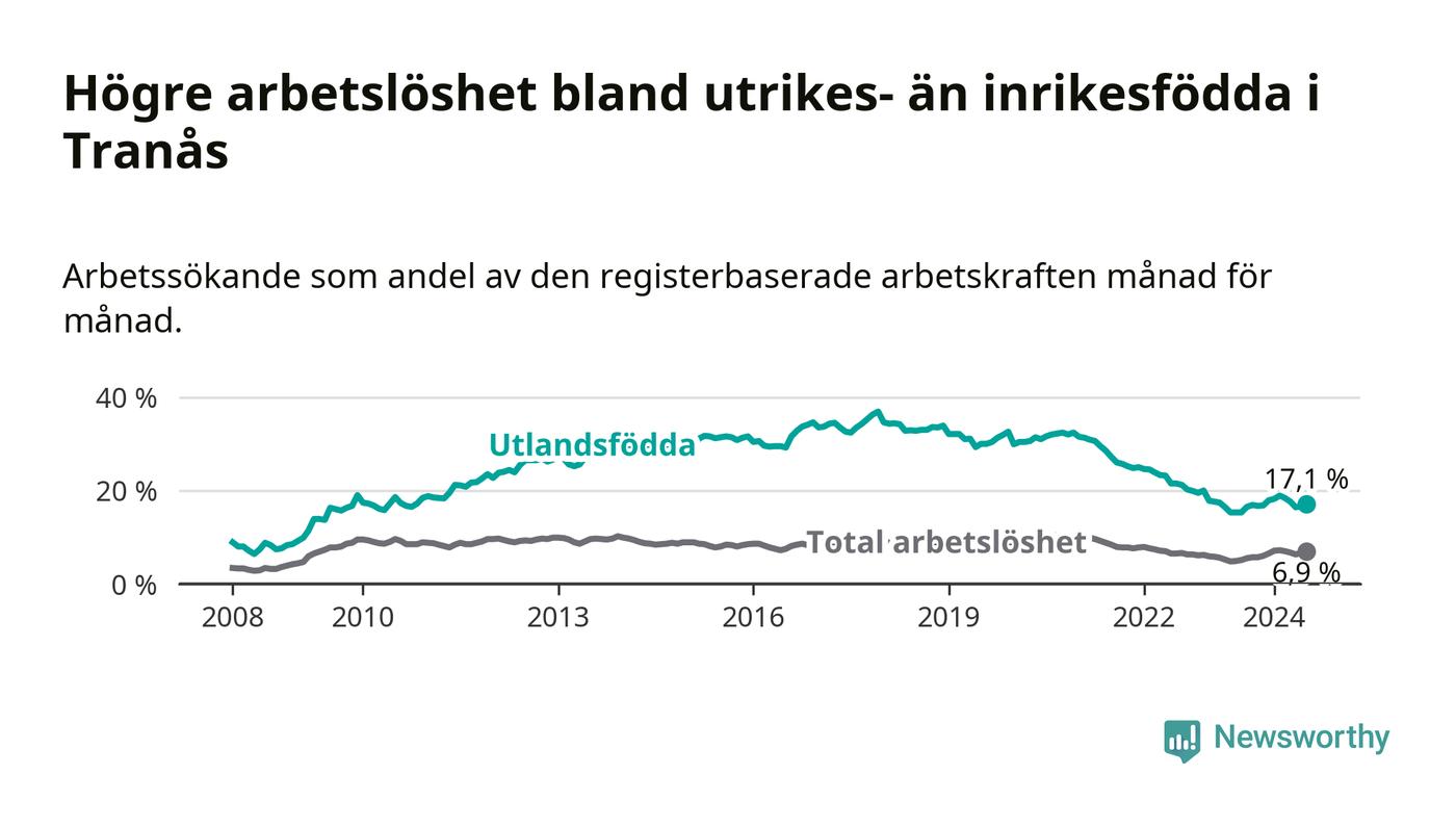 Arbetslösheten bland utlandsfödda var 17,1 procent i Tranås under juli månad, motsvarande 308 av 1 801 personer. Det är 1,8 procentenheter fler än vid samma tidpunkt i fjol (−131 om man räknar personer). Därmed är de utlandsföddas arbetslöshet högre än vid samma tidpunkt i fjol för sjunde månaden i följd.