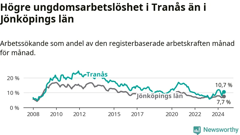 Precis som den totala arbetslösheten ligger ungdomsarbetslösheten i Tranås högre än i Jönköpings län som helhet. Skillnaden mellan kommunen och länet är 3,0 procentenheter.