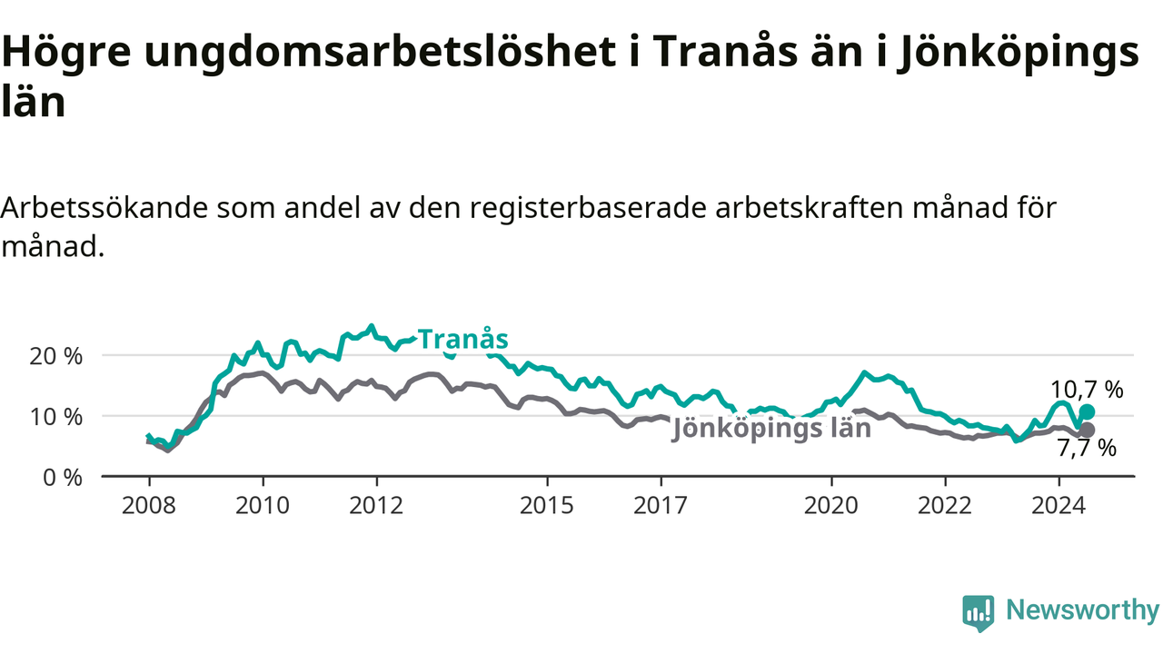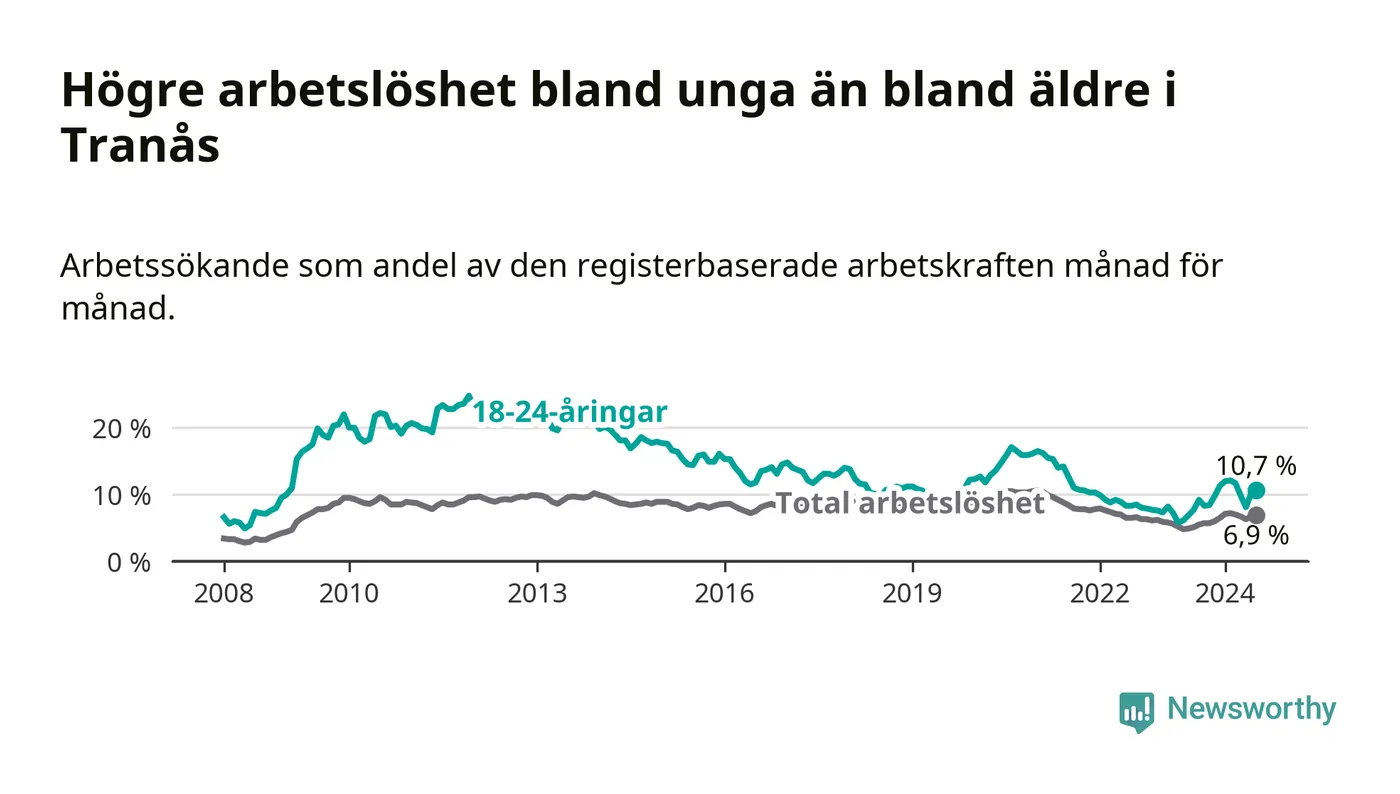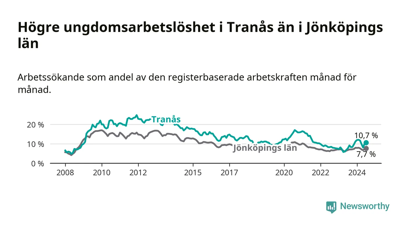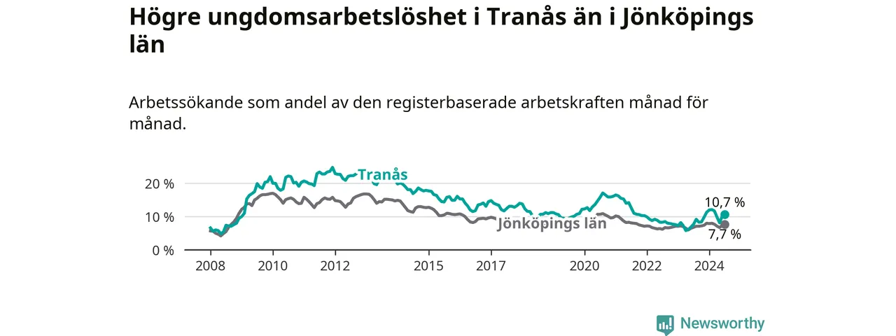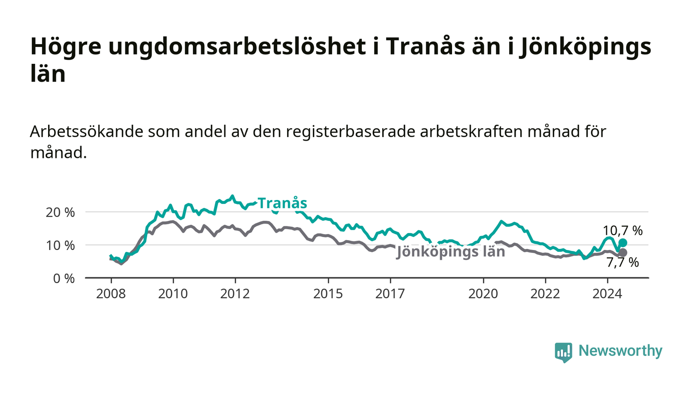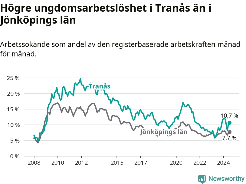 I och med den senaste månadens uppgång har de ungas arbetslöshet i Tranås stigit tolv månader i följd (upp från 7,7 procent i juli 2023 till 10,7 procent nu).