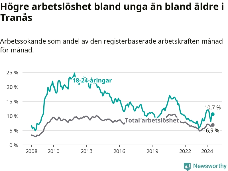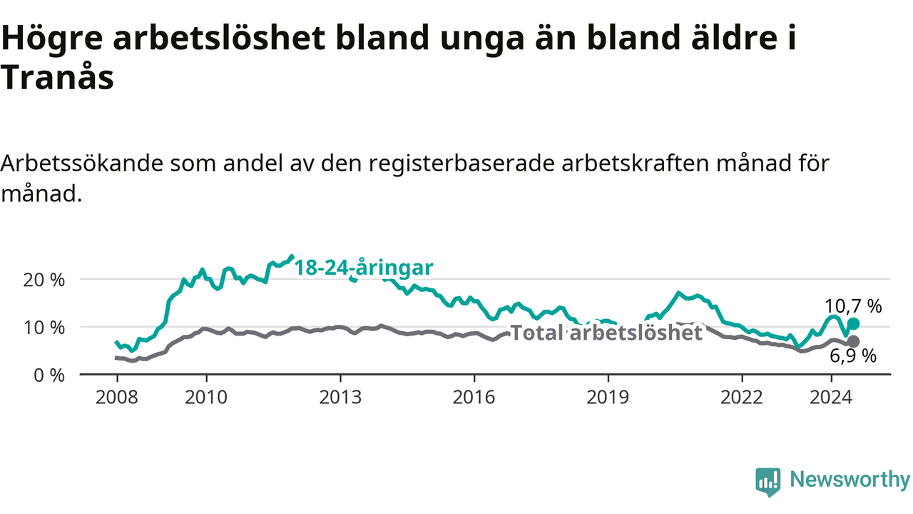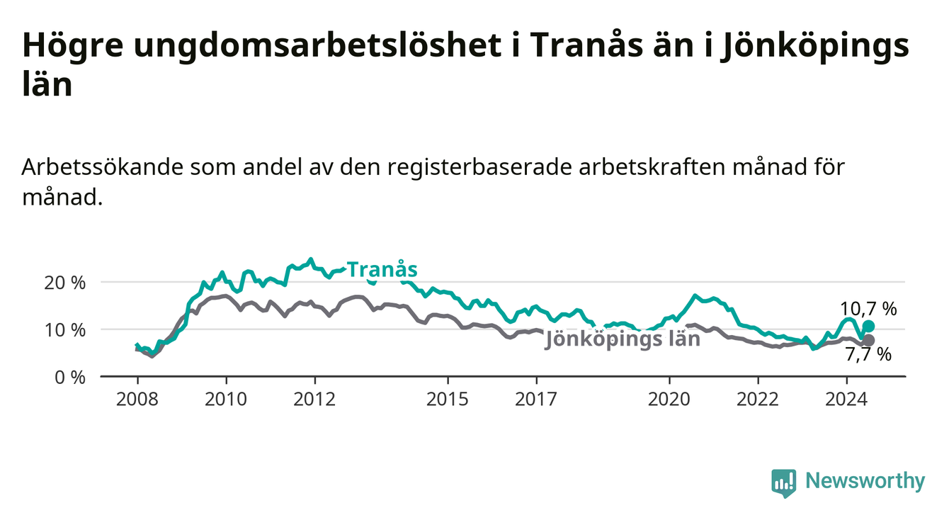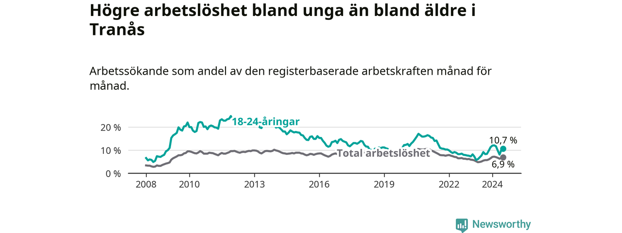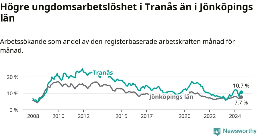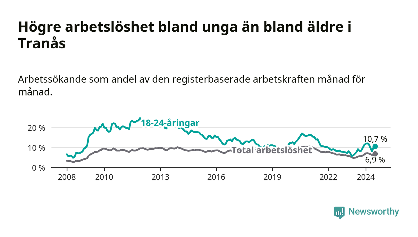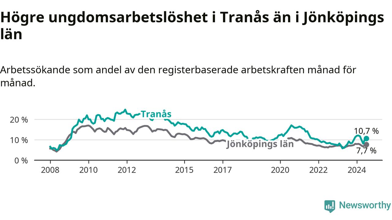 I och med den senaste månadens uppgång har de ungas arbetslöshet i Tranås stigit tolv månader i följd (upp från 7,7 procent i juli 2023 till 10,7 procent nu).