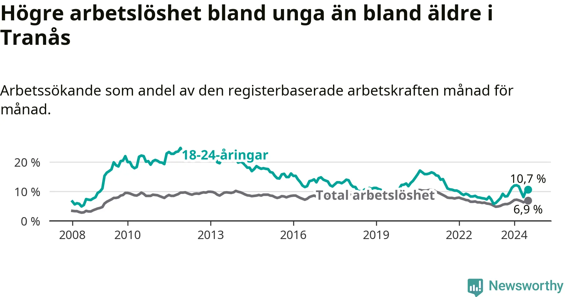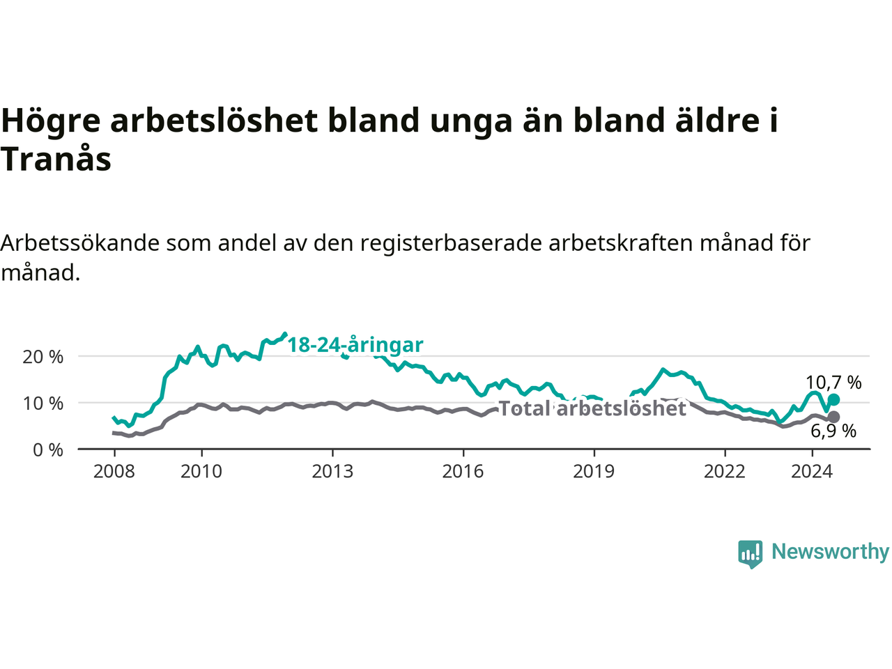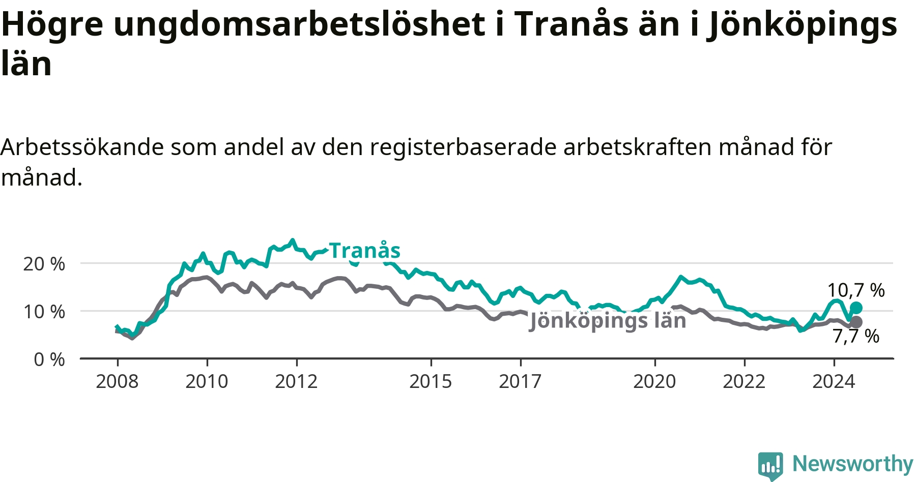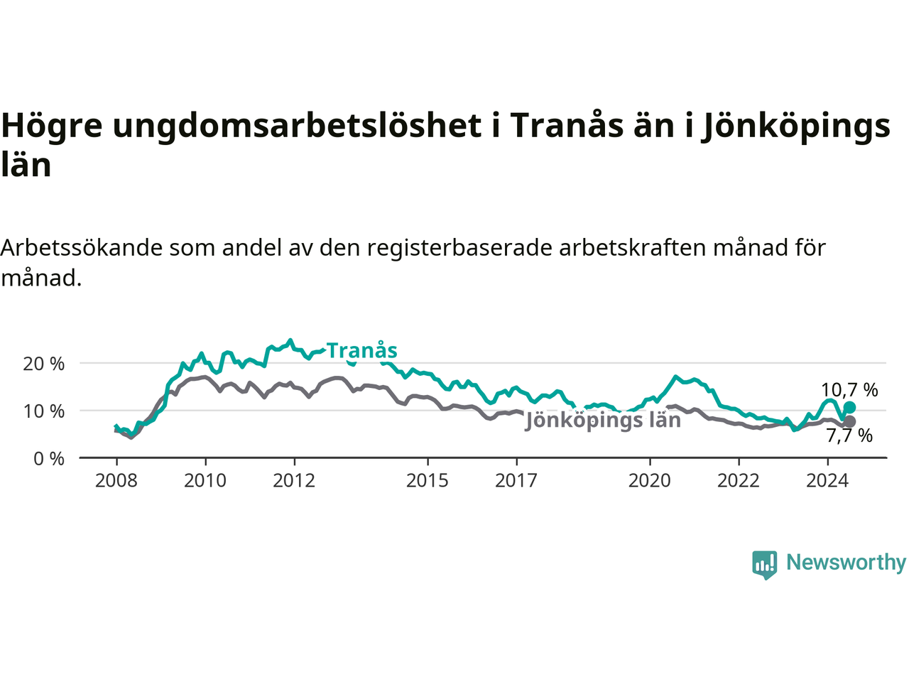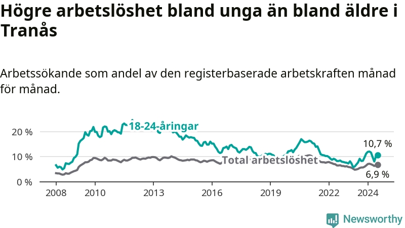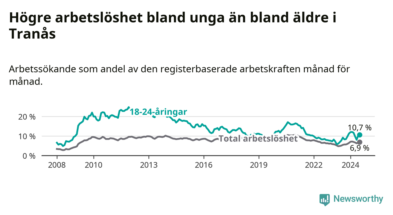 I och med den senaste månadens uppgång har de ungas arbetslöshet i Tranås stigit tolv månader i följd (upp från 7,7 procent i juli 2023 till 10,7 procent nu).