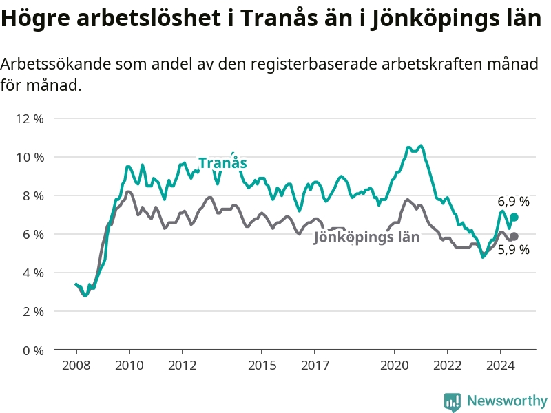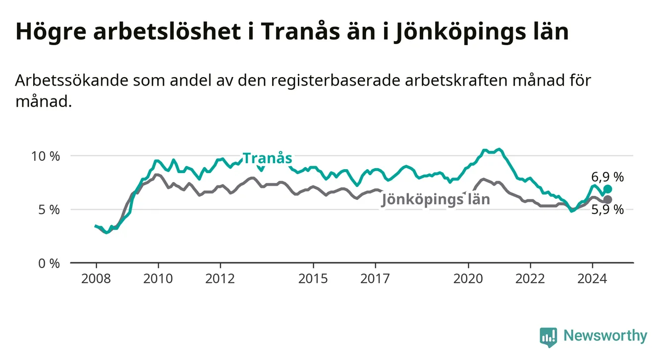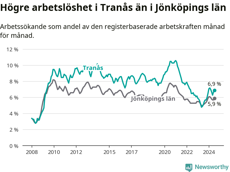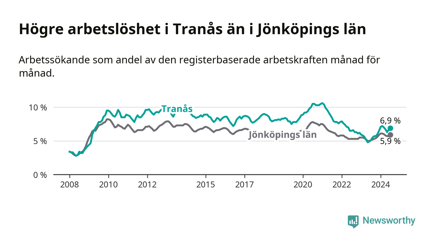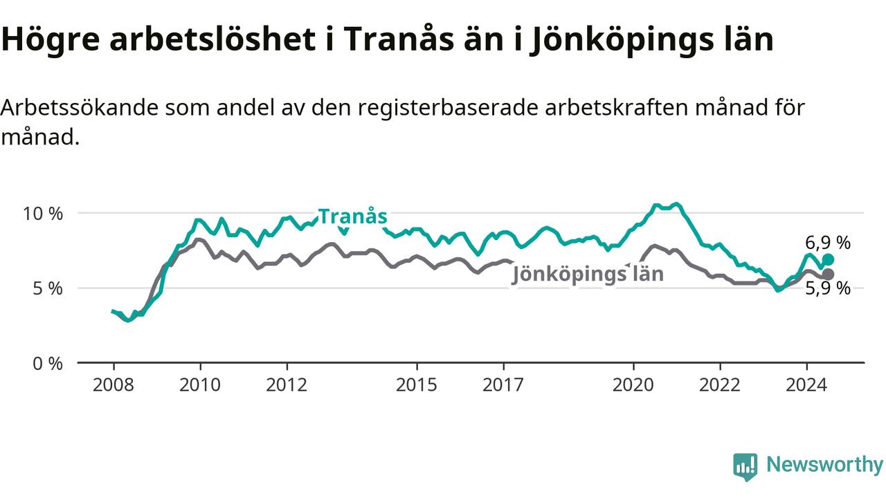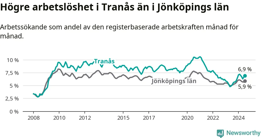 Under juli månad rapporterade Tranås kommun en total arbetslöshet på 6,9 procent. Det är en ökning jämfört med samma tidpunkt i fjol (+1,8 procentenheter). Även i Jönköpings län stiger arbetslösheten .
