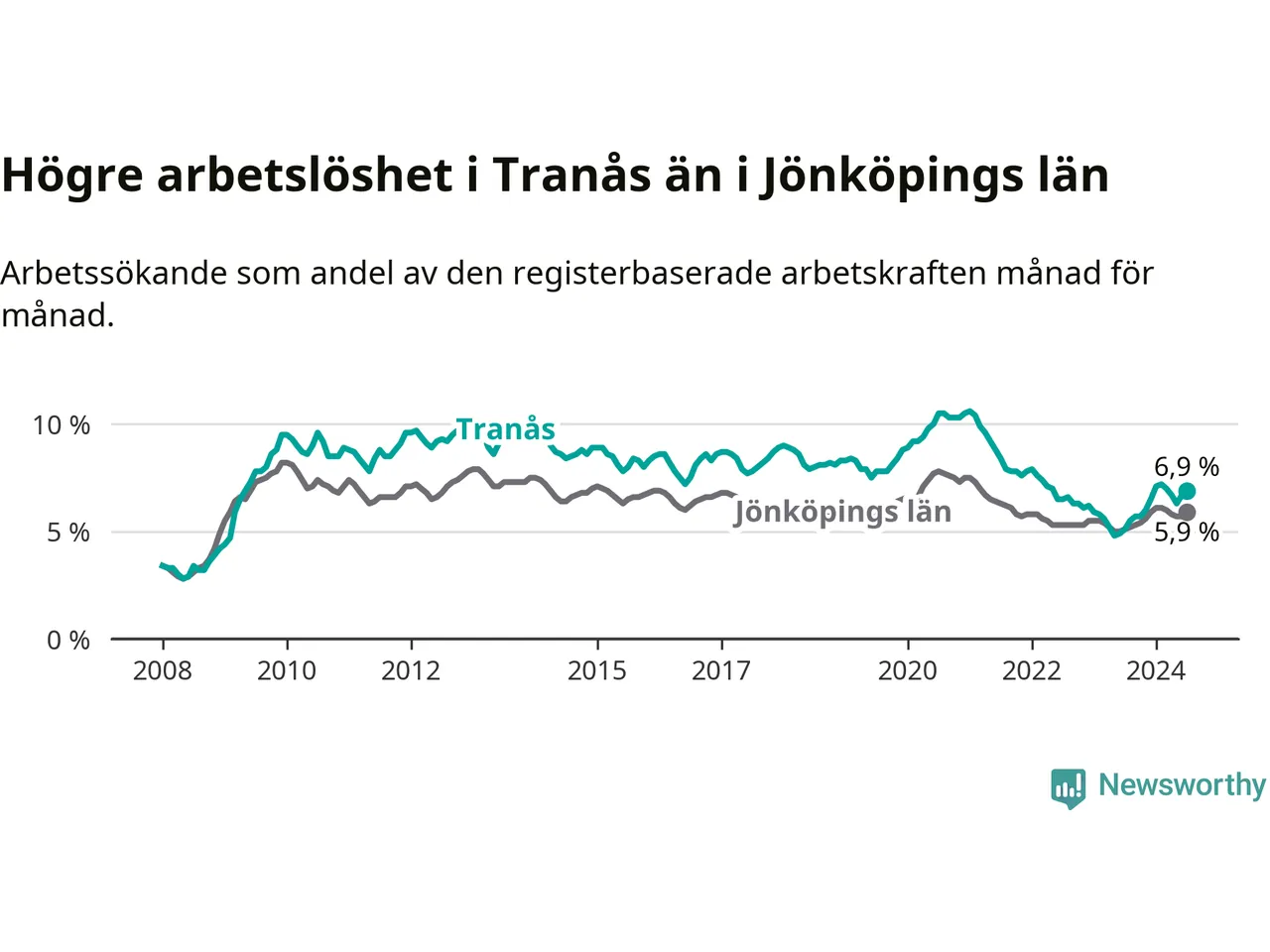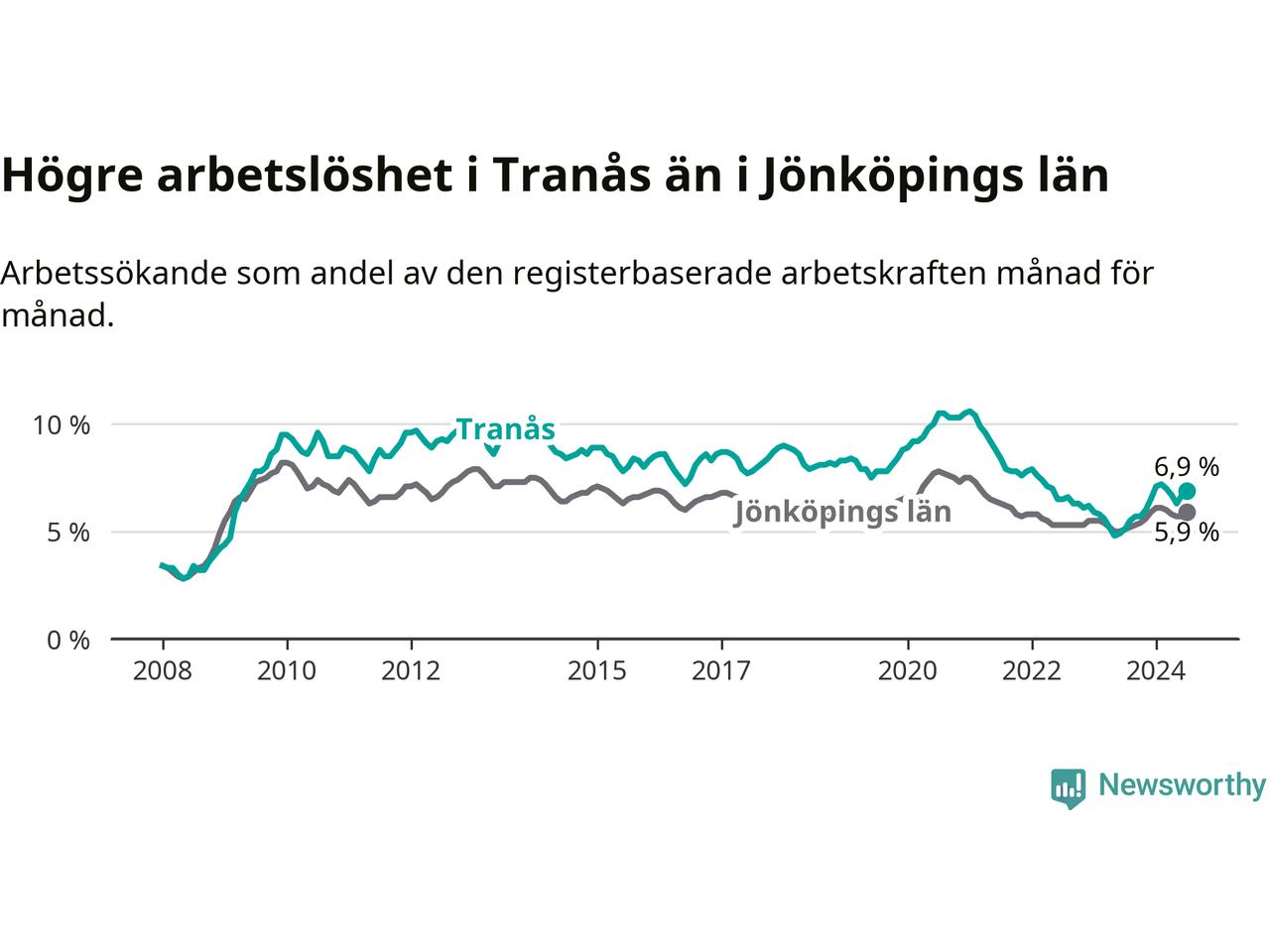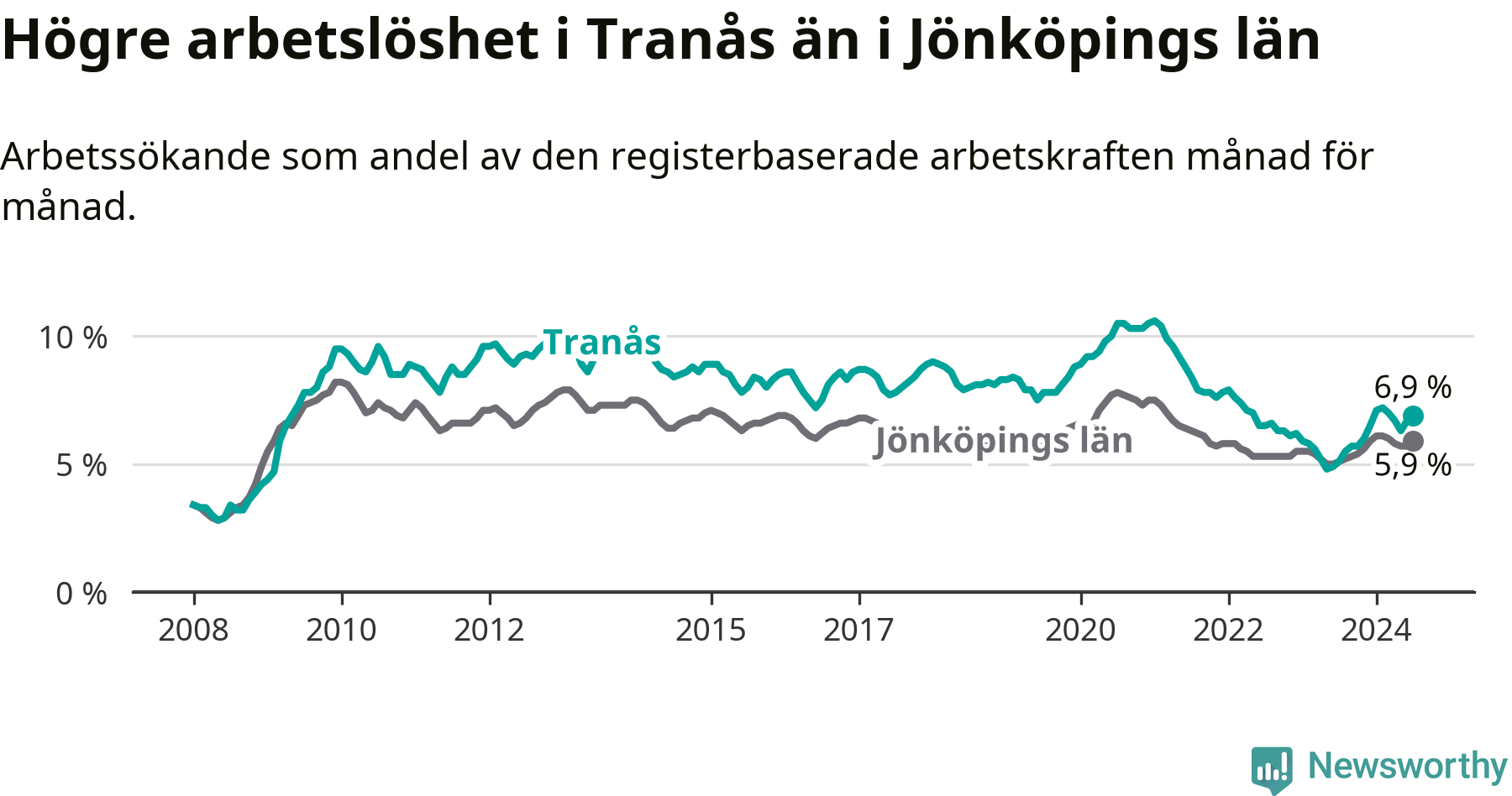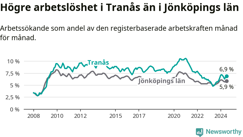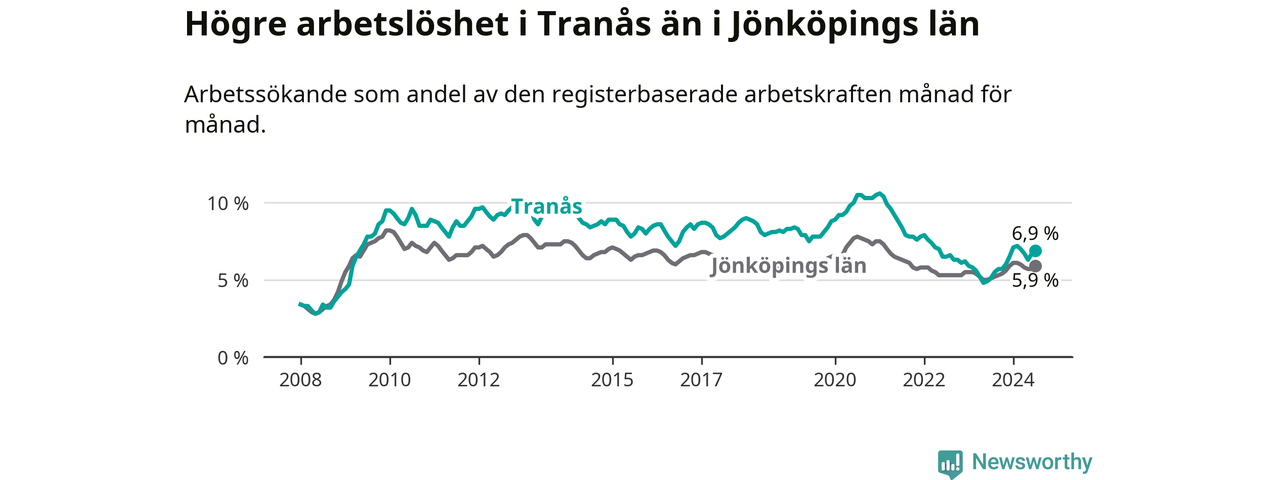 Under juli månad rapporterade Tranås kommun en total arbetslöshet på 6,9 procent. Det är en ökning jämfört med samma tidpunkt i fjol (+1,8 procentenheter). Även i Jönköpings län stiger arbetslösheten .