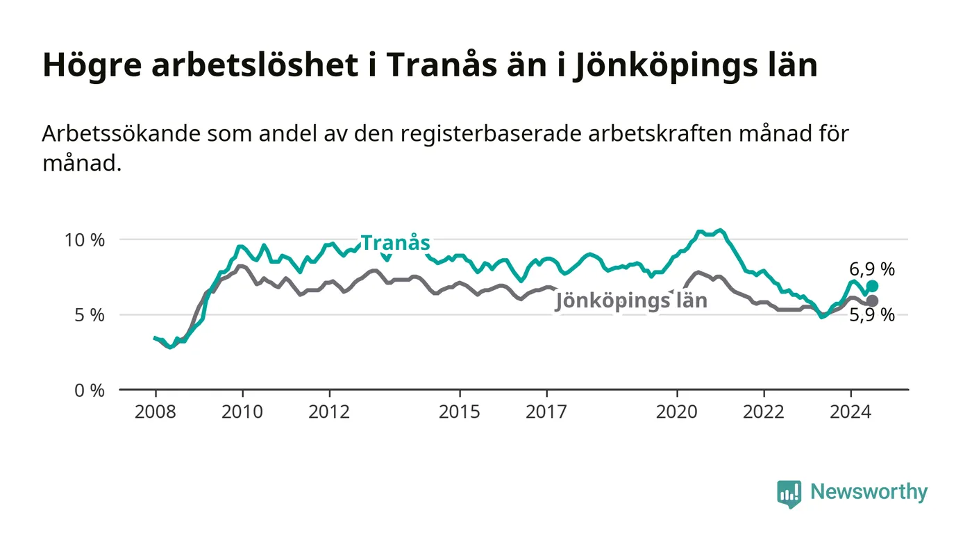 Tranås hade redan tidigare högre arbetslöshet än snittet i hela Jönköpings län och nu växer klyftan (6,9 procent i kommunen, jämfört med 5,9 procent i hela länet). Habo har den lägsta arbetslösheten i länet (3,7 procent), medan Sävsjö har den högsta (8,5 procent). För att Tranås skulle komma ner i samma arbetslöshetsnivå som Habo skulle 284 personer behöva sysselsättas.
