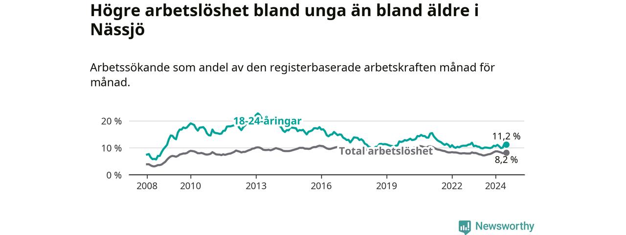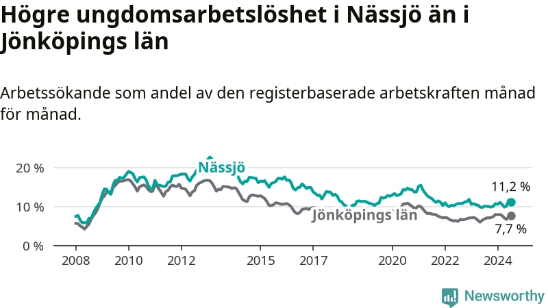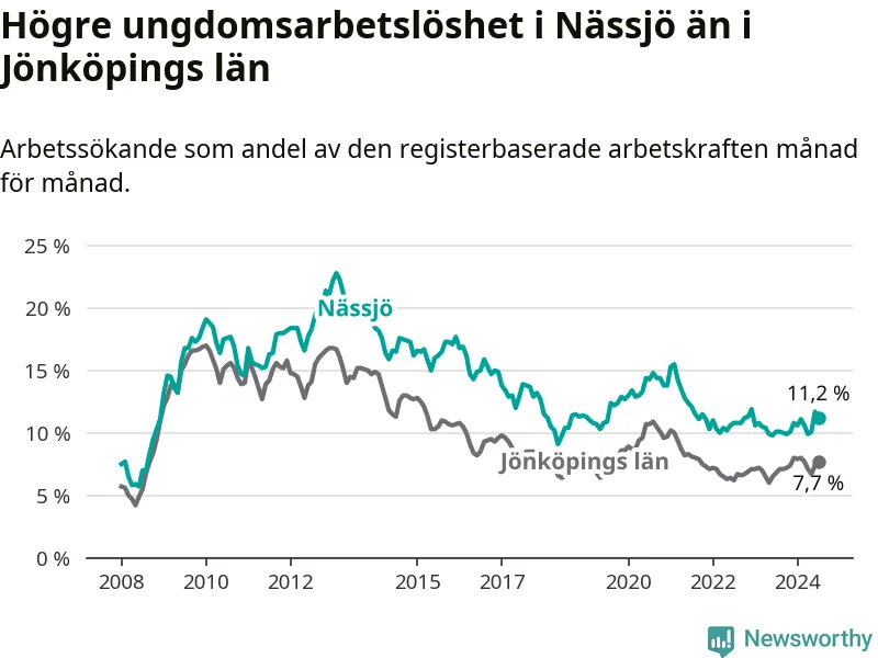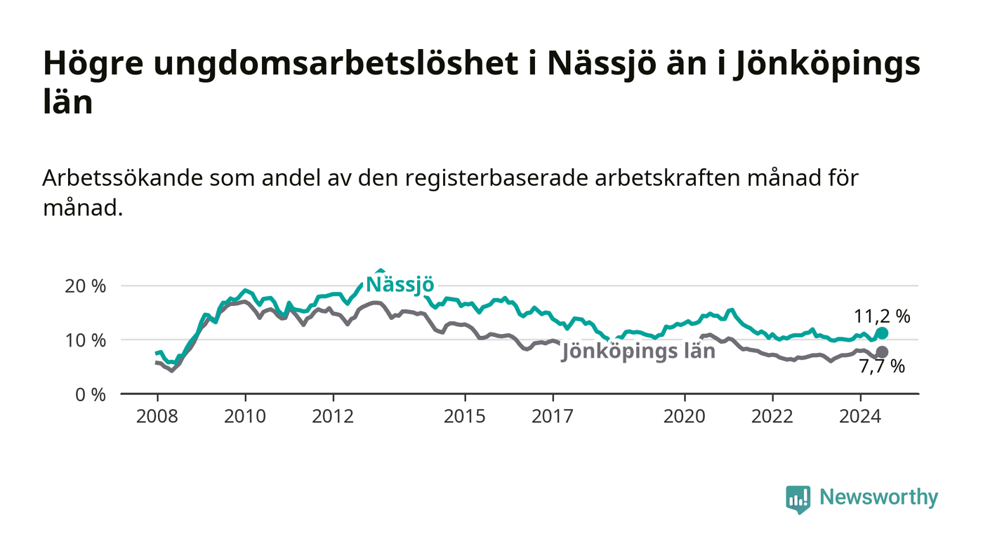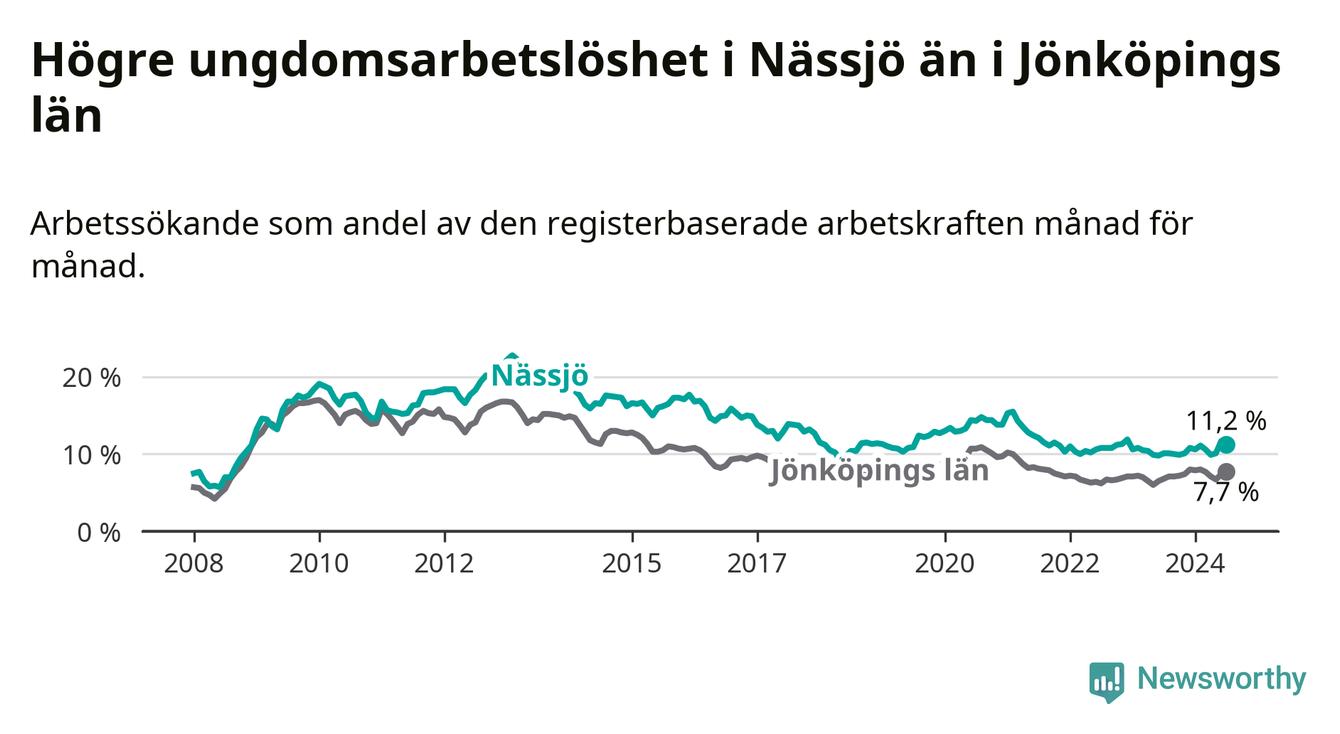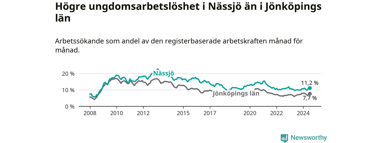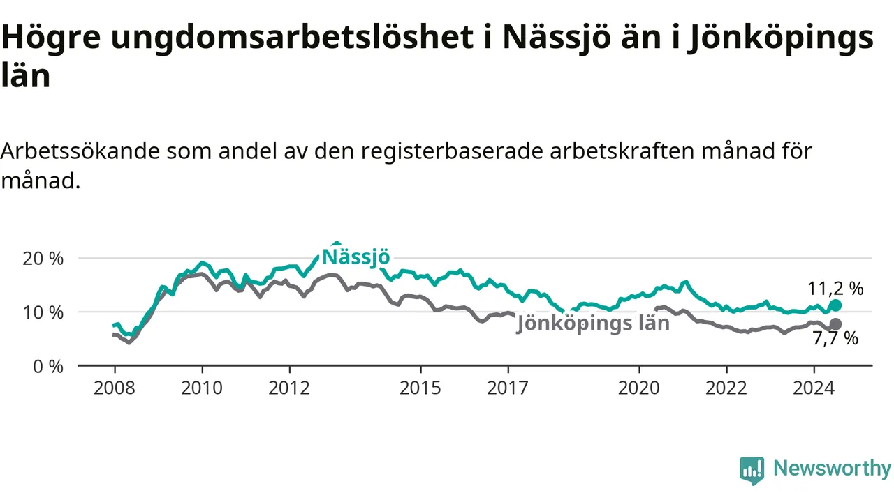 Precis som den totala arbetslösheten ligger ungdomsarbetslösheten i Nässjö högre än i Jönköpings län som helhet. Skillnaden mellan kommunen och länet är 3,5 procentenheter.
