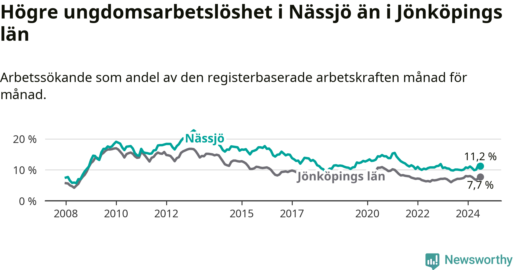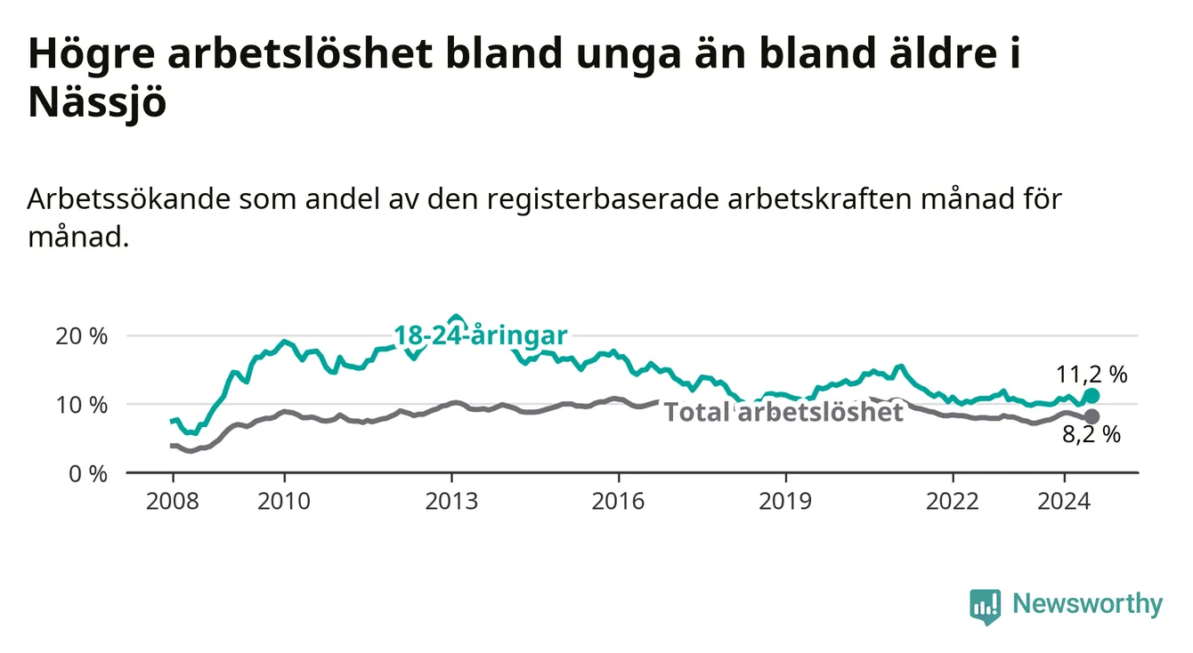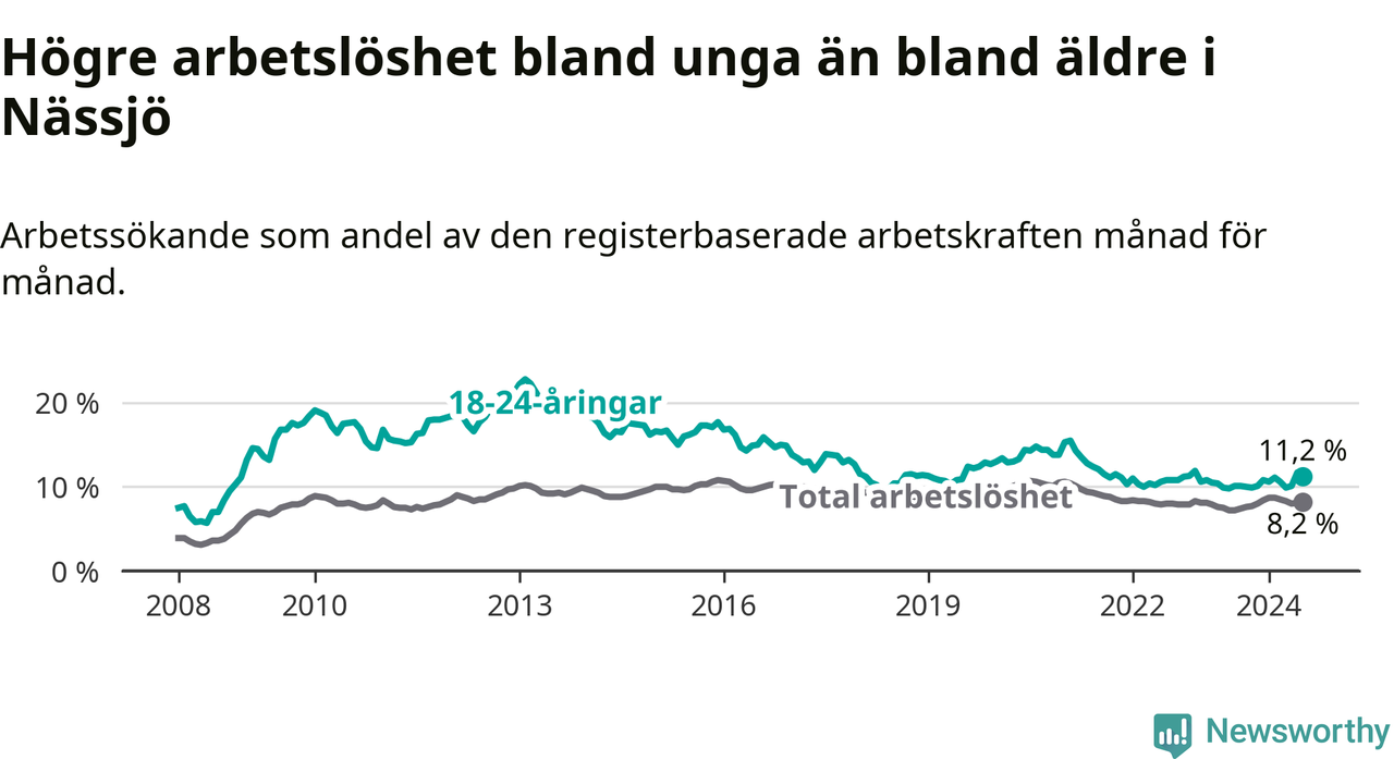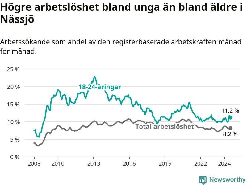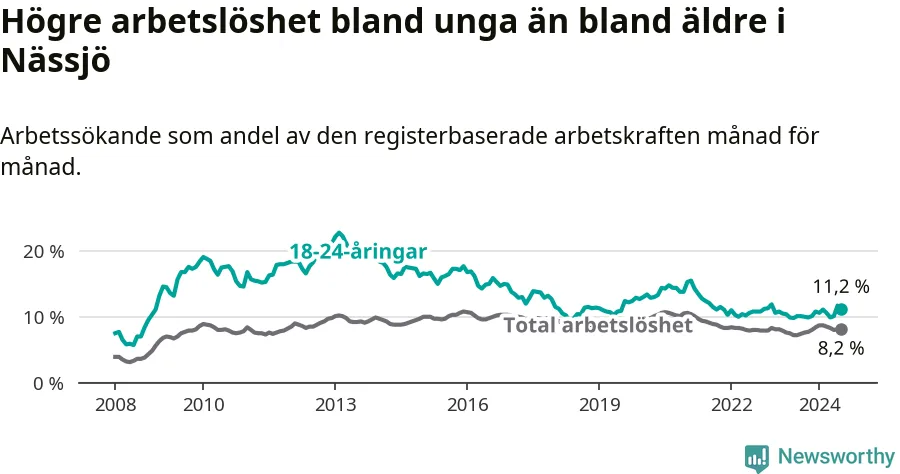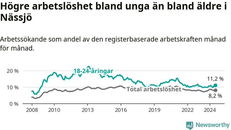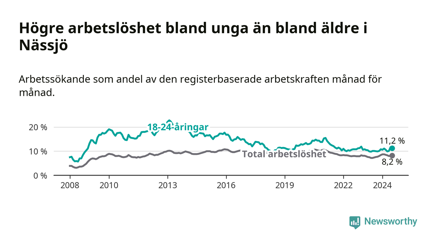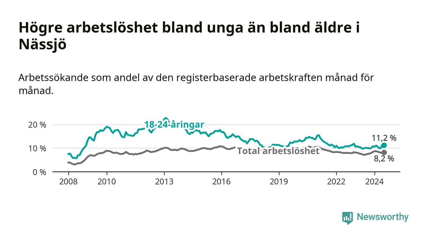 Precis som den totala arbetslösheten ligger ungdomsarbetslösheten i Nässjö högre än i Jönköpings län som helhet. Skillnaden mellan kommunen och länet är 3,5 procentenheter.