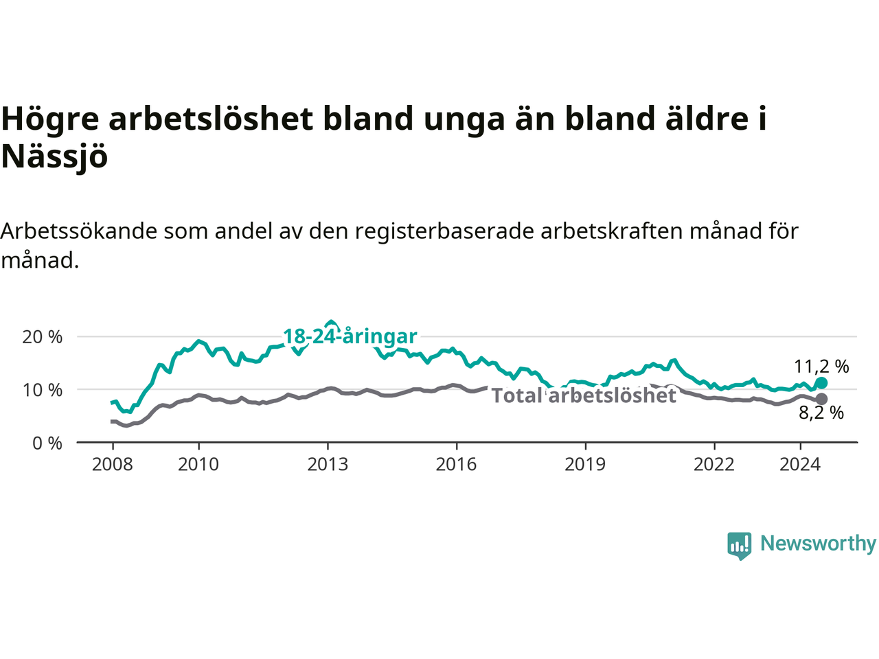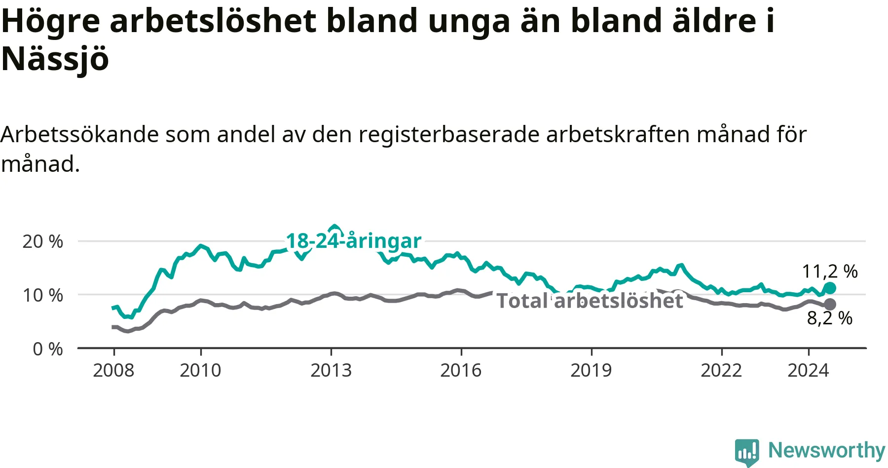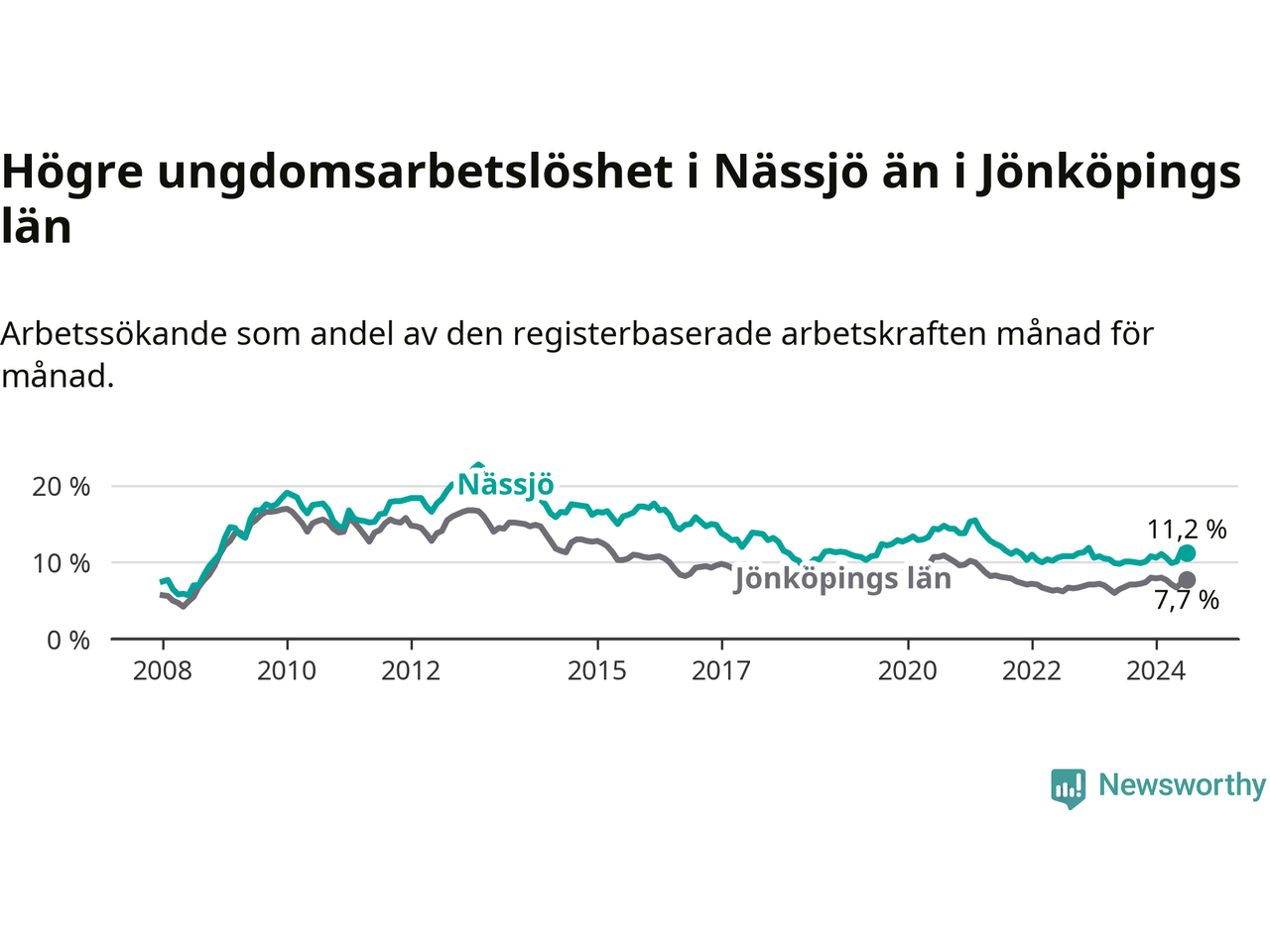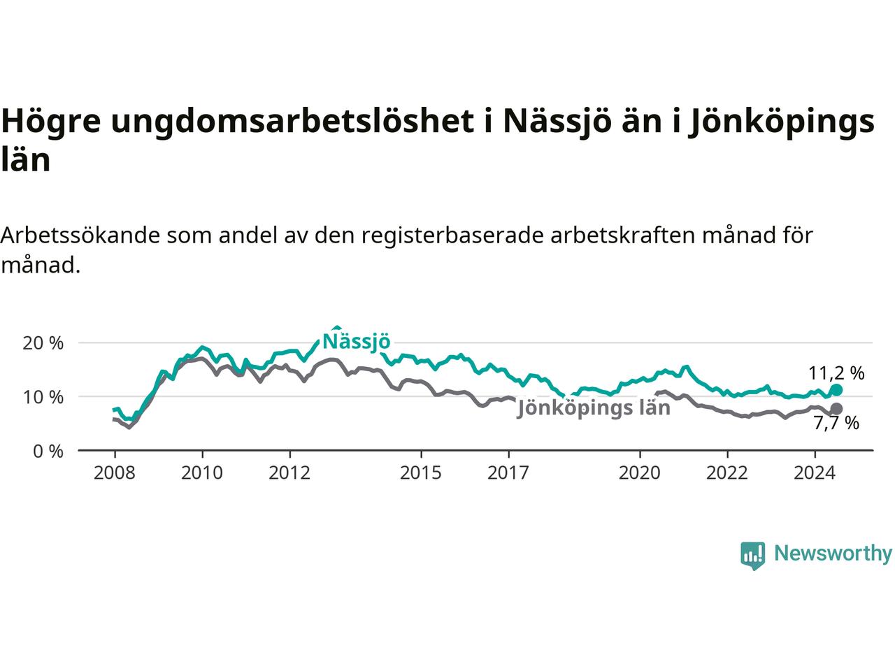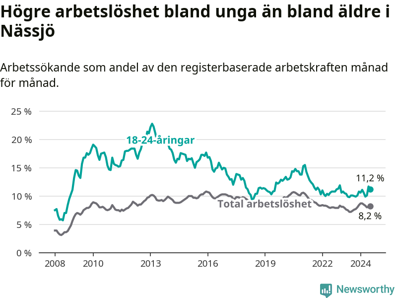 Precis som den totala arbetslösheten ligger ungdomsarbetslösheten i Nässjö högre än i Jönköpings län som helhet. Skillnaden mellan kommunen och länet är 3,5 procentenheter.
