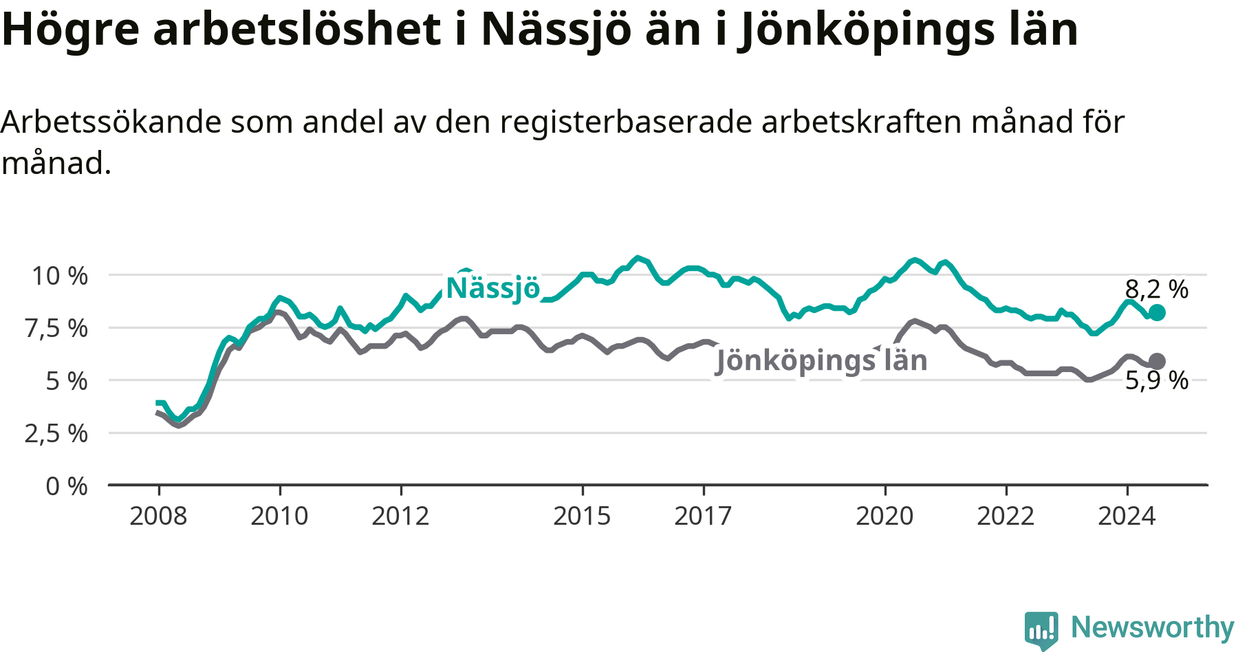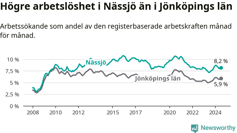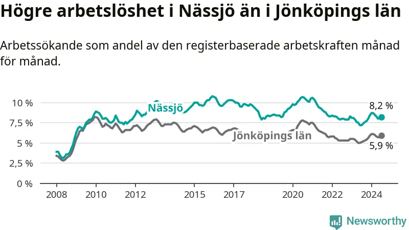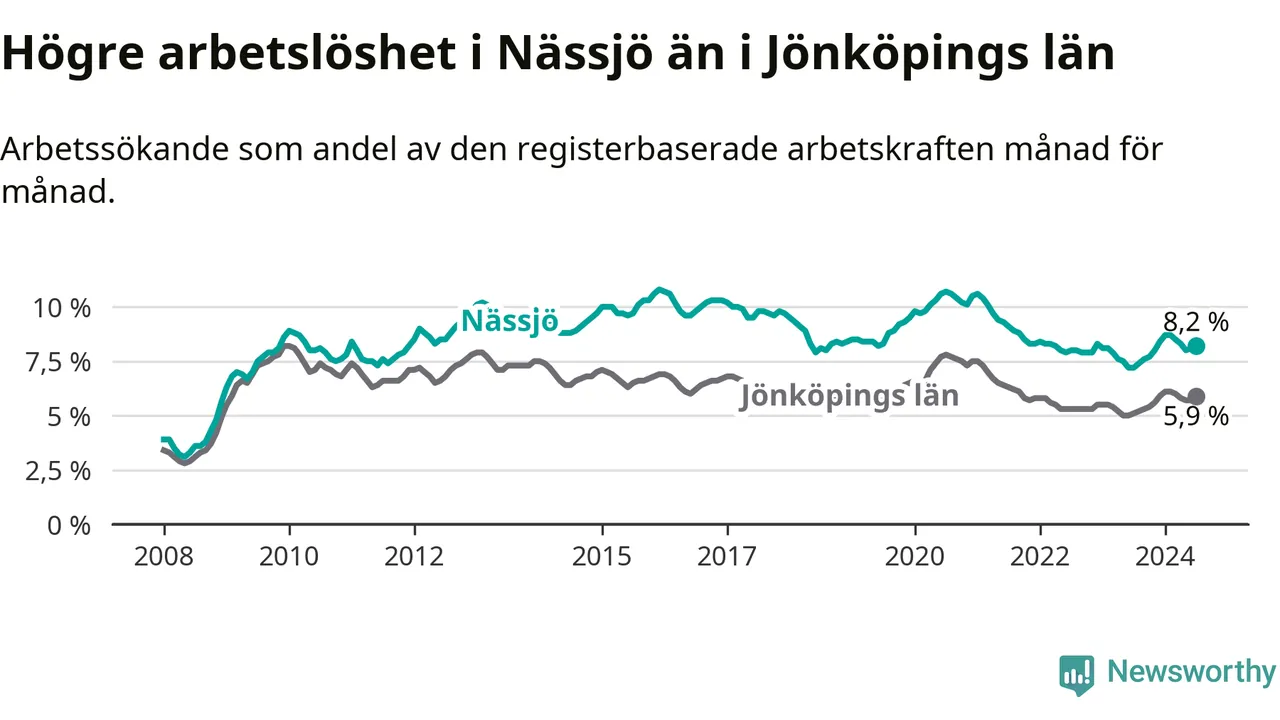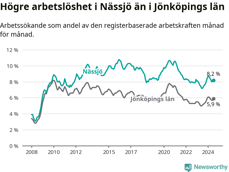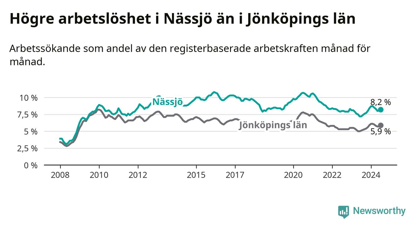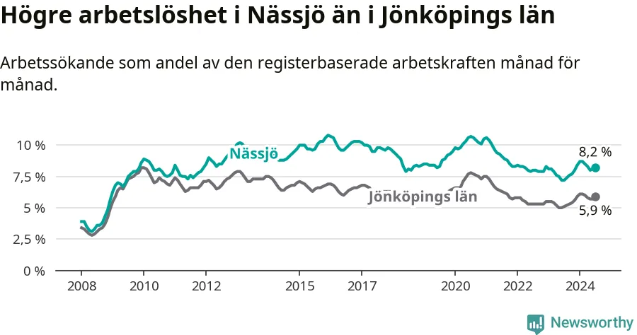 Under juli månad rapporterade Nässjö kommun en total arbetslöshet på 8,2 procent. Det är en ökning jämfört med samma tidpunkt i fjol (+1,0 procentenheter). Även i Jönköpings län stiger arbetslösheten .