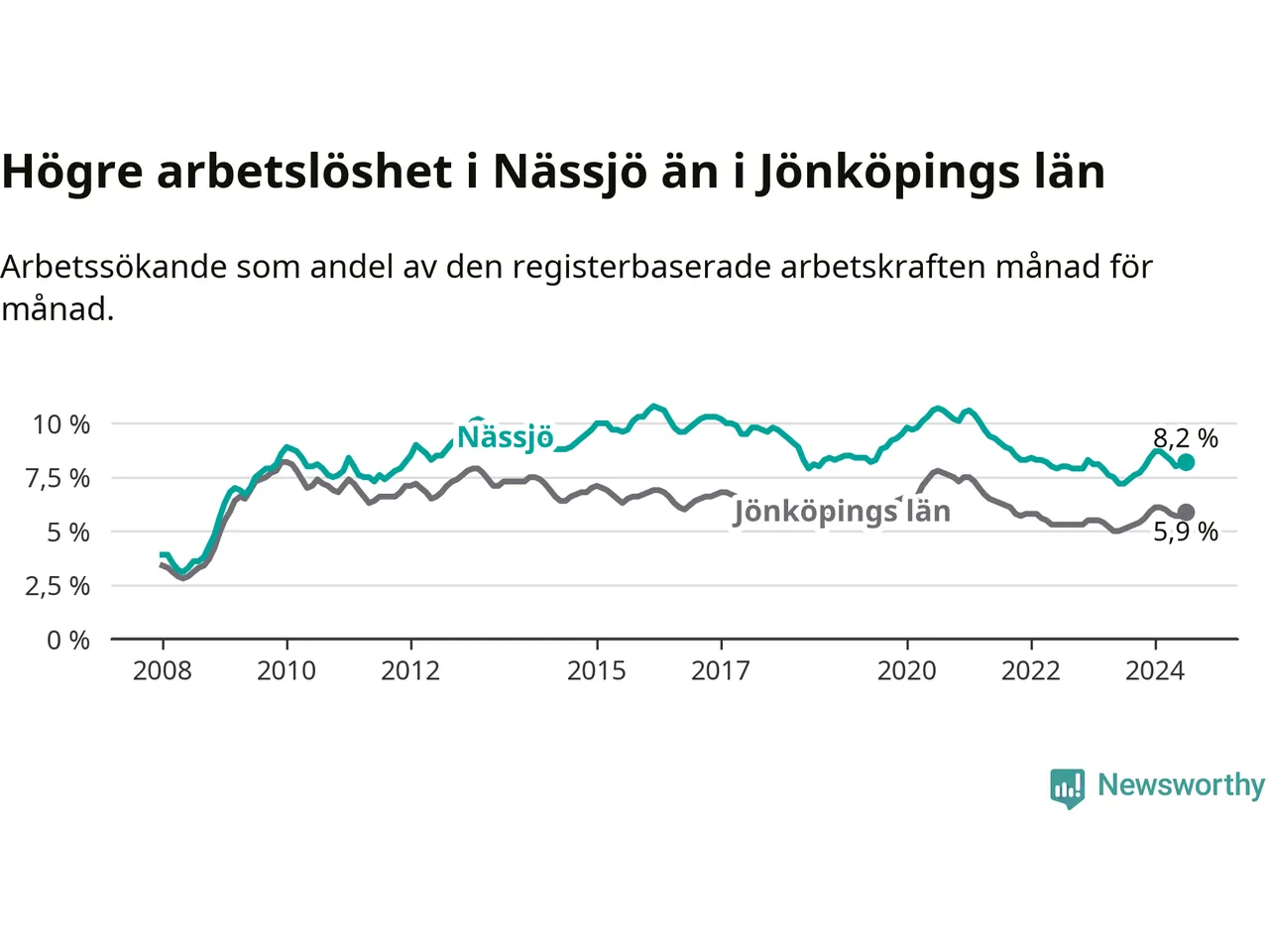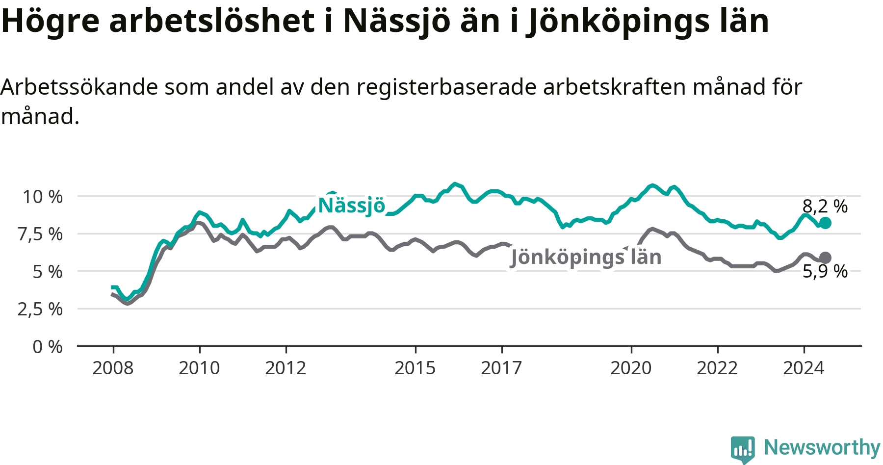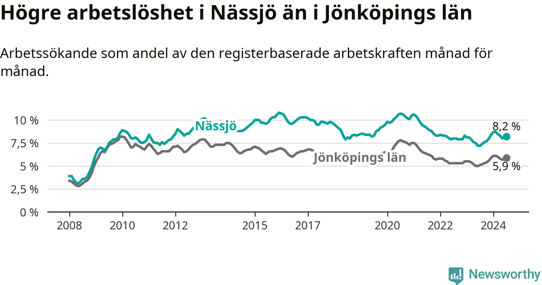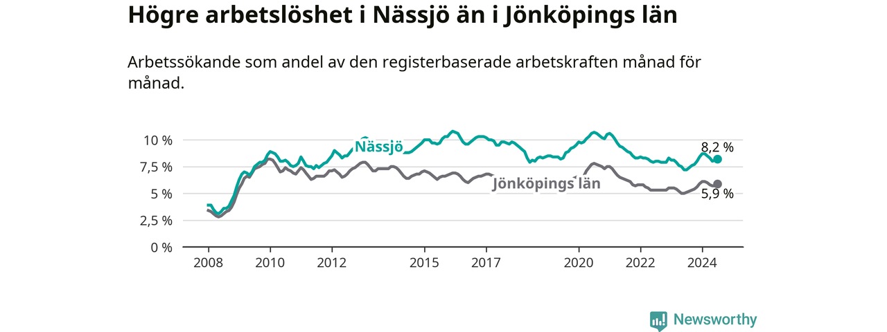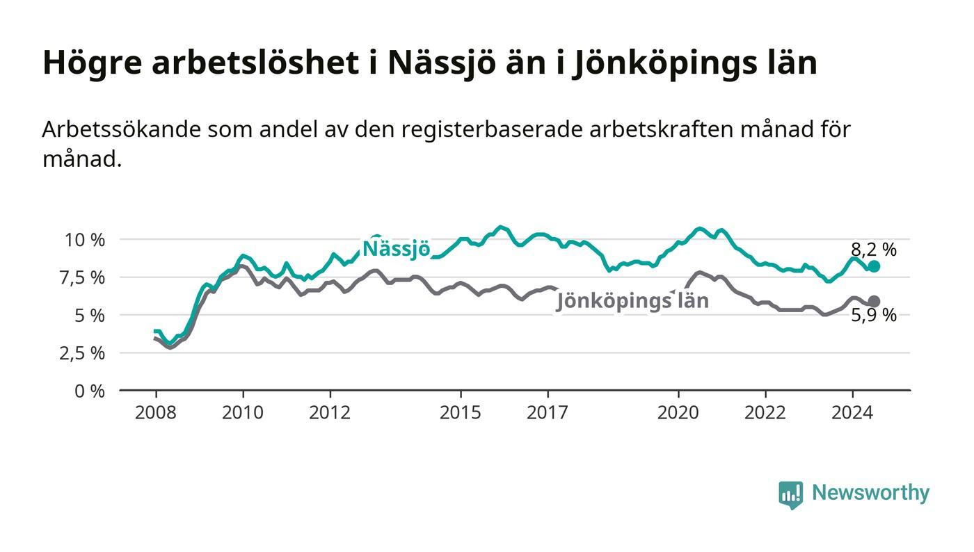 Nässjö hade redan tidigare högre arbetslöshet än snittet i hela Jönköpings län och nu växer klyftan (8,2 procent i kommunen, jämfört med 5,9 procent i hela länet). Habo har den lägsta arbetslösheten i länet (3,7 procent), medan Sävsjö har den högsta (8,5 procent). För att Nässjö skulle komma ner i samma arbetslöshetsnivå som Habo skulle 695 personer behöva sysselsättas.