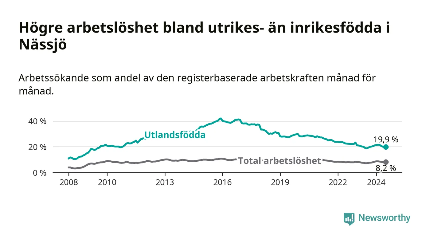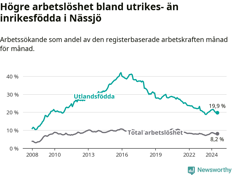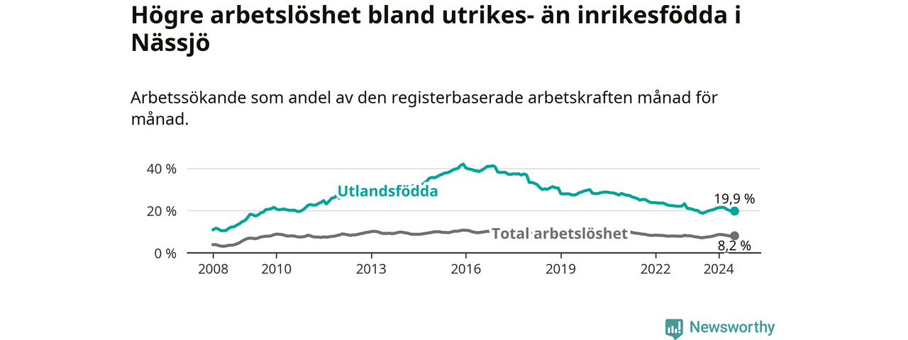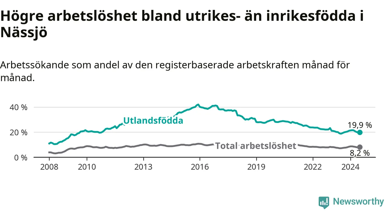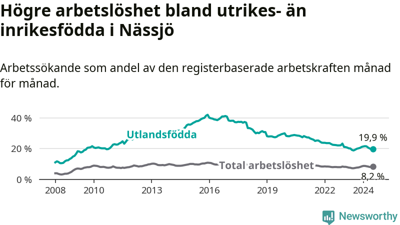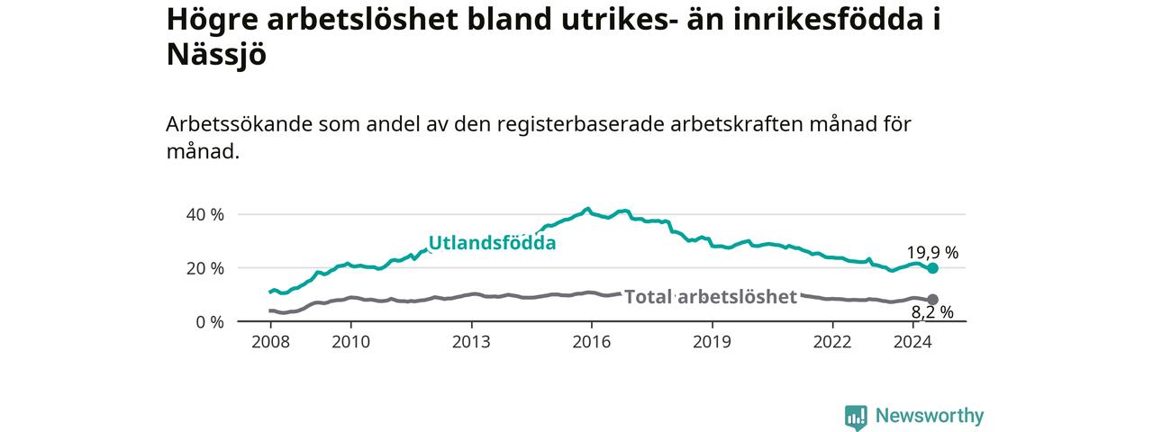 Arbetslösheten bland utlandsfödda var 19,9 procent i Nässjö under juli månad, motsvarande 784 av 3 940 personer. Det är 1,1 procentenheter fler än vid samma tidpunkt i fjol (−342 om man räknar personer).
