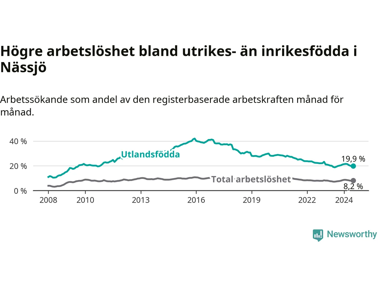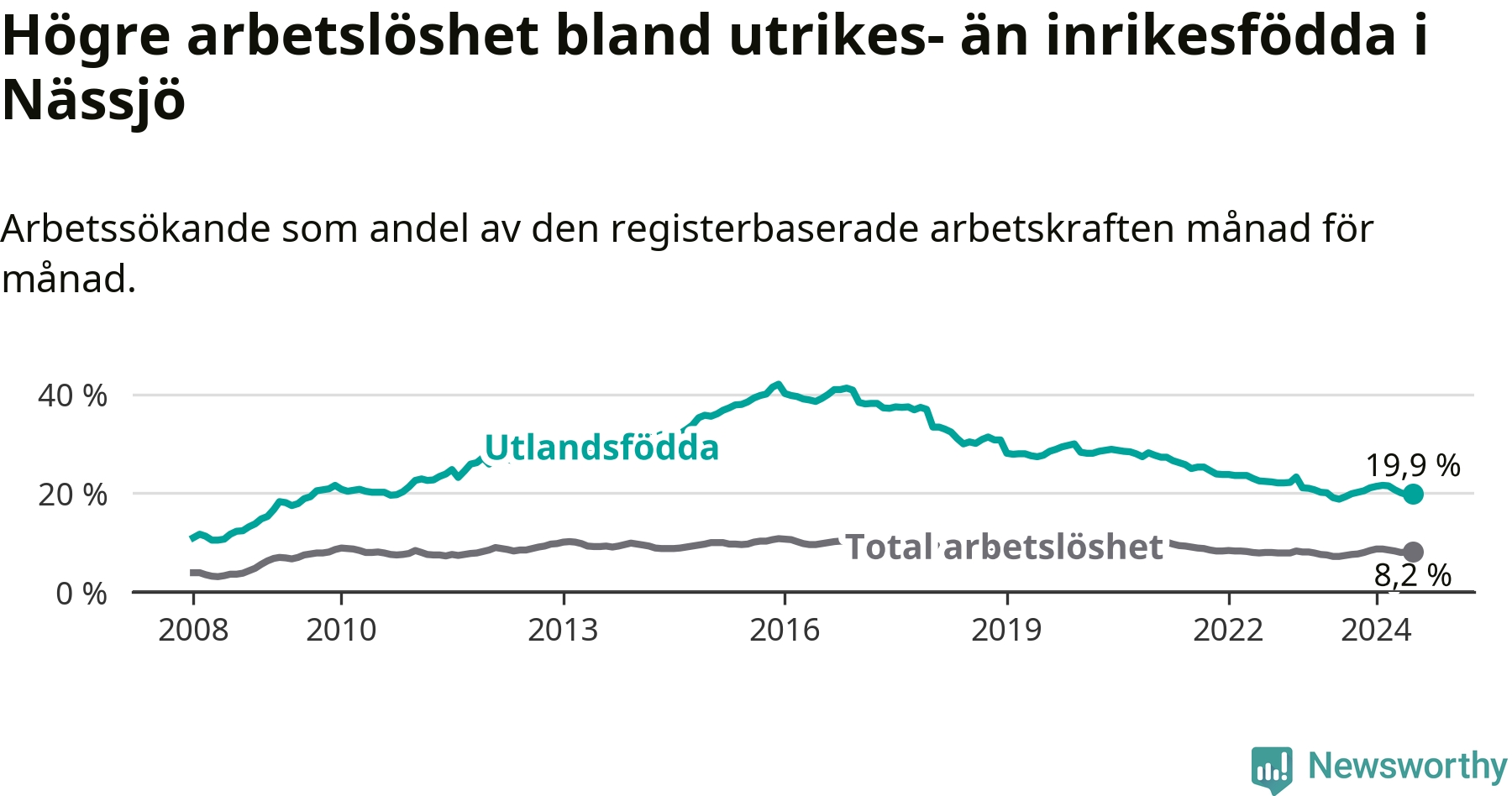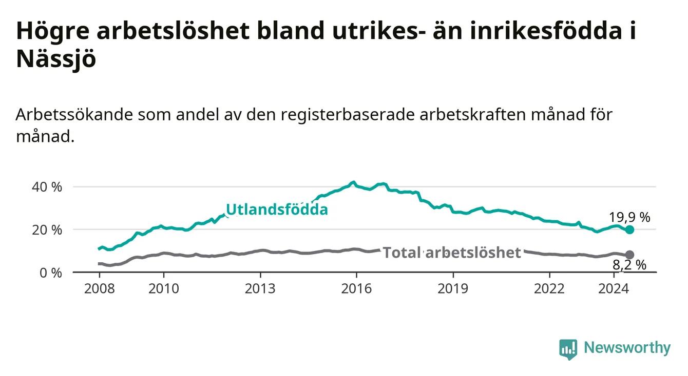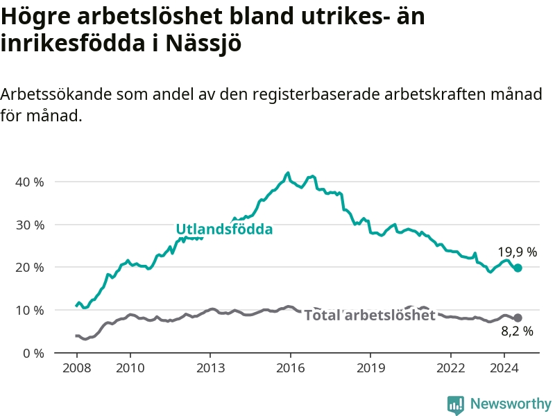 Arbetslösheten bland utlandsfödda var 19,9 procent i Nässjö under juli månad, motsvarande 784 av 3 940 personer. Det är 1,1 procentenheter fler än vid samma tidpunkt i fjol (−342 om man räknar personer).