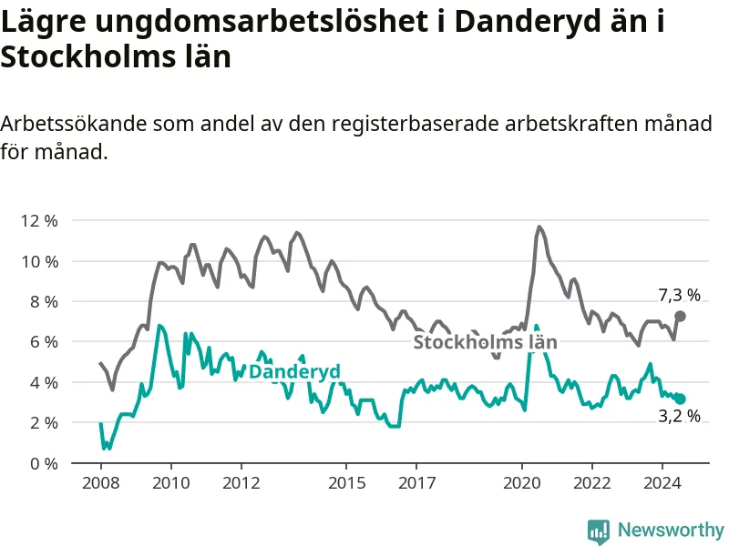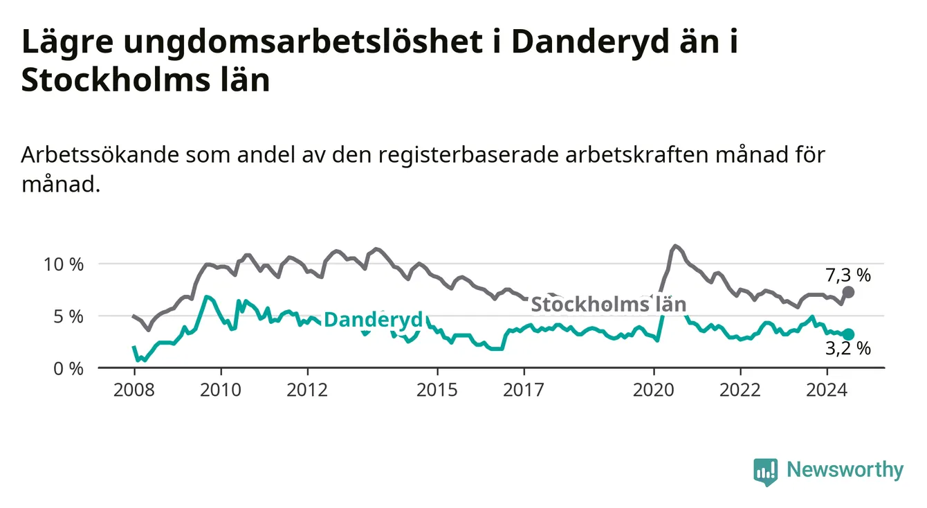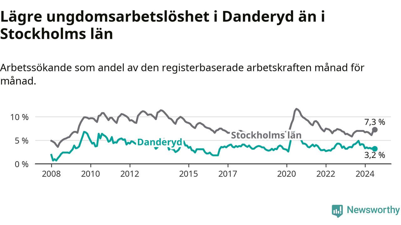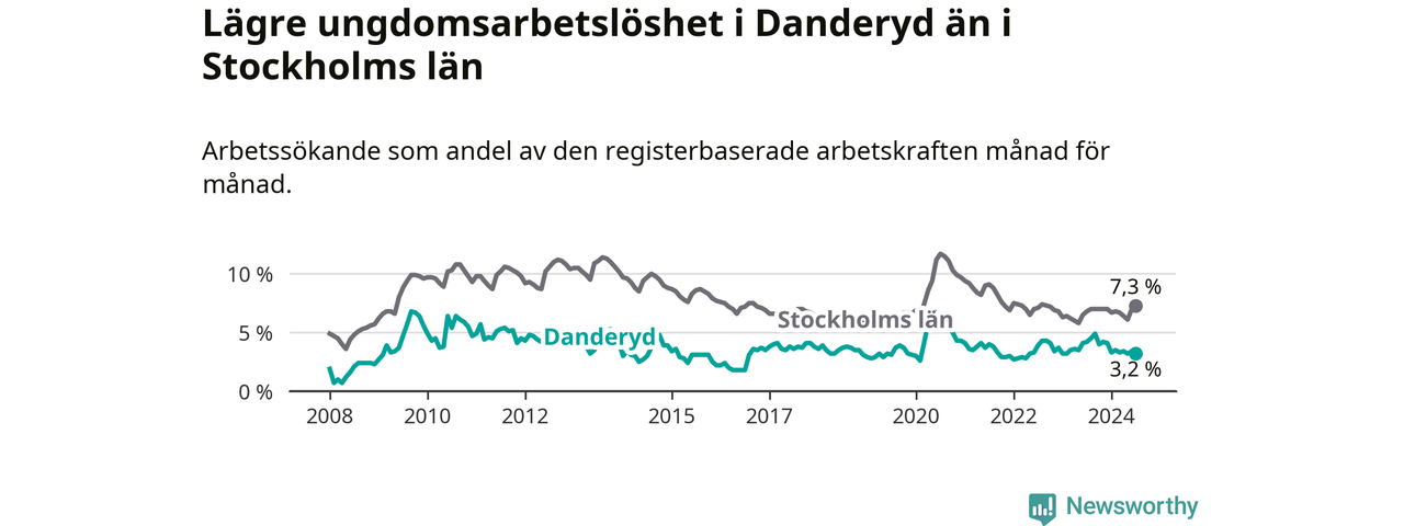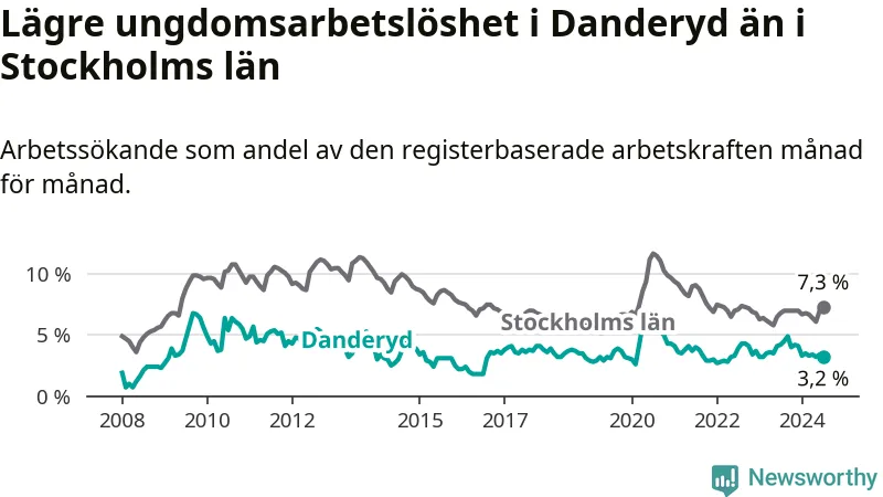 Precis som den totala arbetslösheten ligger ungdomsarbetslösheten i Danderyd lägre än i Stockholms län som helhet. Skillnaden mellan kommunen och länet är 4,1 procentenheter.