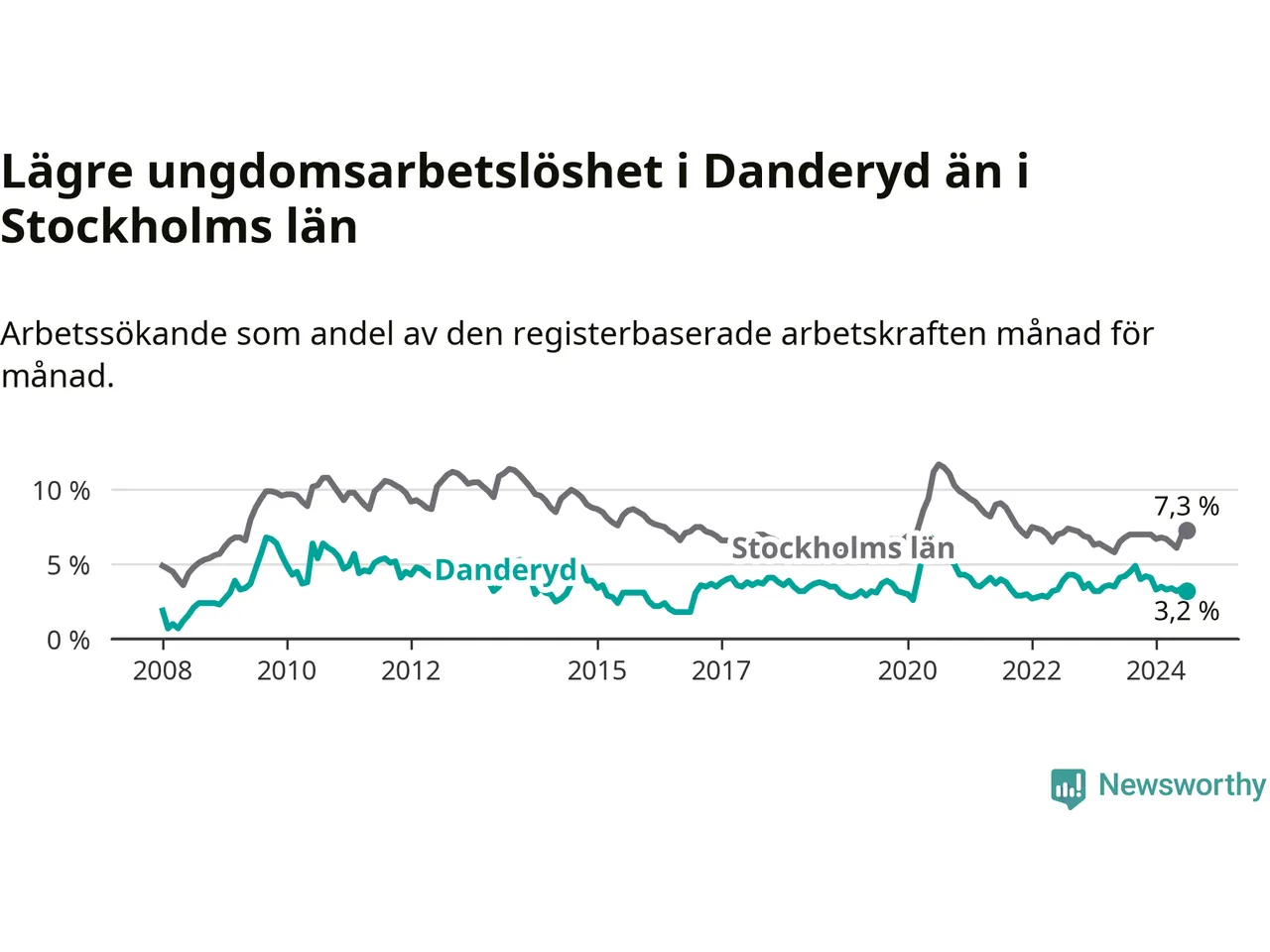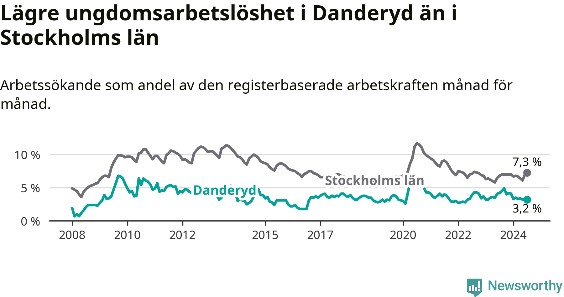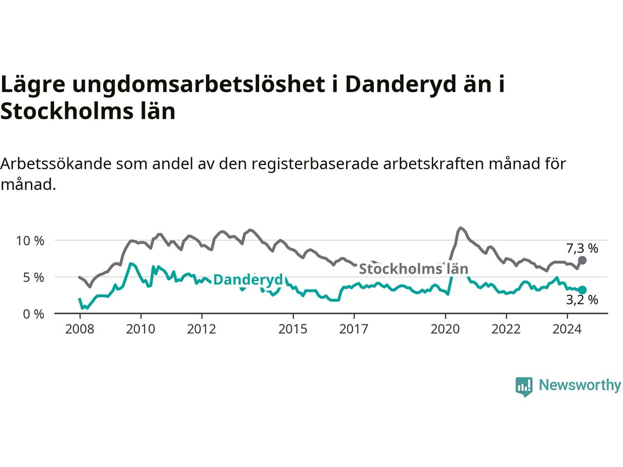 Precis som den totala arbetslösheten ligger ungdomsarbetslösheten i Danderyd lägre än i Stockholms län som helhet. Skillnaden mellan kommunen och länet är 4,1 procentenheter.