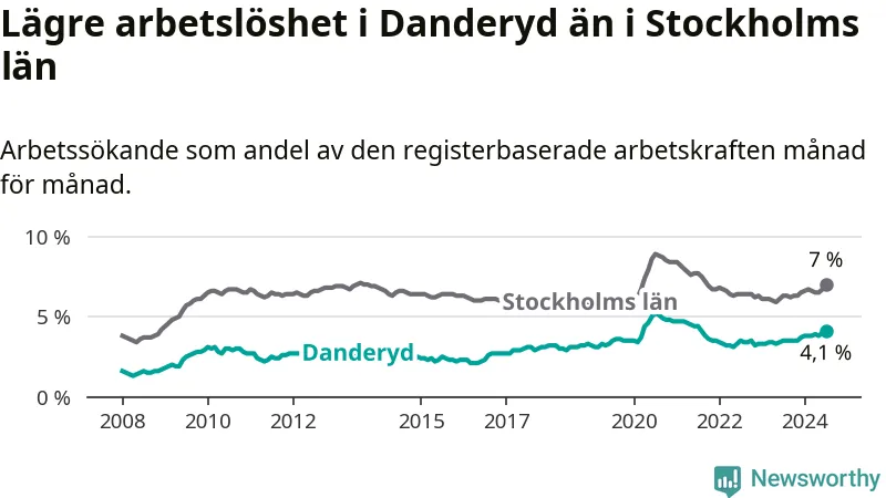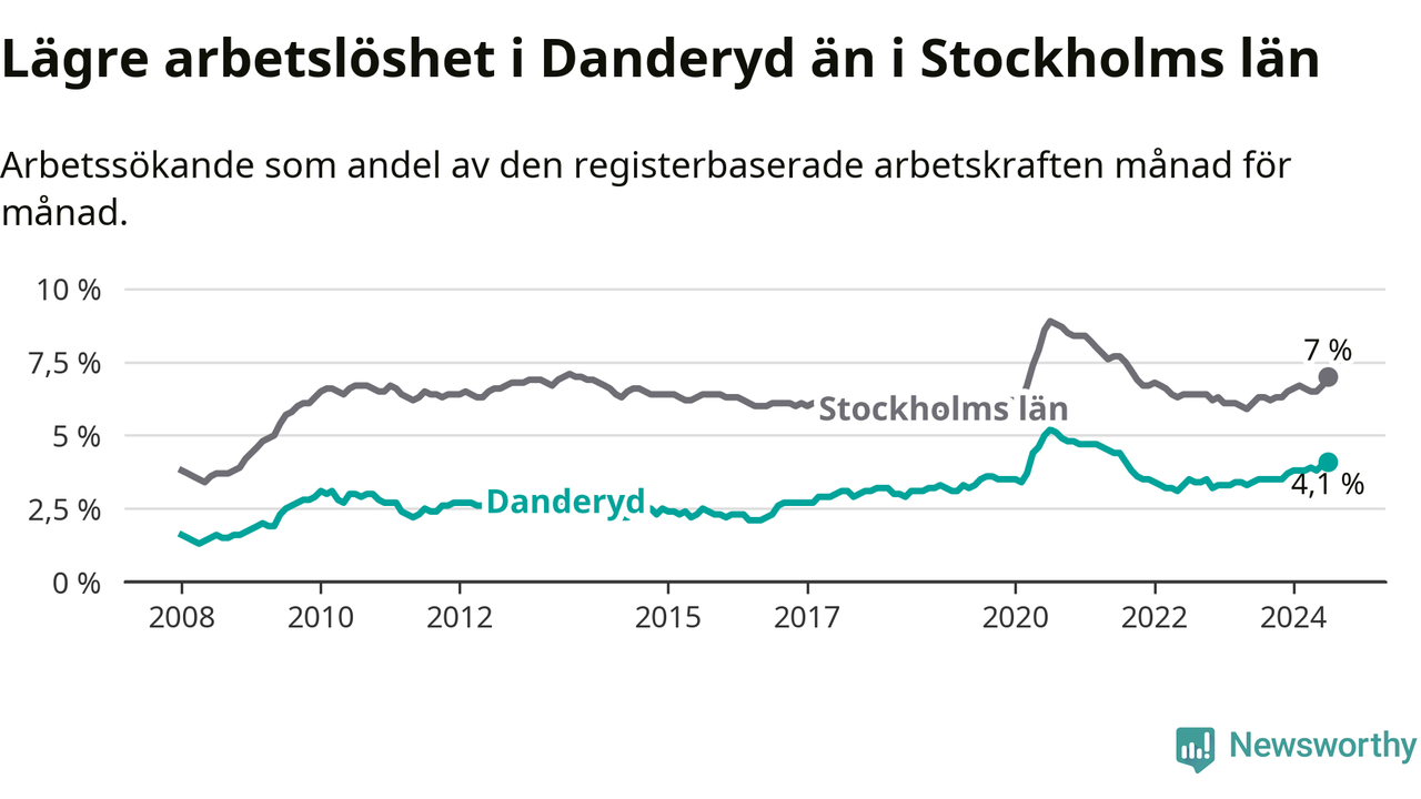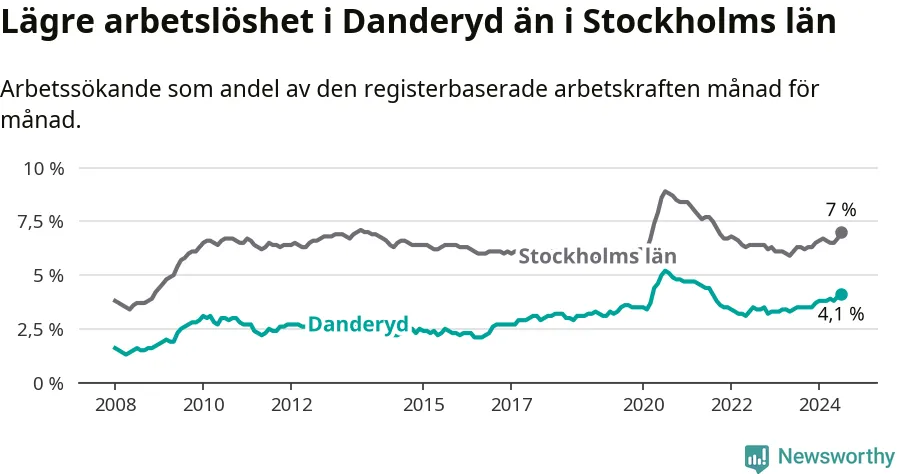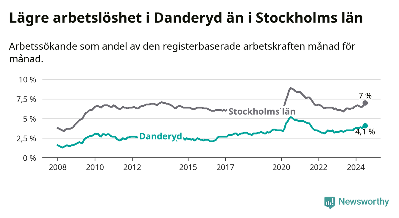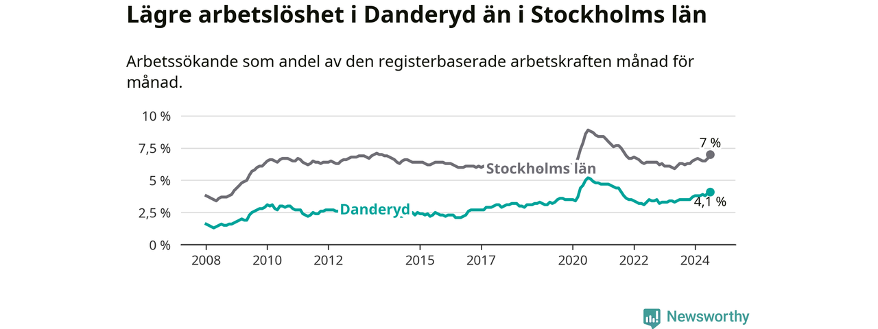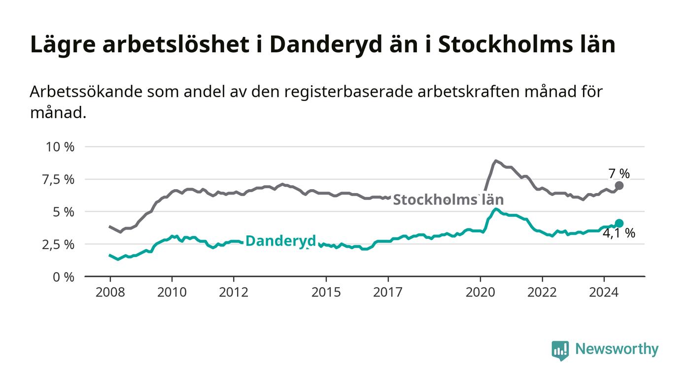 Även om arbetslösheten i Danderyd alltså ökar, så ligger den fortfarande under snittet i hela Stockholms län (4,1 procent i kommunen, jämfört med 7,0 procent i hela länet). Ekerö har den lägsta arbetslösheten i länet (3,5 procent), medan Södertälje har den högsta (11,0 procent). För att Danderyd skulle komma ner i samma arbetslöshetsnivå som Ekerö skulle 88 personer behöva sysselsättas.