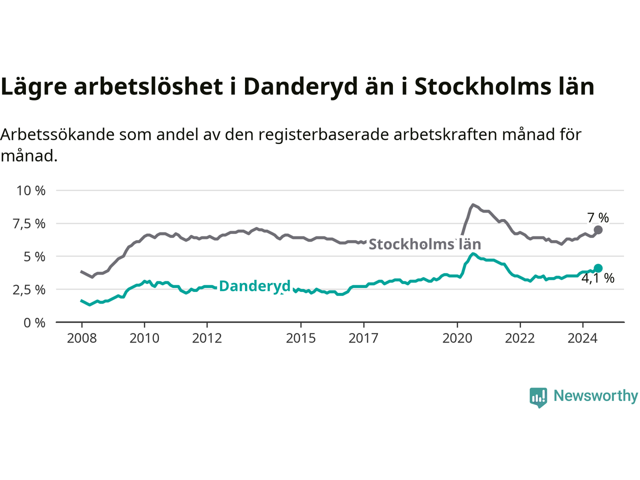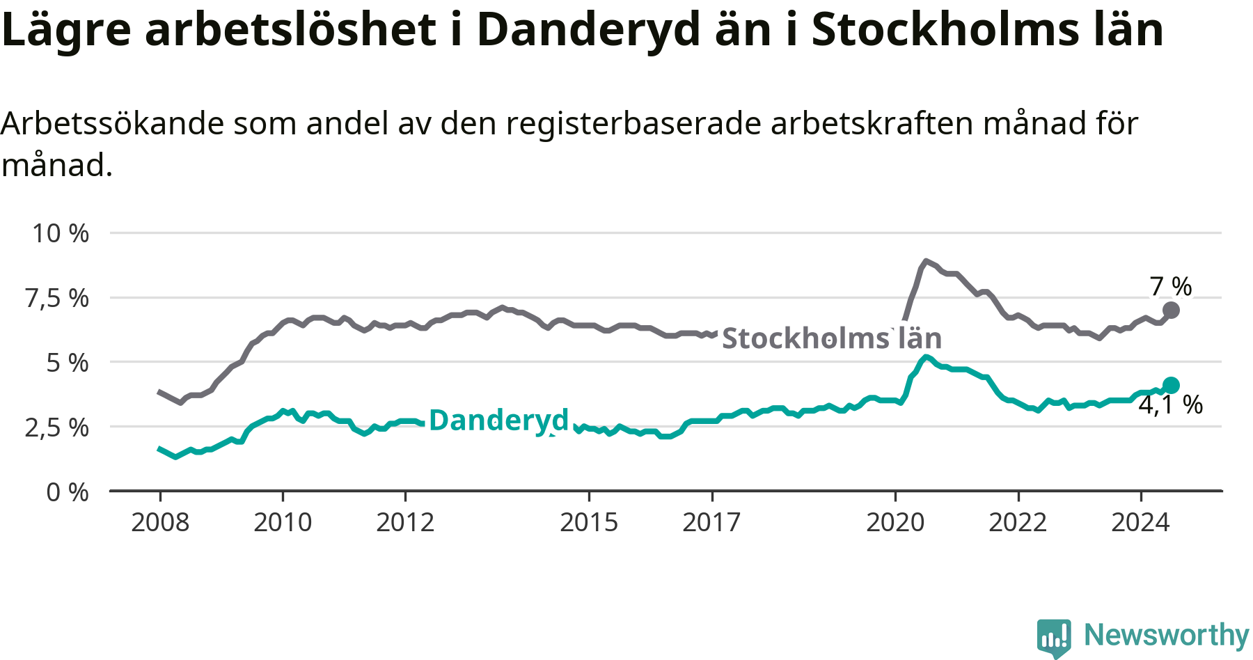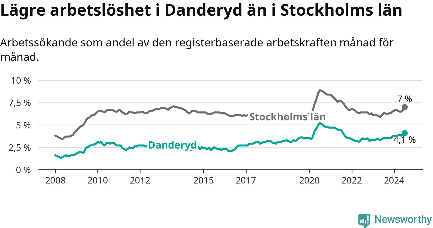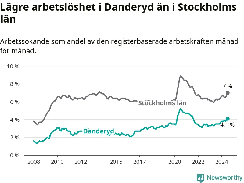 Även om arbetslösheten i Danderyd alltså ökar, så ligger den fortfarande under snittet i hela Stockholms län (4,1 procent i kommunen, jämfört med 7,0 procent i hela länet). Ekerö har den lägsta arbetslösheten i länet (3,5 procent), medan Södertälje har den högsta (11,0 procent). För att Danderyd skulle komma ner i samma arbetslöshetsnivå som Ekerö skulle 88 personer behöva sysselsättas.