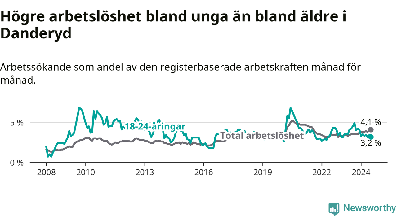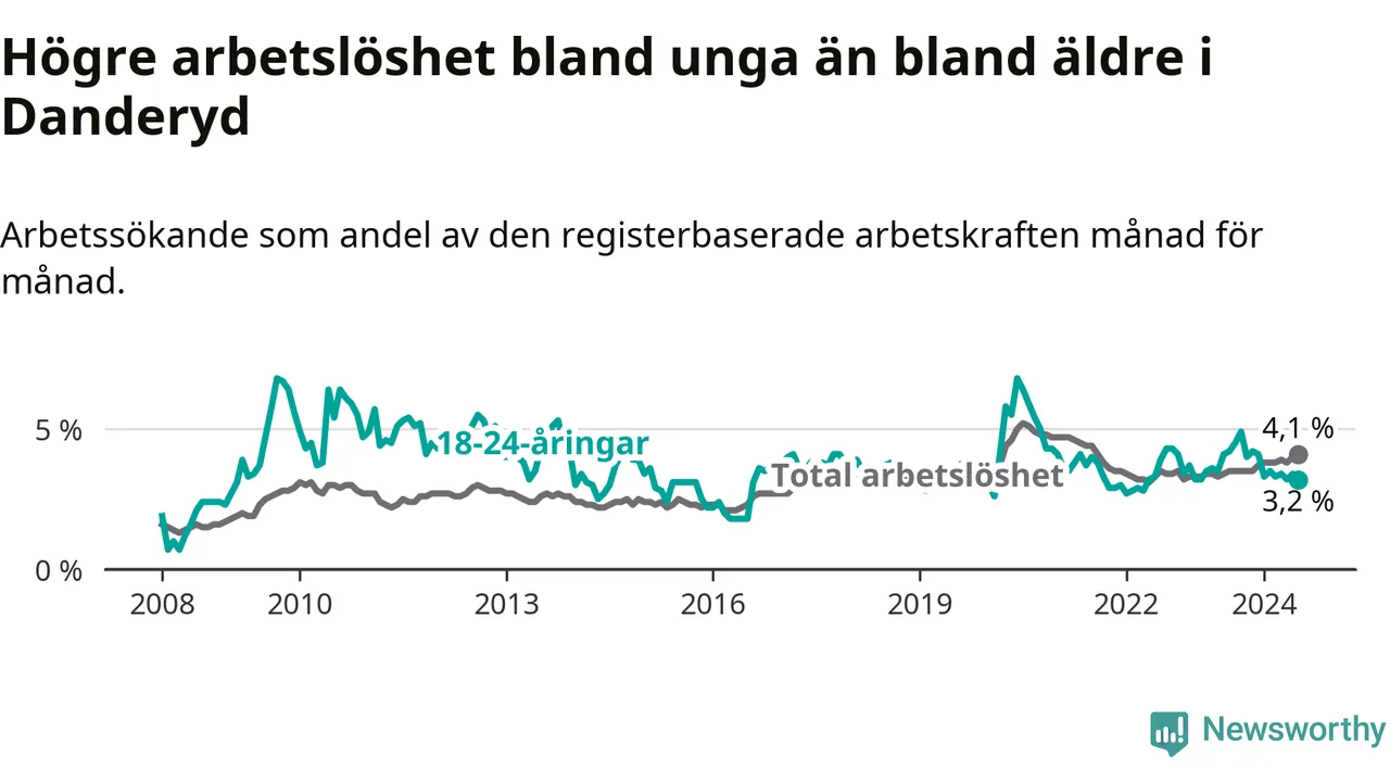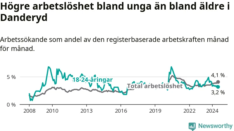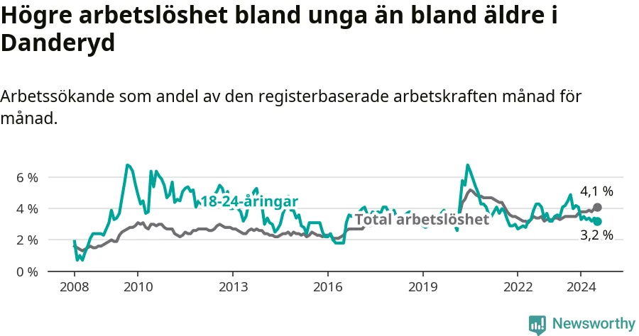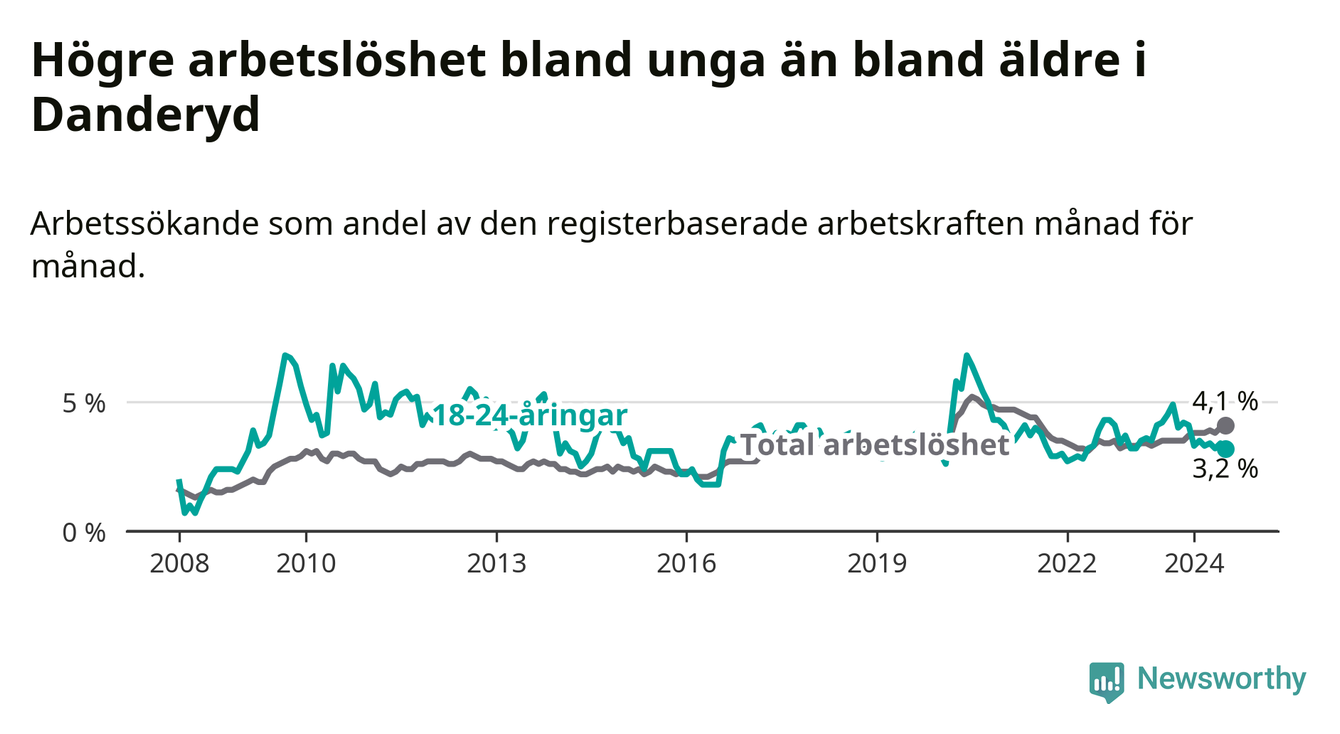 Till skillnad från den totala arbetslösheten sjunker arbetslösheten bland unga (−1 procentenheter). I juli var 3,2 procent av 18–24-åringarna inskrivna som arbetssökande (motsvarande 47 personer). Mäter vi antalet inskrivna ser vi en minskning med sex personer på ett års sikt.