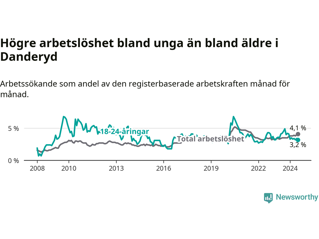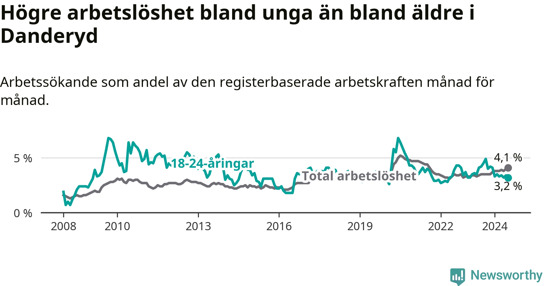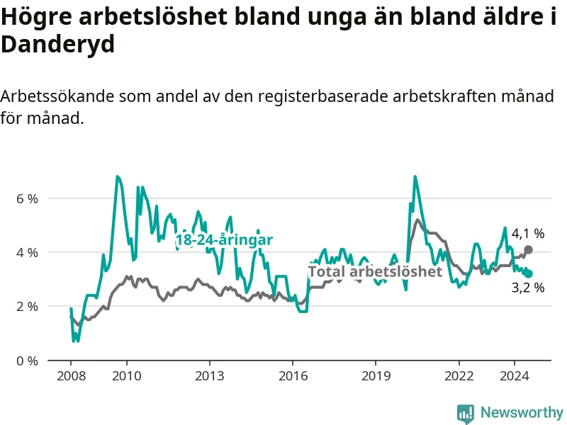 Till skillnad från den totala arbetslösheten sjunker arbetslösheten bland unga (−1 procentenheter). I juli var 3,2 procent av 18–24-åringarna inskrivna som arbetssökande (motsvarande 47 personer). Mäter vi antalet inskrivna ser vi en minskning med sex personer på ett års sikt.