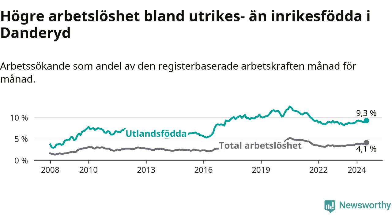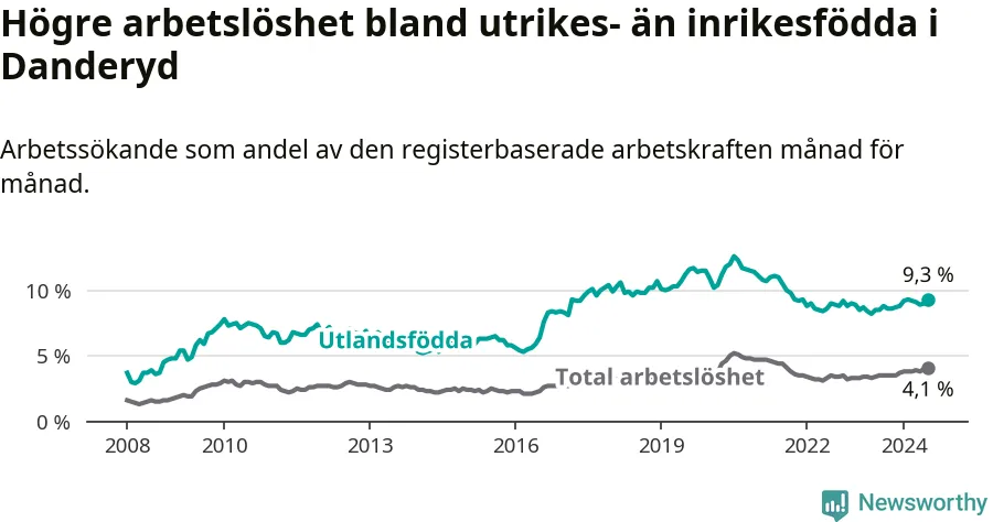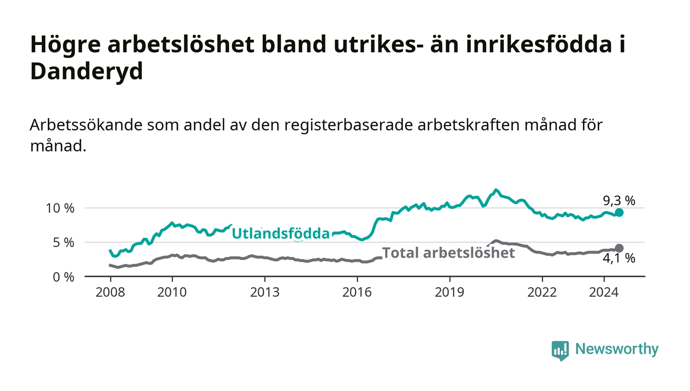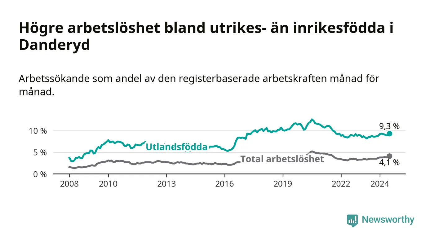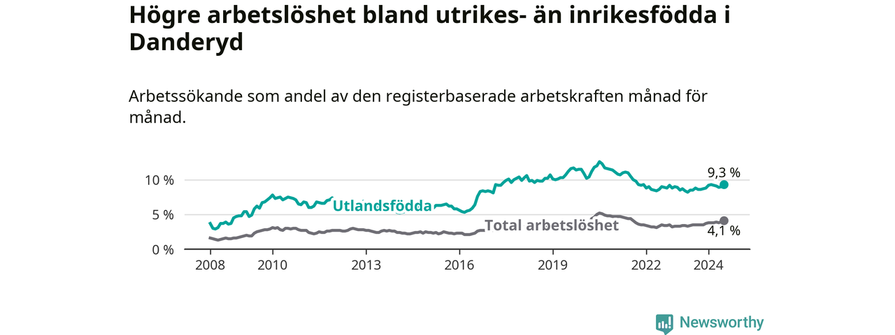 Arbetslösheten bland utlandsfödda var 9,3 procent i Danderyd under juli månad, motsvarande 263 av 2 828 personer. Det är 0,8 procentenheter fler än vid samma tidpunkt i fjol (−253 om man räknar personer). Därmed är de utlandsföddas arbetslöshet högre än vid samma tidpunkt i fjol för sjunde månaden i följd.