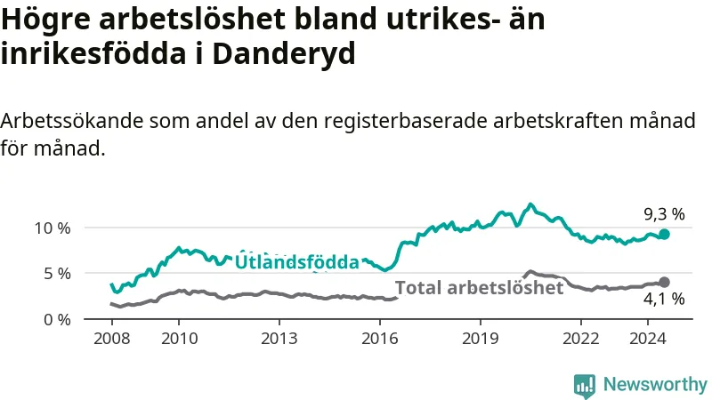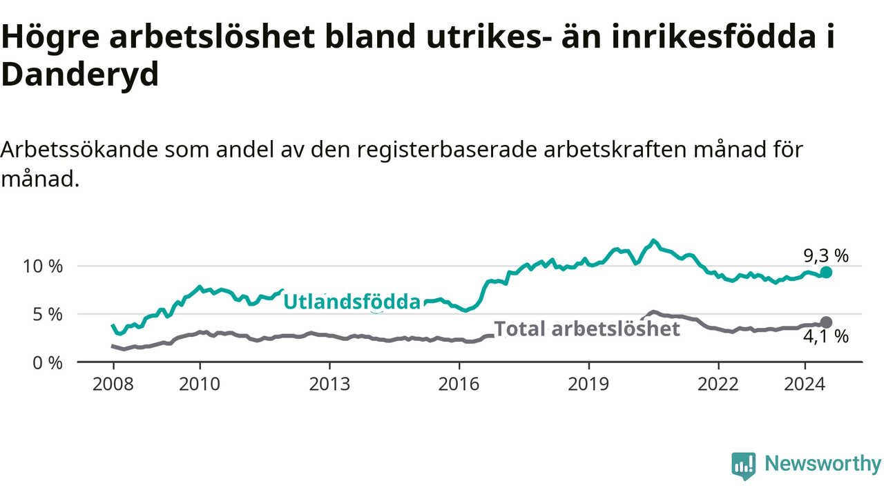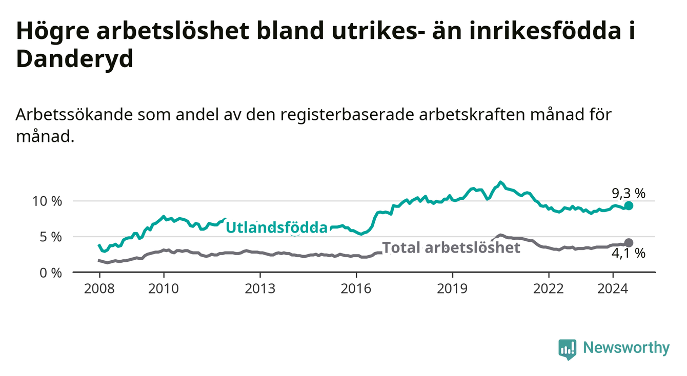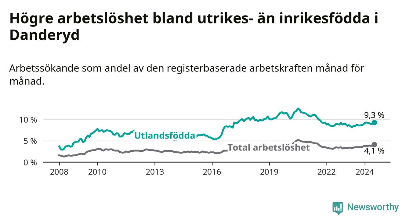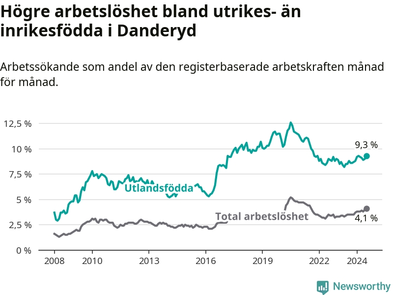 Arbetslösheten bland utlandsfödda var 9,3 procent i Danderyd under juli månad, motsvarande 263 av 2 828 personer. Det är 0,8 procentenheter fler än vid samma tidpunkt i fjol (−253 om man räknar personer). Därmed är de utlandsföddas arbetslöshet högre än vid samma tidpunkt i fjol för sjunde månaden i följd.
