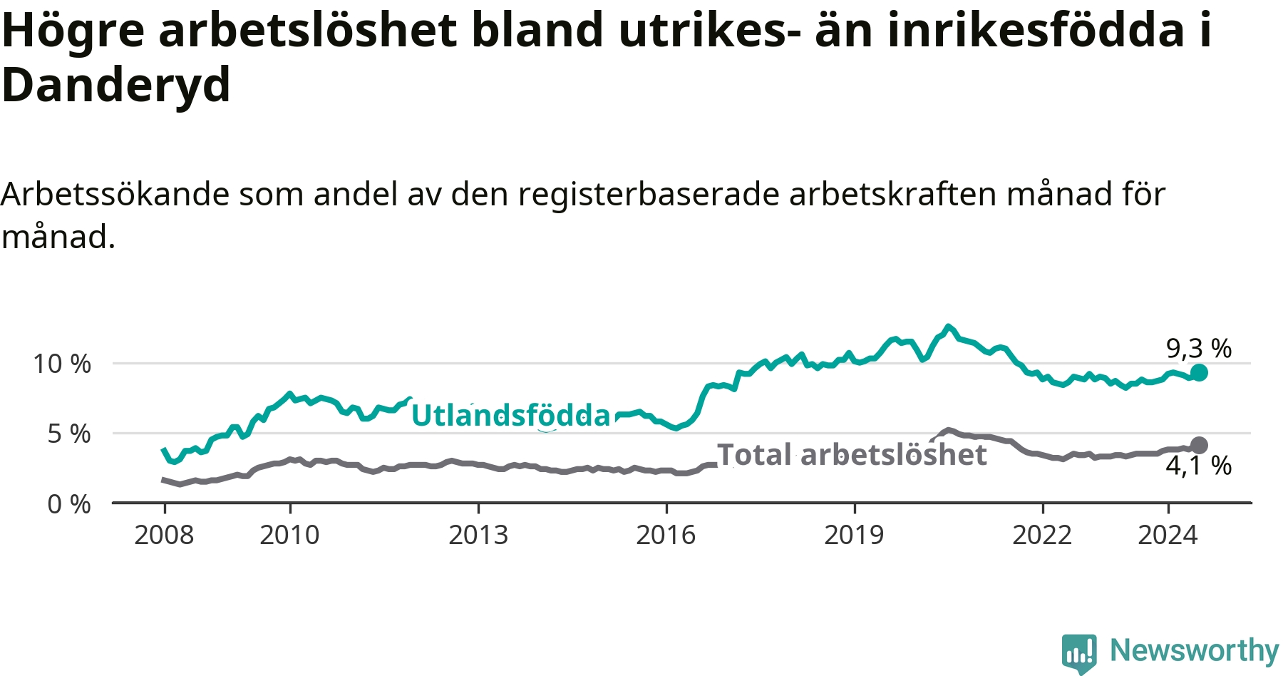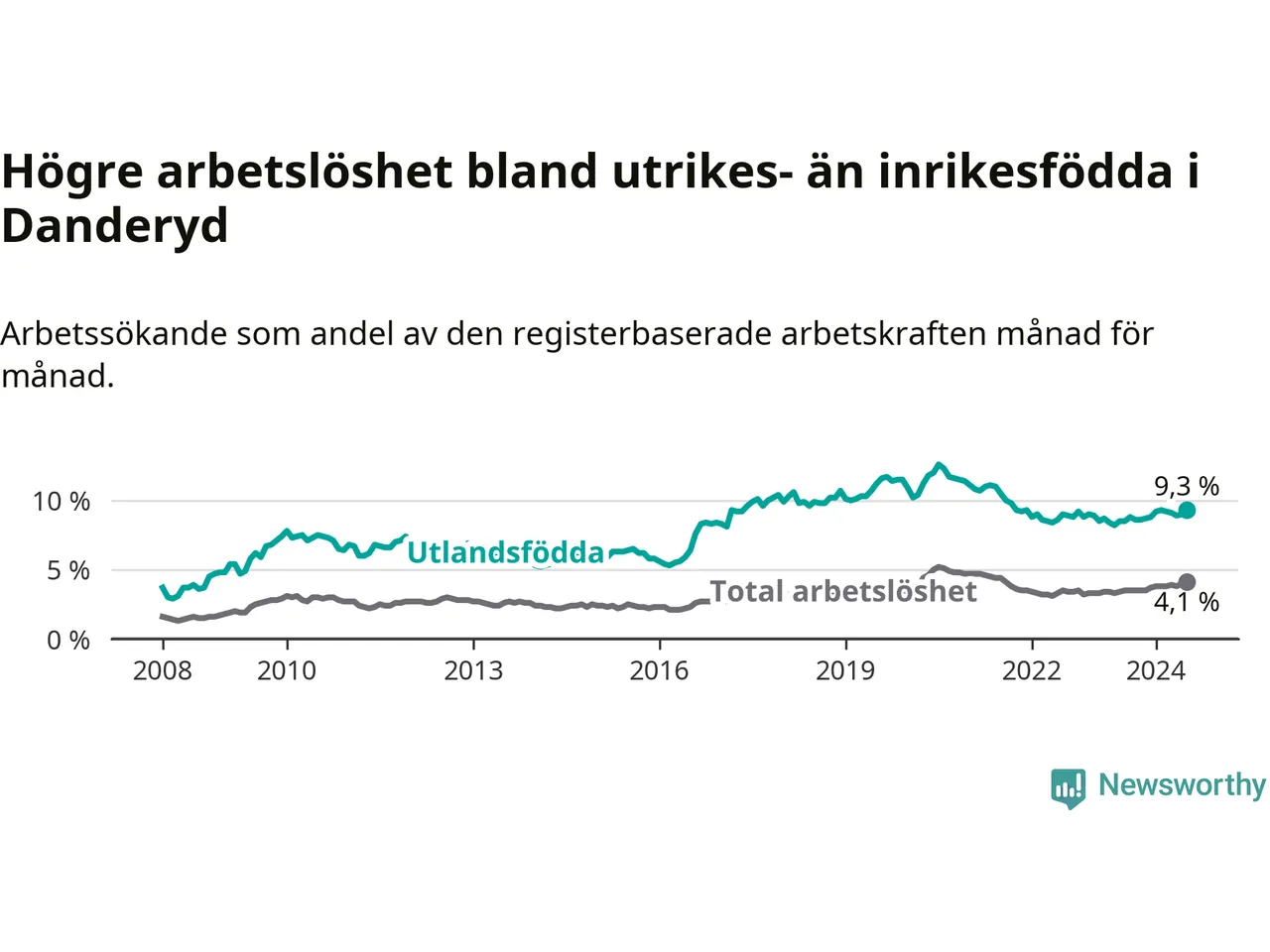 | Bland utlandsfödda | 9,3 % | +0,8 % ▲ | 12,7 % | +0,6 % ▲ | 15,0 % | −0,1 % ▼ |