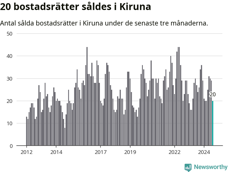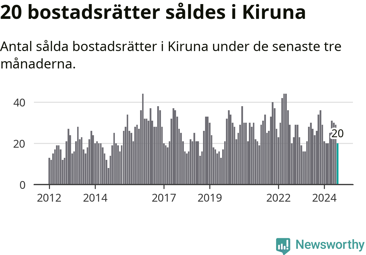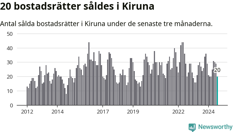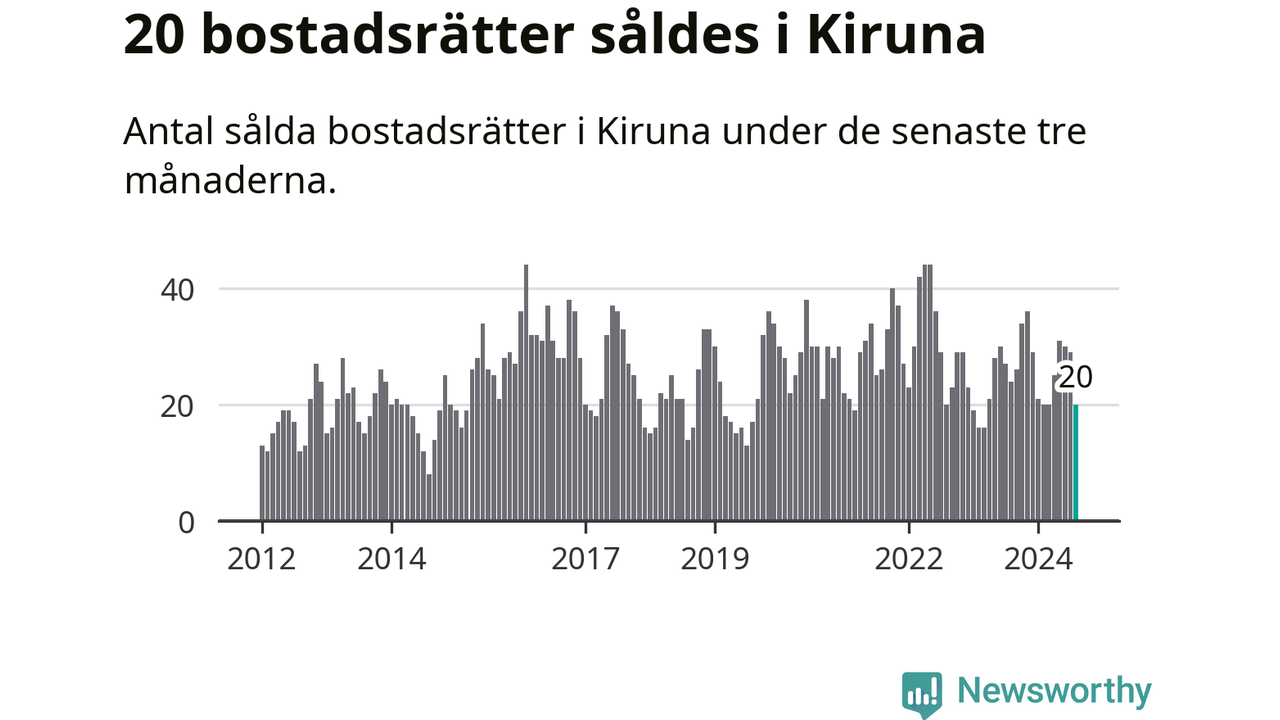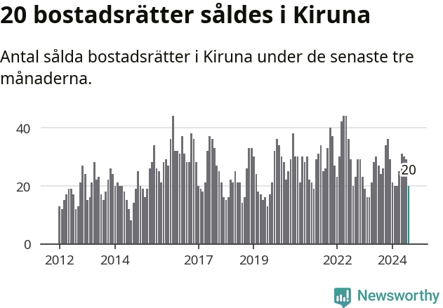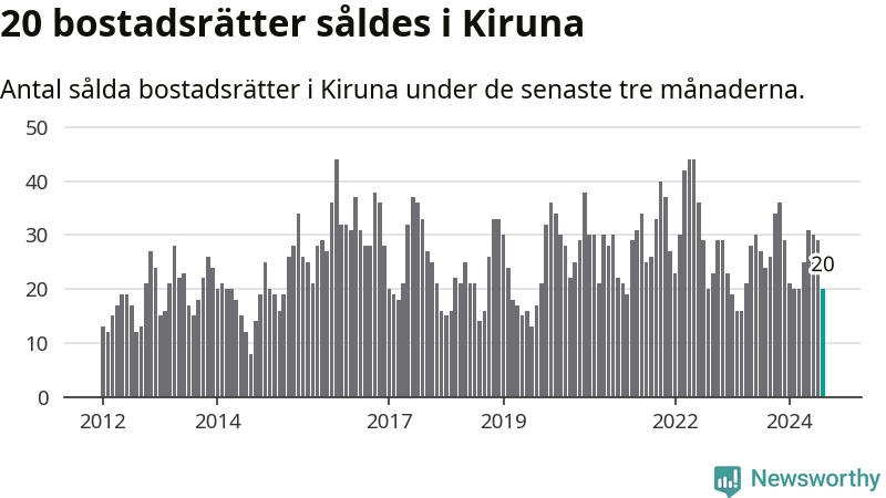 Mellan juni och augusti gjordes sammanlagt 20 affärer med bostadsrätter i Kiruna kommun. Det kan jämföras med 24 vid motsvarande tid i fjol.