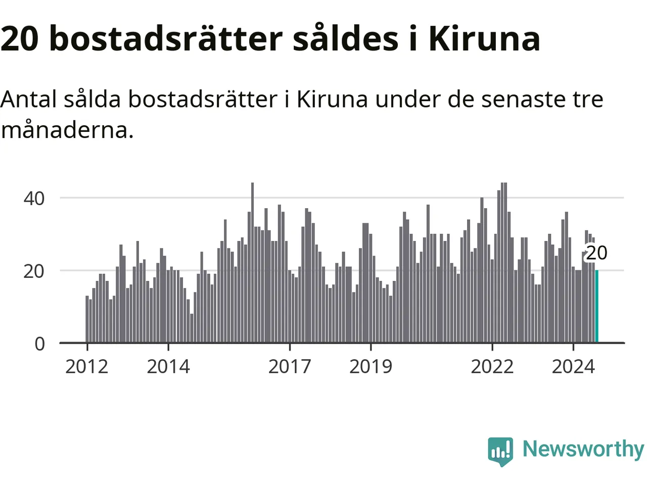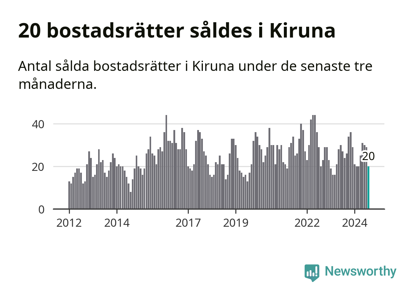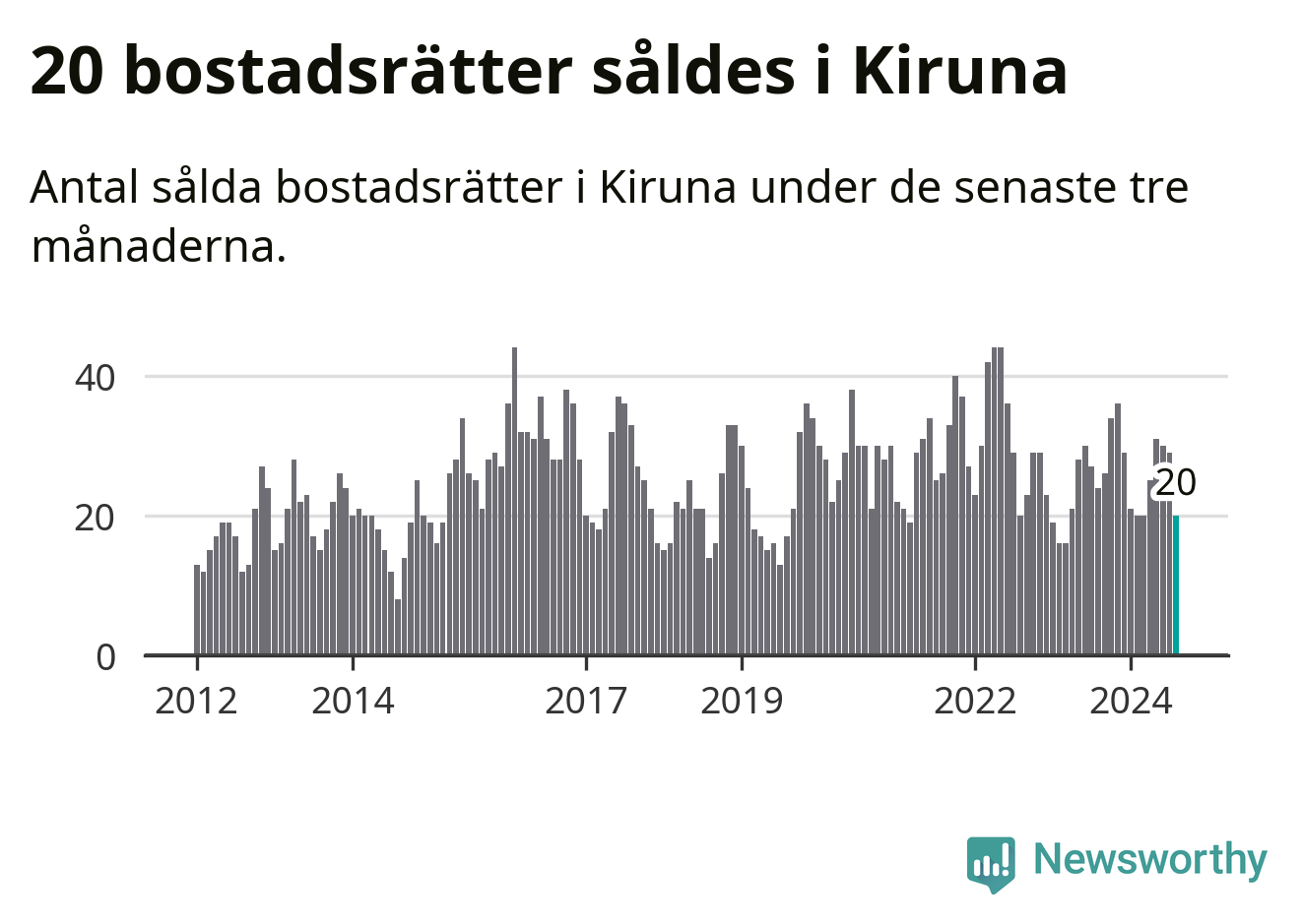 Mellan juni och augusti gjordes sammanlagt 20 affärer med bostadsrätter i Kiruna kommun. Det kan jämföras med 24 vid motsvarande tid i fjol.